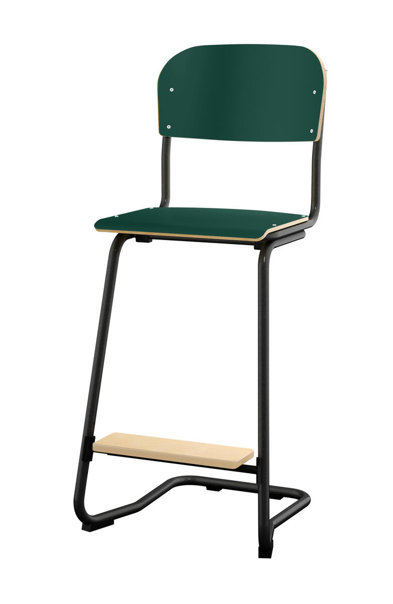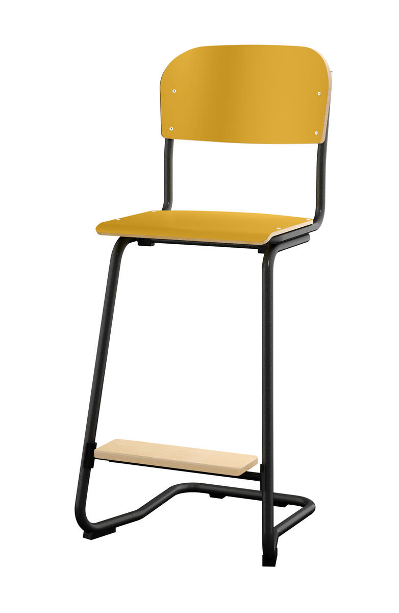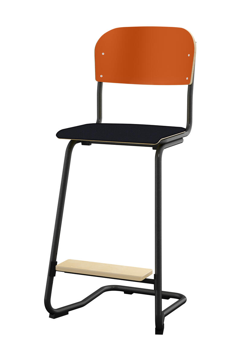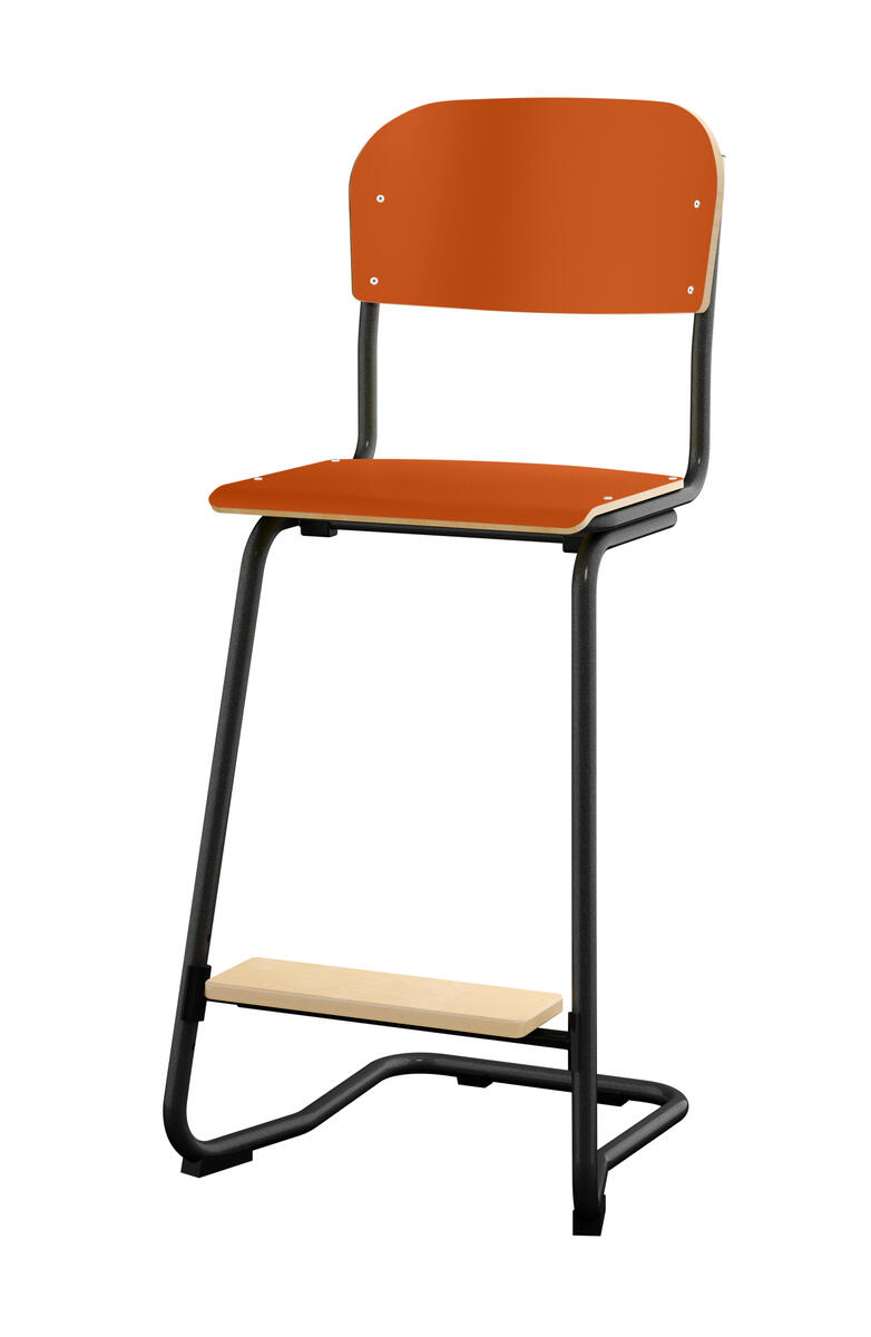 Stapelbar (max 4 st/stapel). Ljuddämpande tassar. Upphängningsbar på bord. Reglerbar fotbräda i 3 fasta lägen. Sitthöjd: 63 cm. Sitsmått: B42xD39 cm. Totaldjupet på stativet är 54 cm. Vikt 7,4 kg. Sits och rygg i högtryckslaminat. Svart stativ RAL 9005.