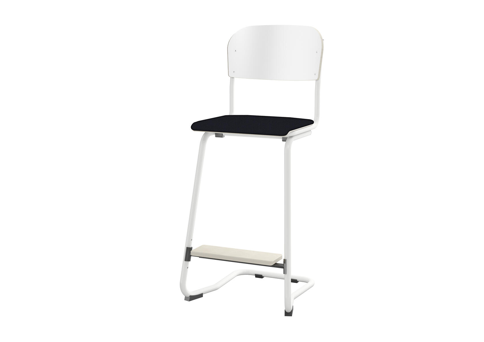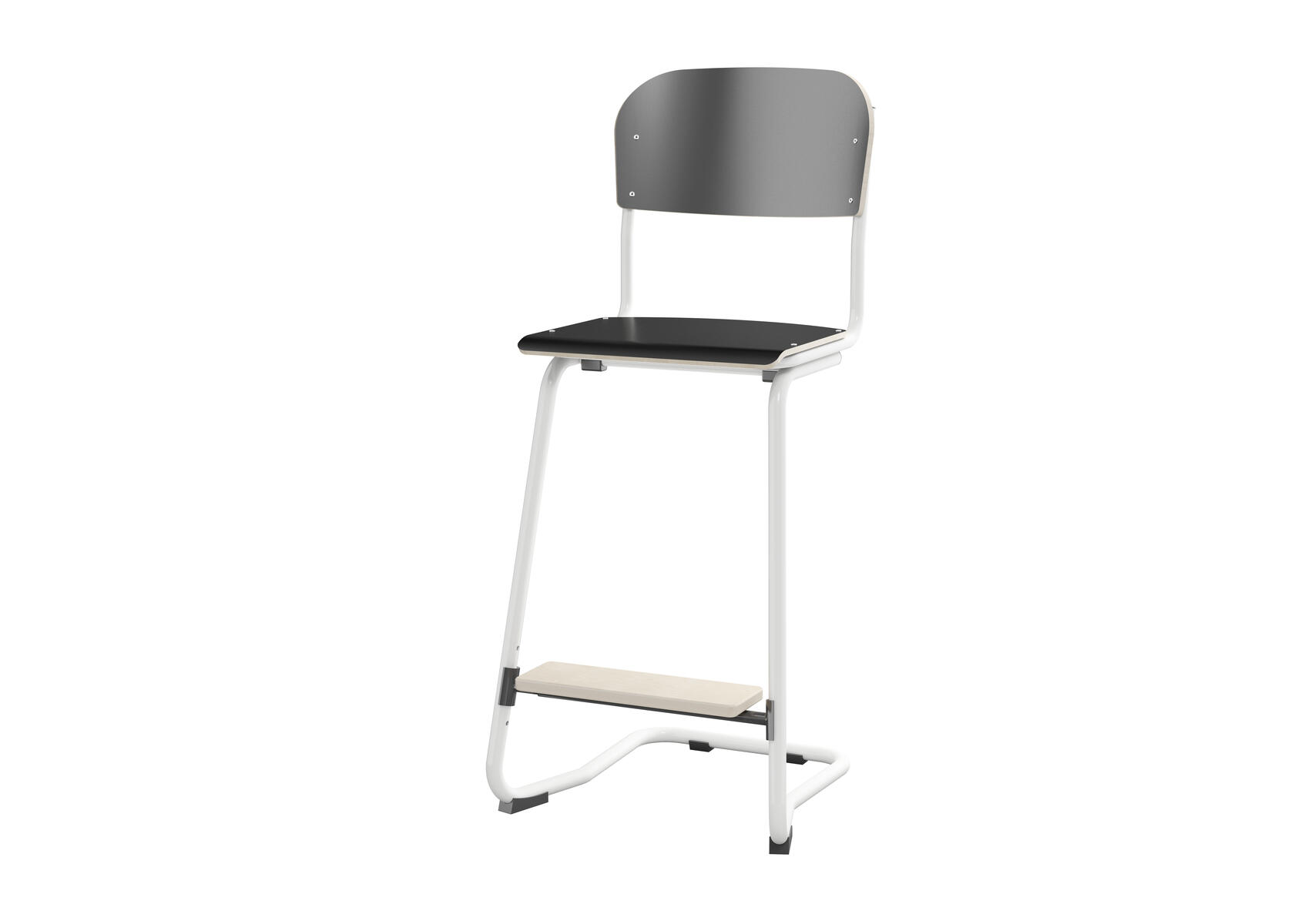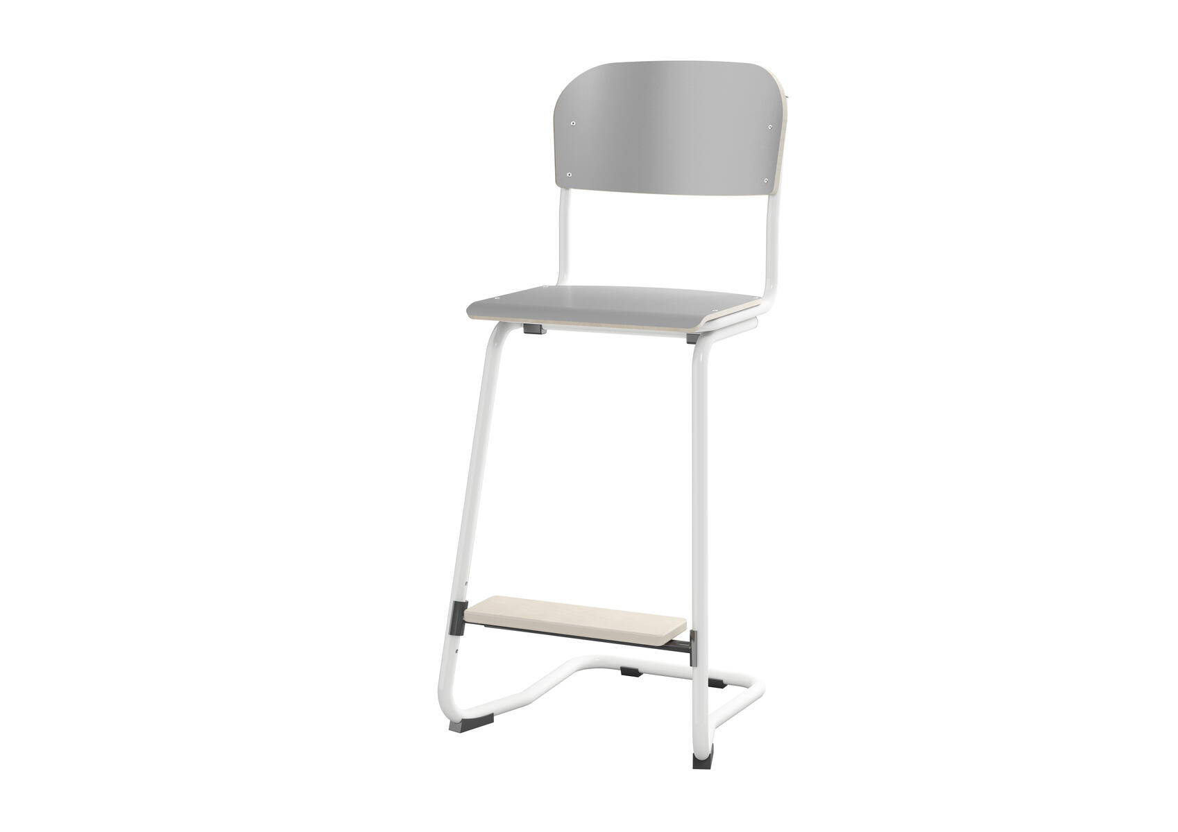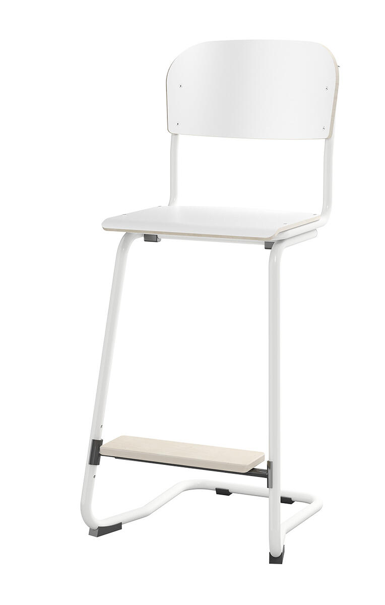 Stapelbar. Ljuddämpande tassar. Reglerbart fotstöd. Sitthöjd: 65 cm. Sitsmått: B42xD39 cm. Vikt 5,3 kg. Sits och rygg i högtryckslaminat. Vitlackerat stativ RAL 9003.