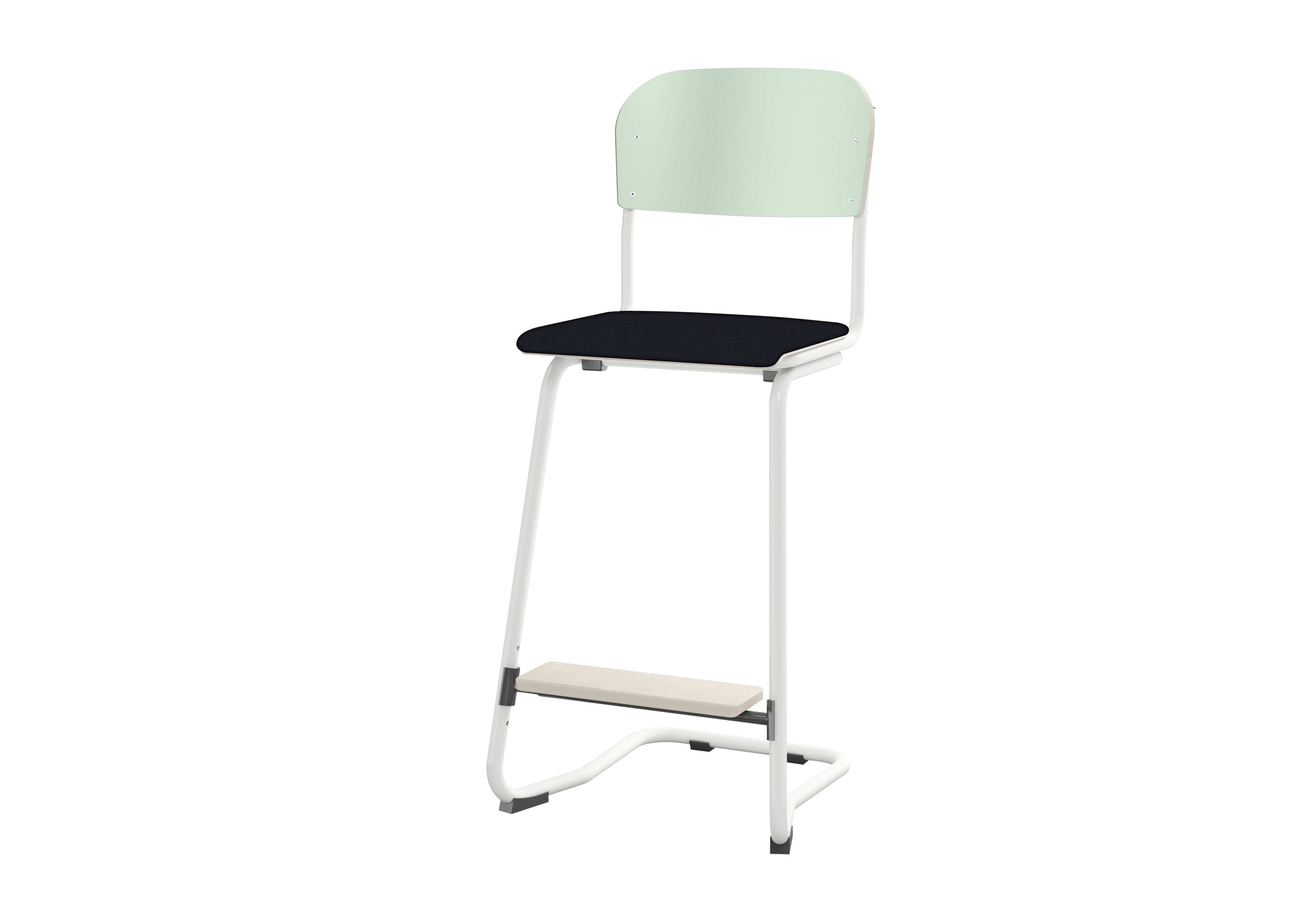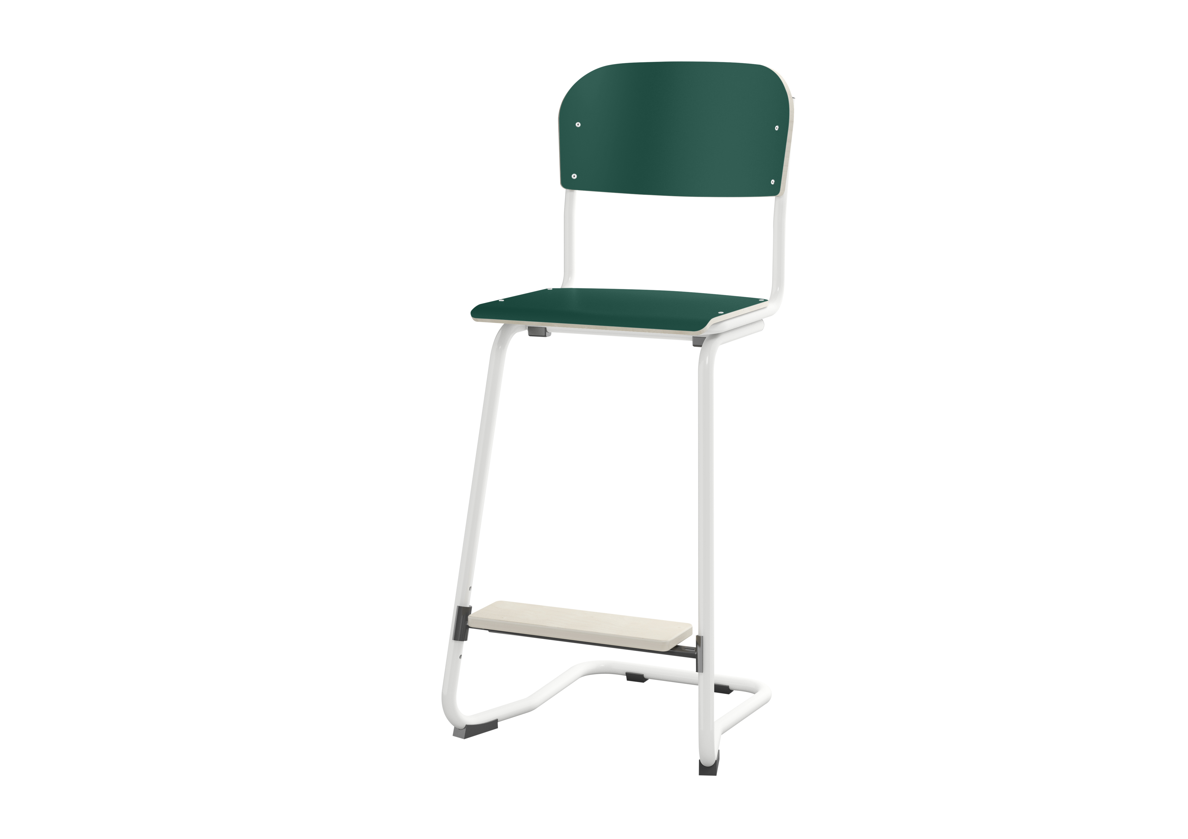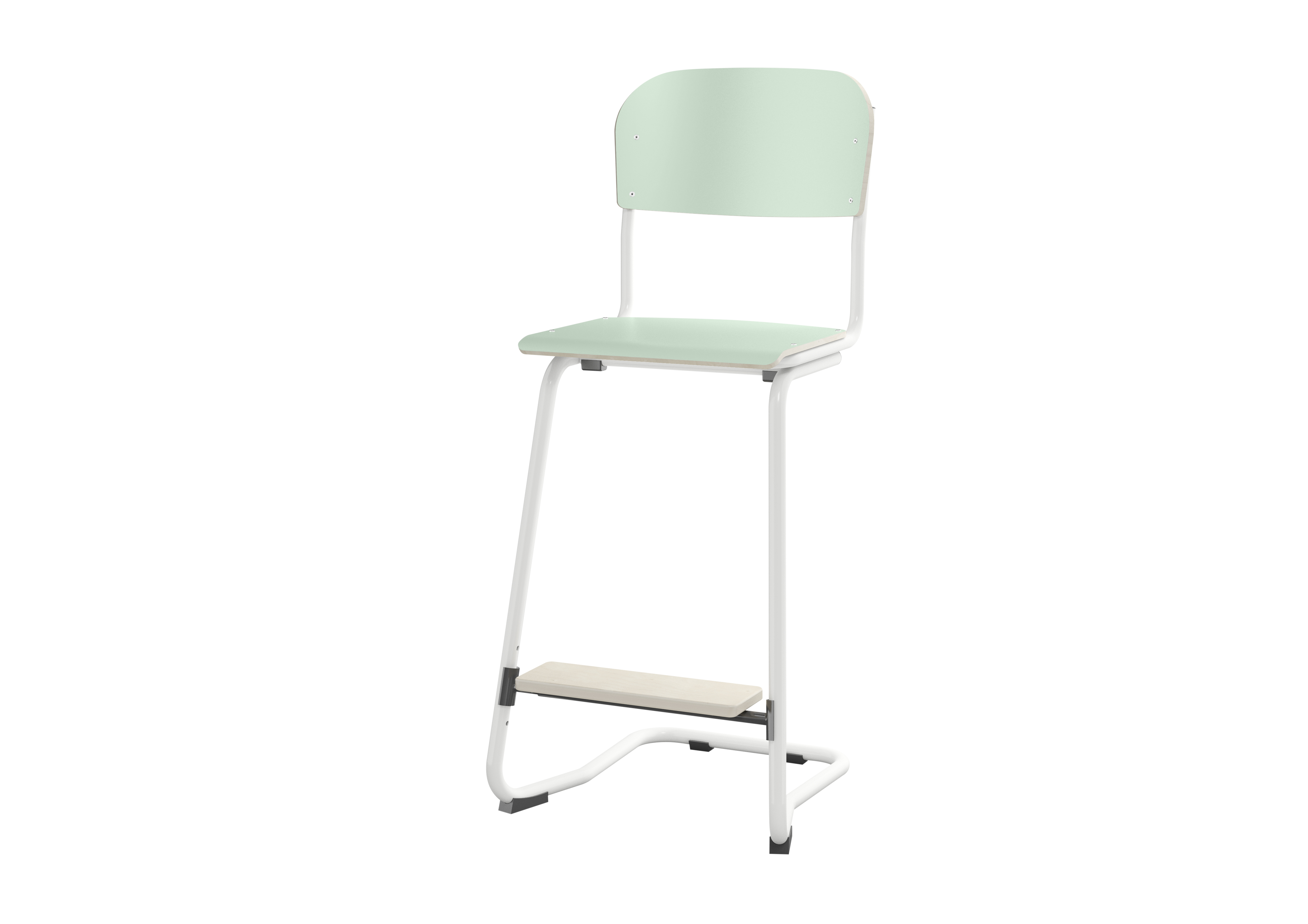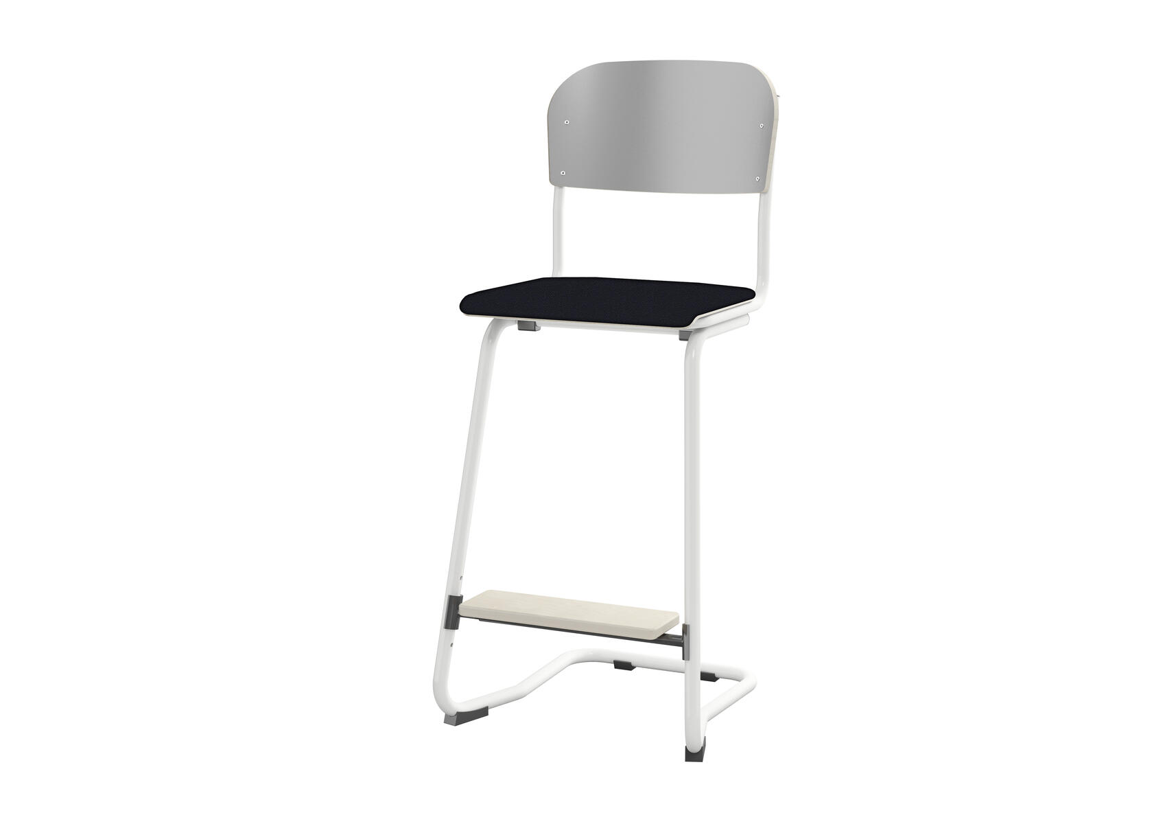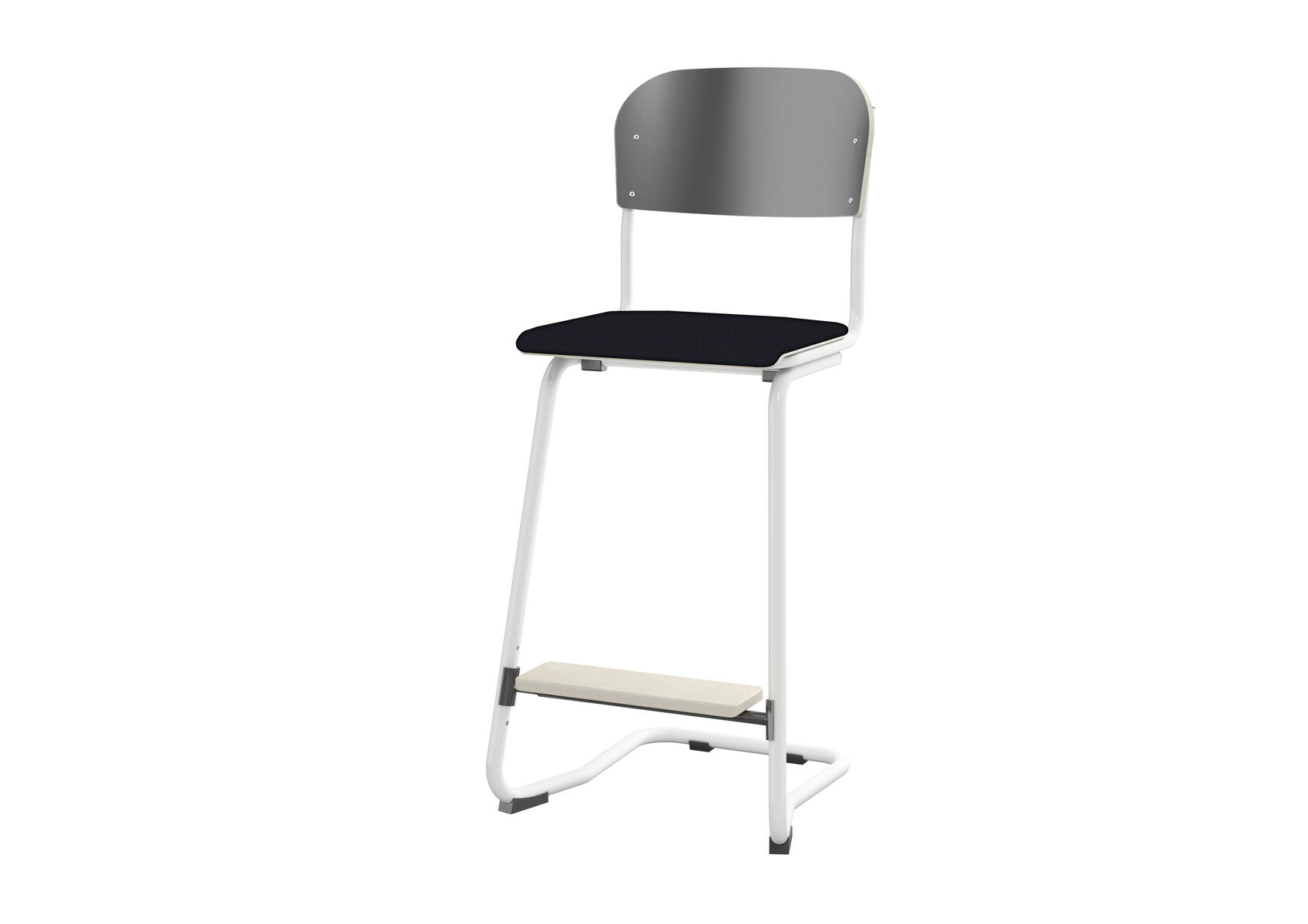 Stapelbar. Ljuddämpande tassar. Reglerbart fotstöd. Sitthöjd: 65 cm. Sitsmått: B42xD39 cm. Vikt 5,3 kg. Sits och rygg i högtryckslaminat. Vitlackerat stativ RAL 9003.