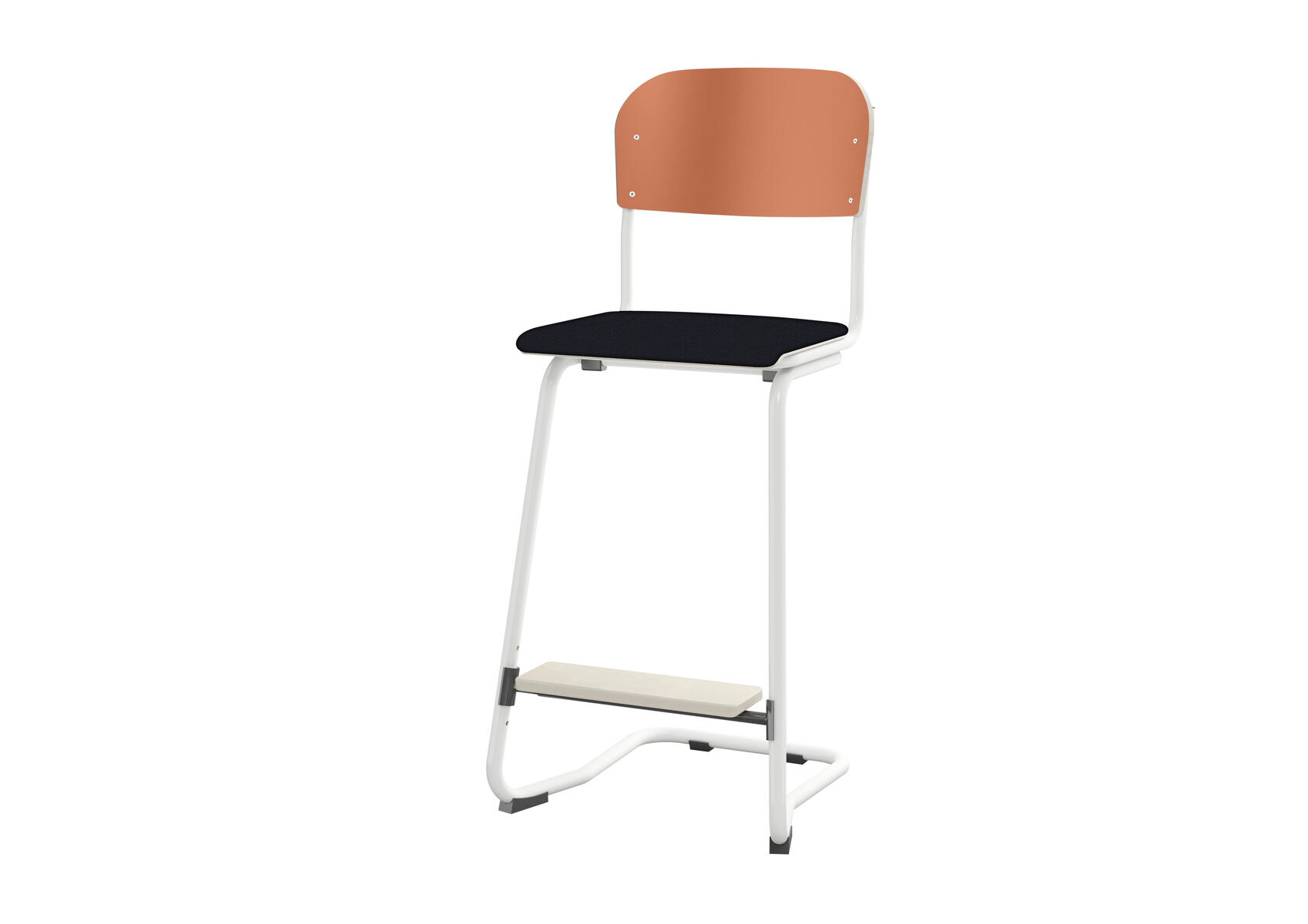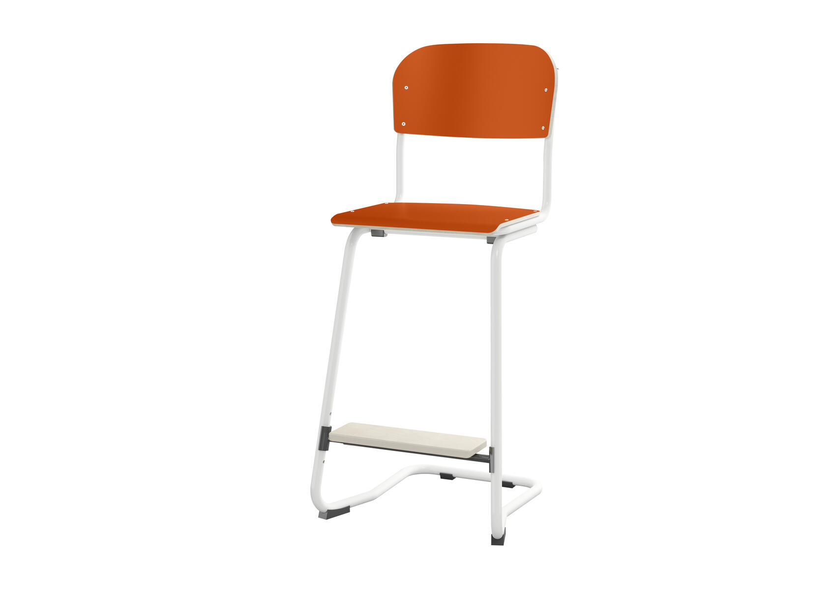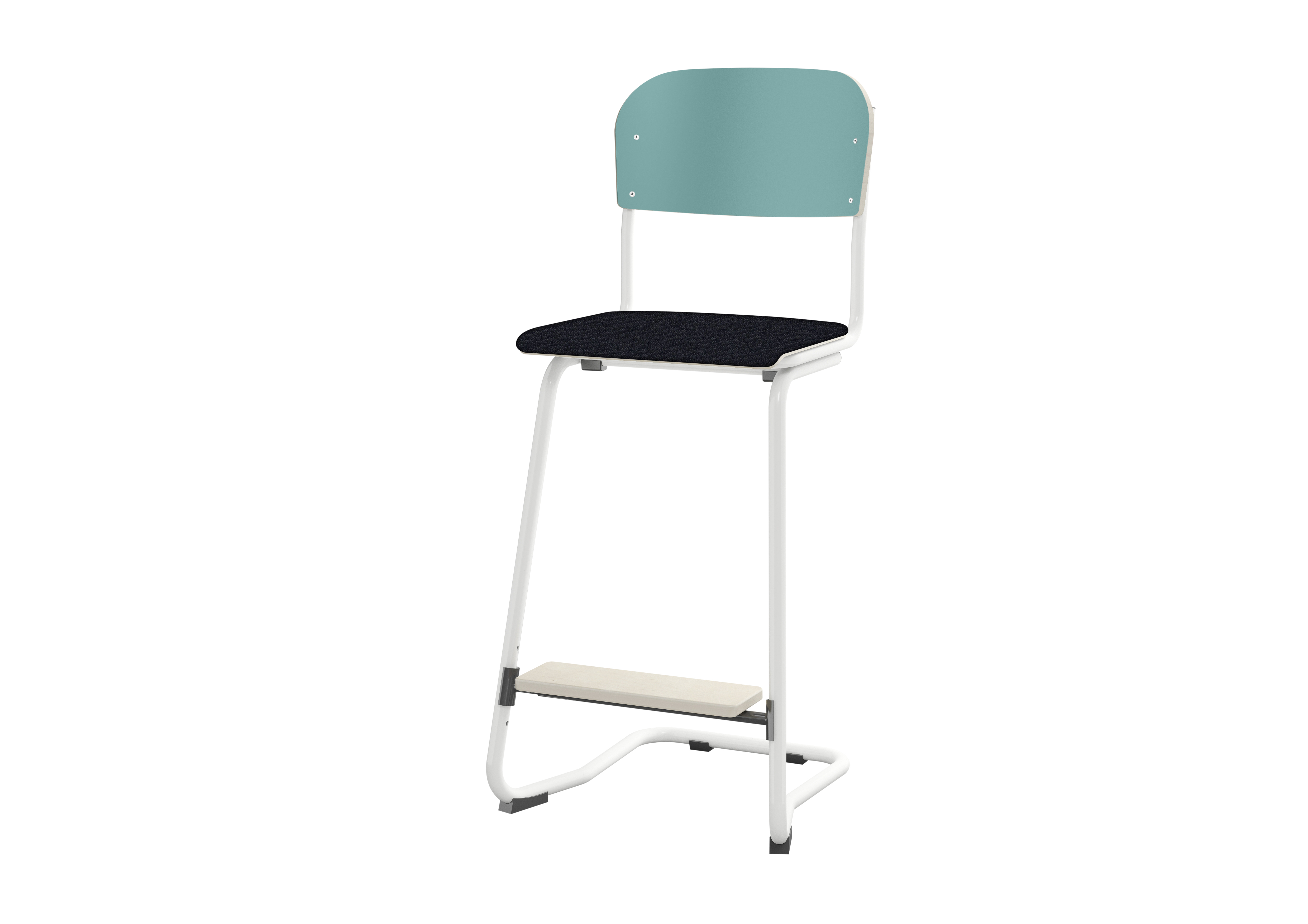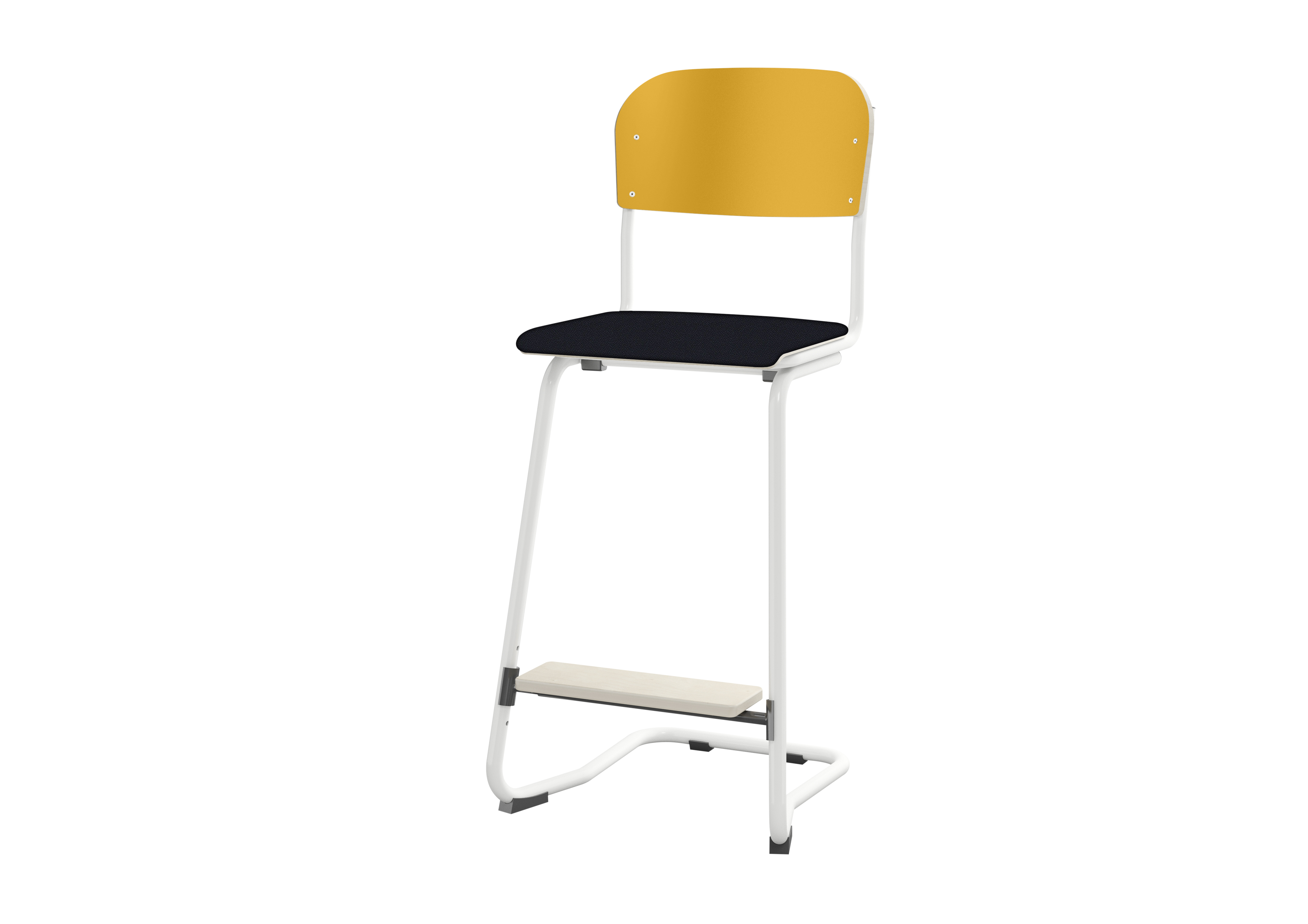Stapelbar. Ljuddämpande tassar. Reglerbart fotstöd. Sitthöjd: 65 cm. Sitsmått: B42xD39 cm. Vikt 5,3 kg. Sits och rygg i högtryckslaminat. Vitlackerat stativ RAL 9003.