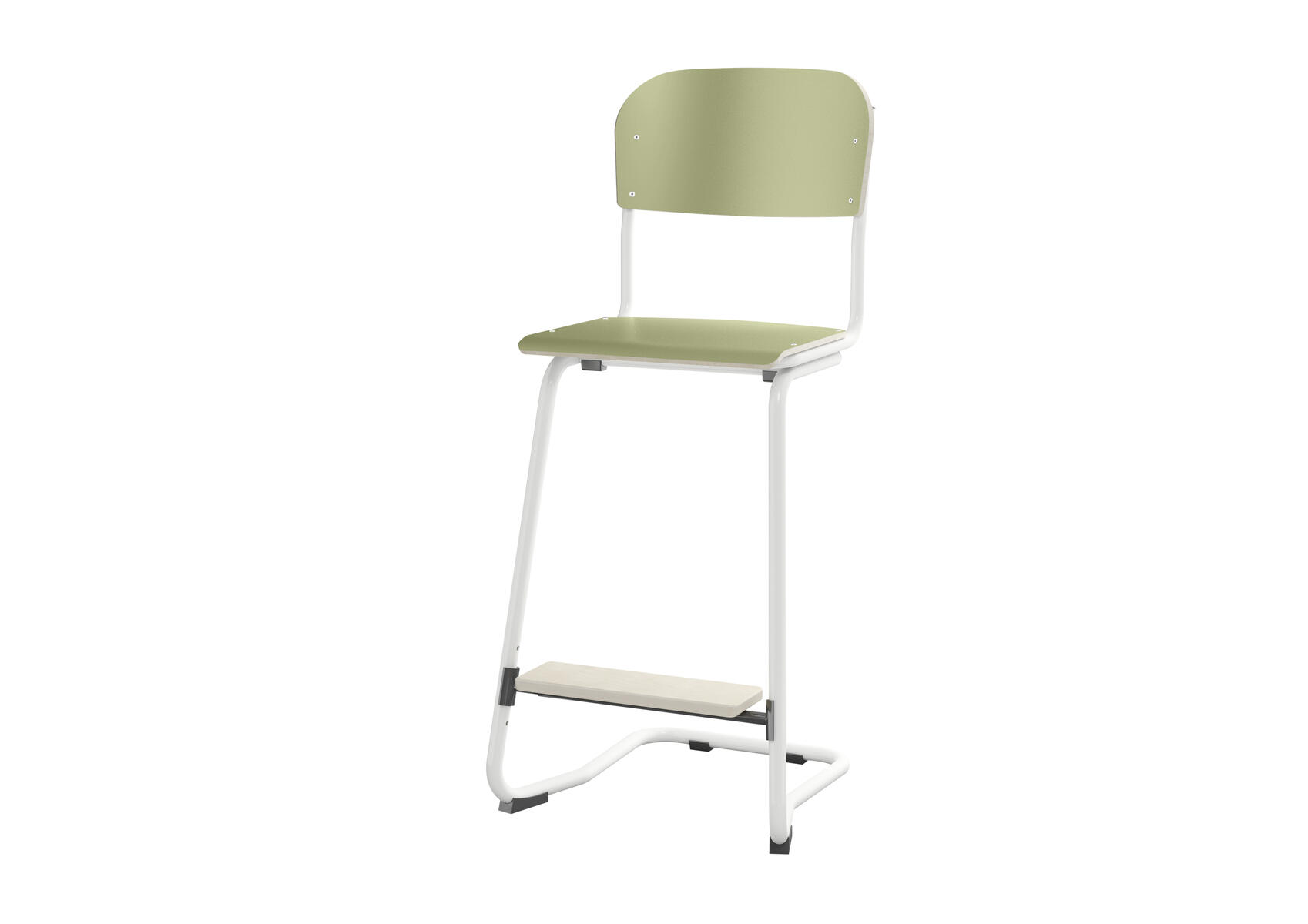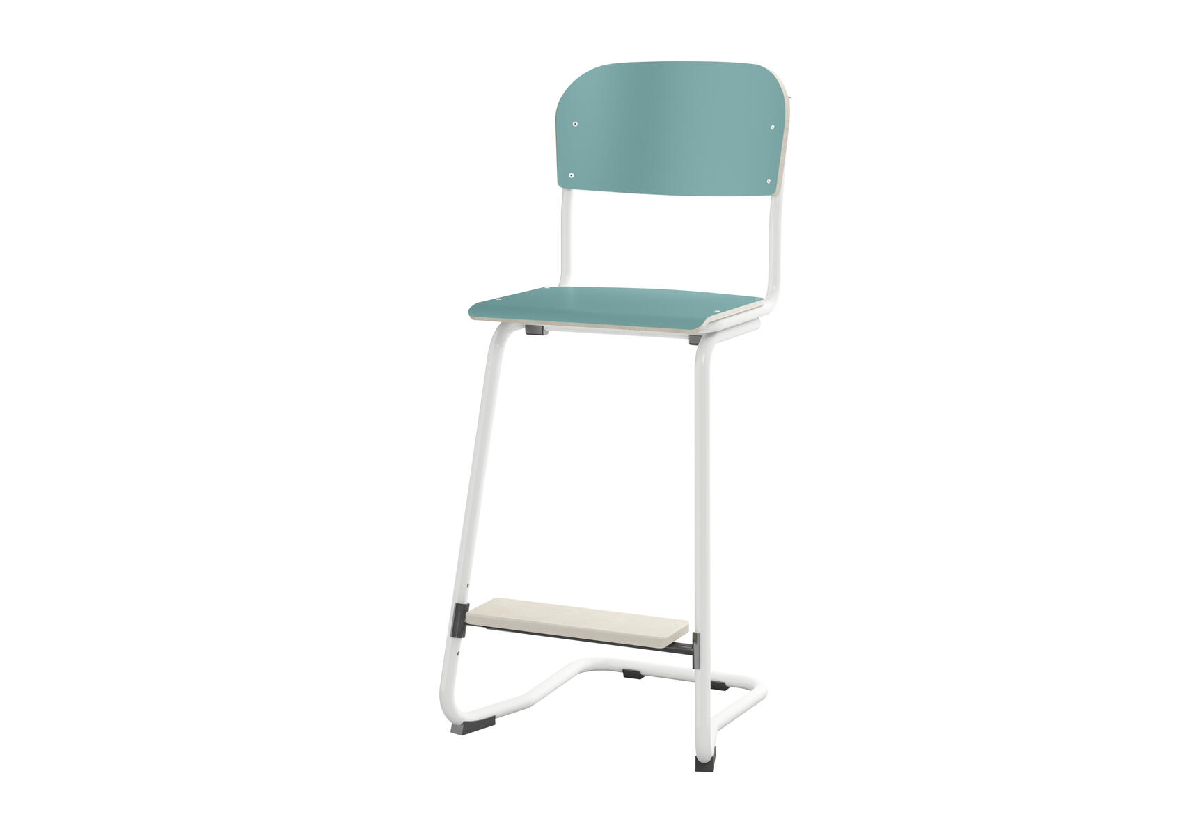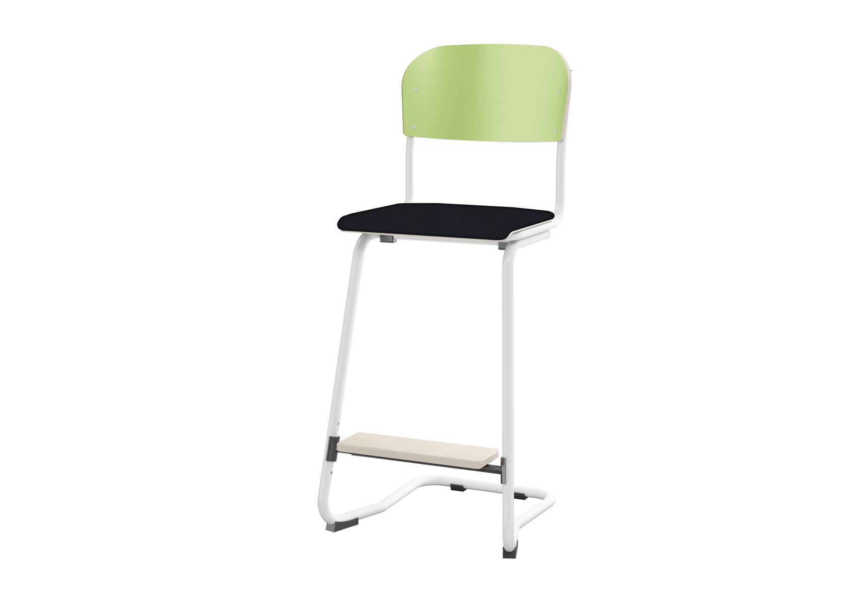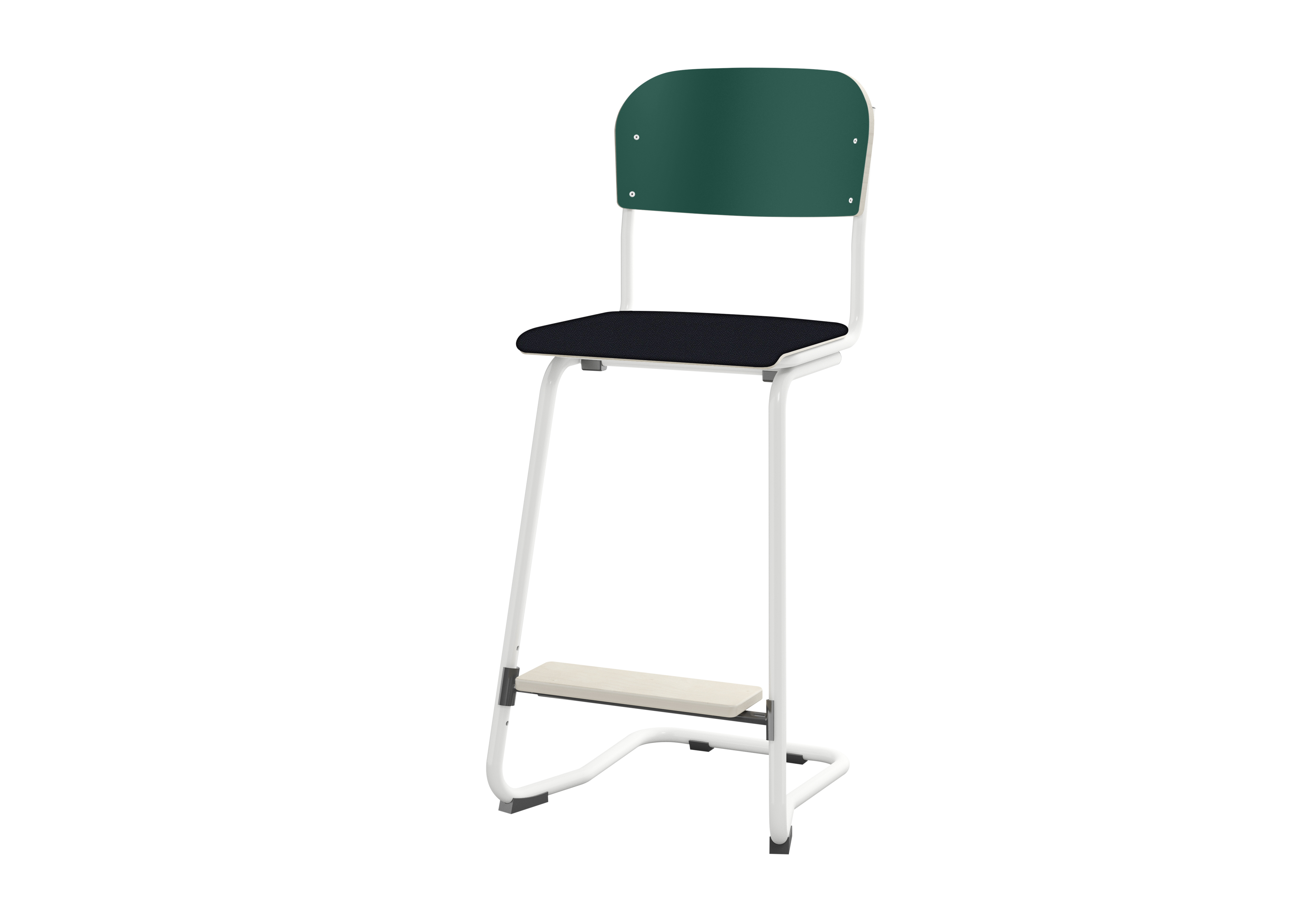 Stapelbar. Ljuddämpande tassar. Reglerbart fotstöd. Sitthöjd: 65 cm. Sitsmått: B42xD39 cm. Vikt 5,3 kg. Sits och rygg i högtryckslaminat. Vitlackerat stativ RAL 9003.