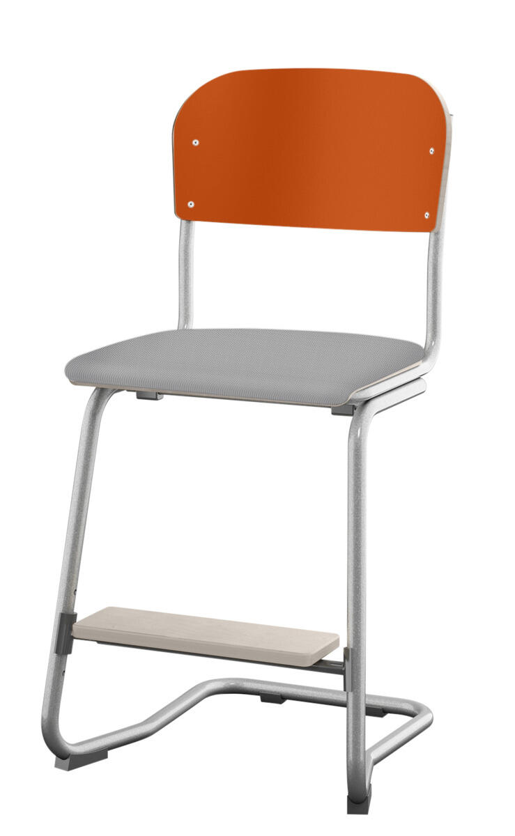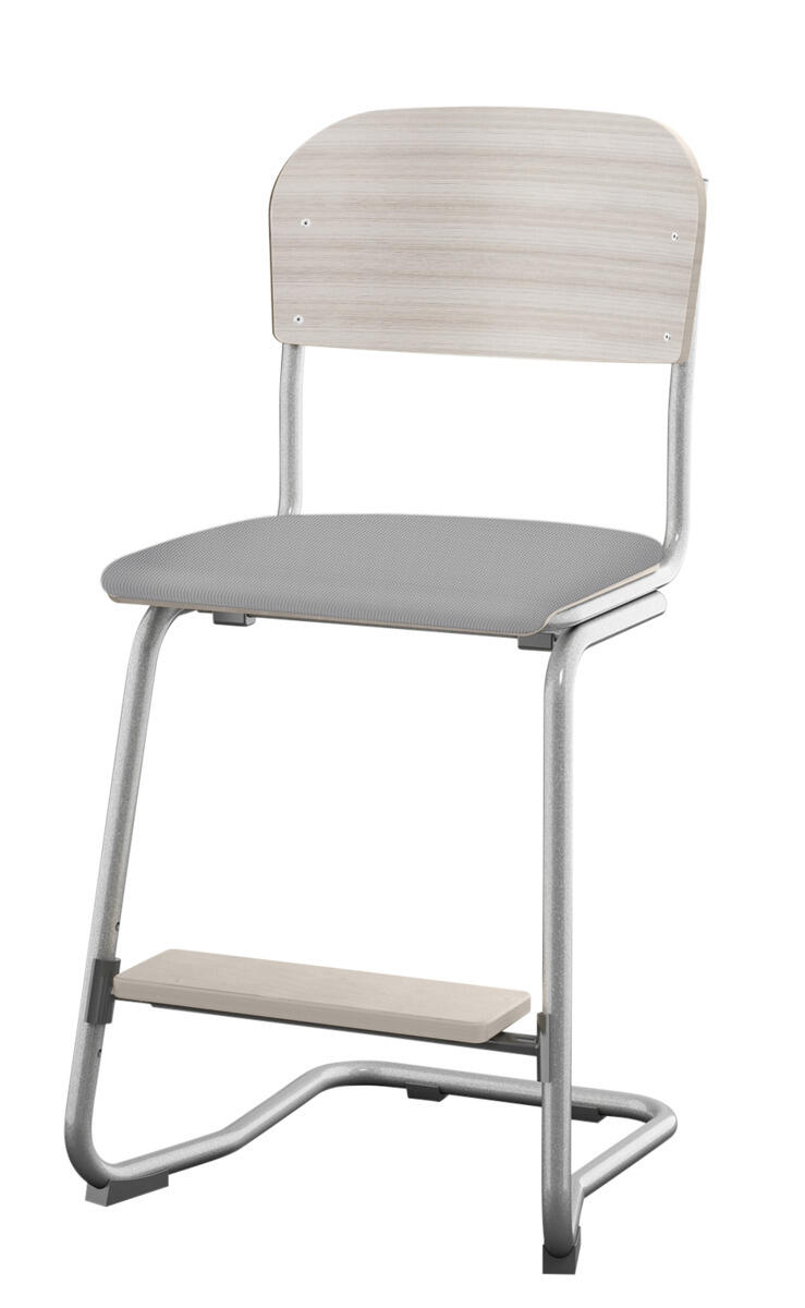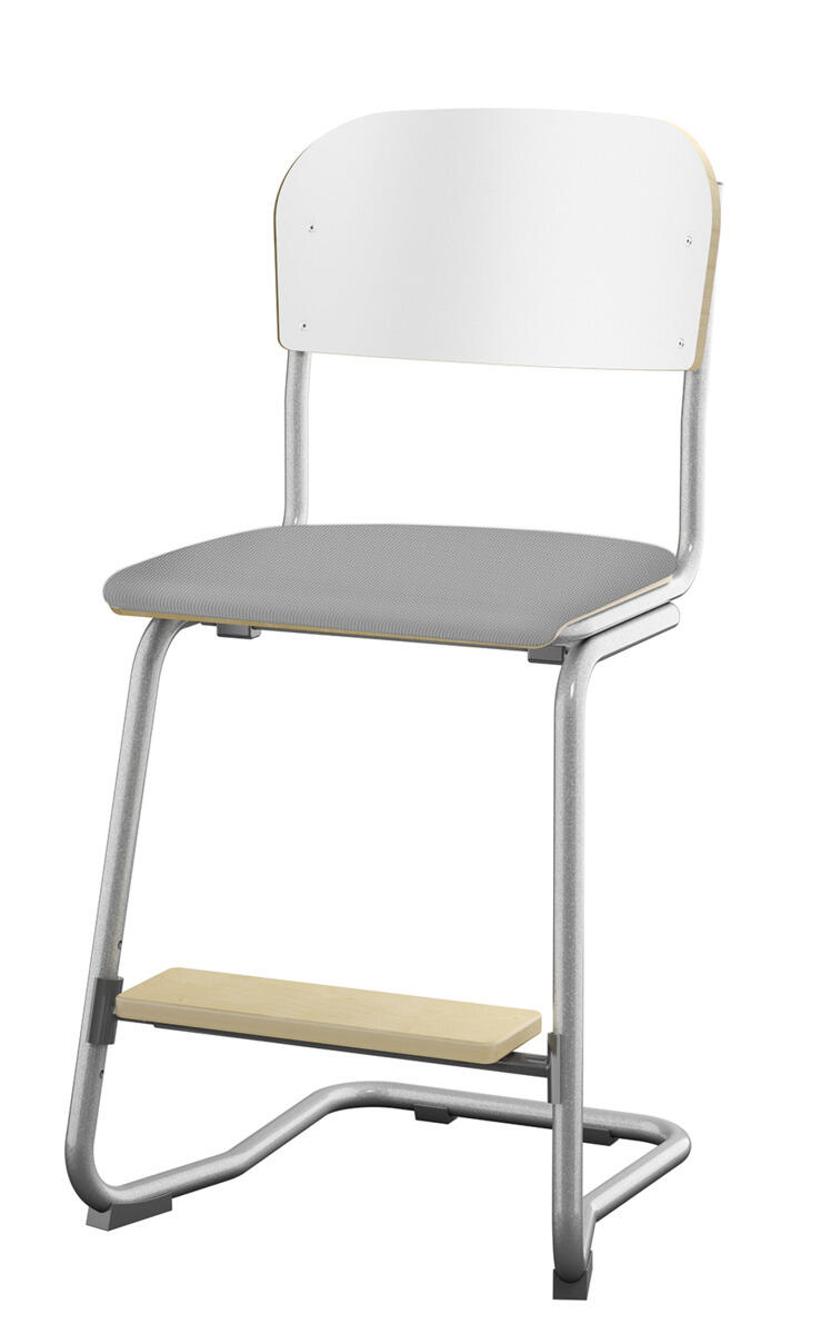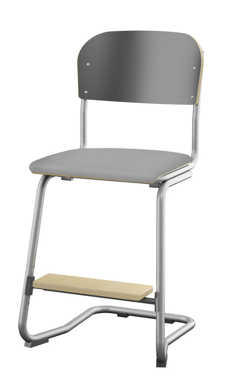 Stapelbar (max 4 st/stapel). Ljuddämpande tassar. Upphängningsbar på bord. Reglerbar fotbräda i 3 fasta lägen. Sitthöjd 50 cm. Sitsmått: B36xD35 cm. Totaldjupet på stativet är 54 cm. Vikt 4,6 kg. Sits och rygg i högtryckslaminat. Silverlackerat stativ, RAL 9006.