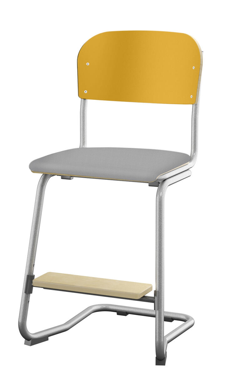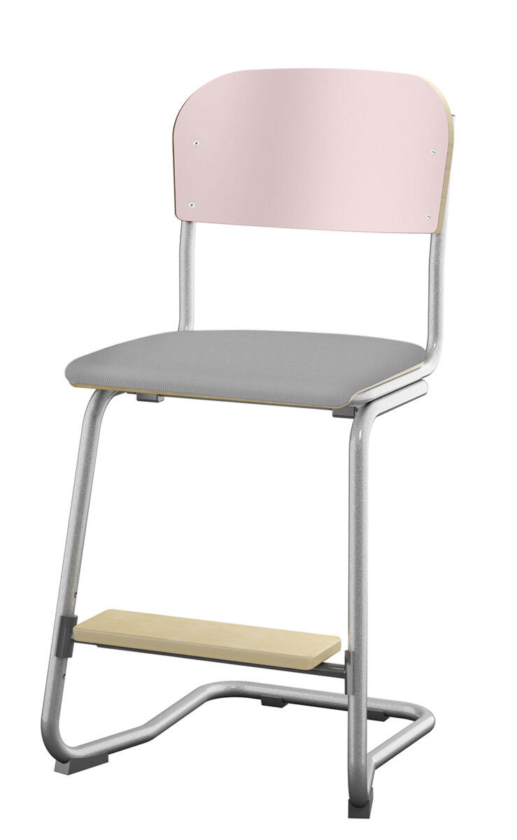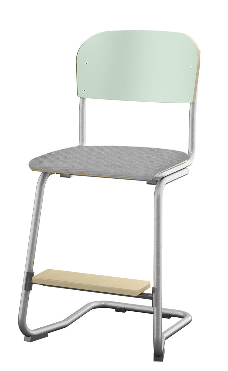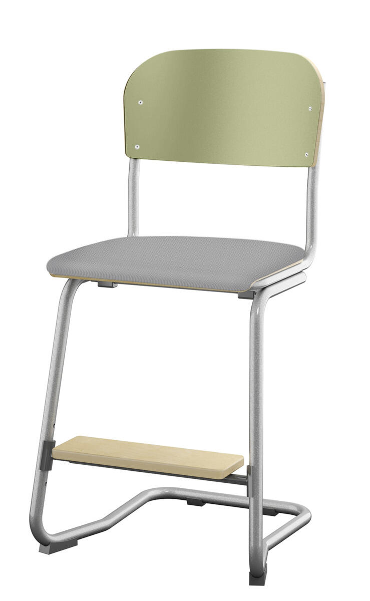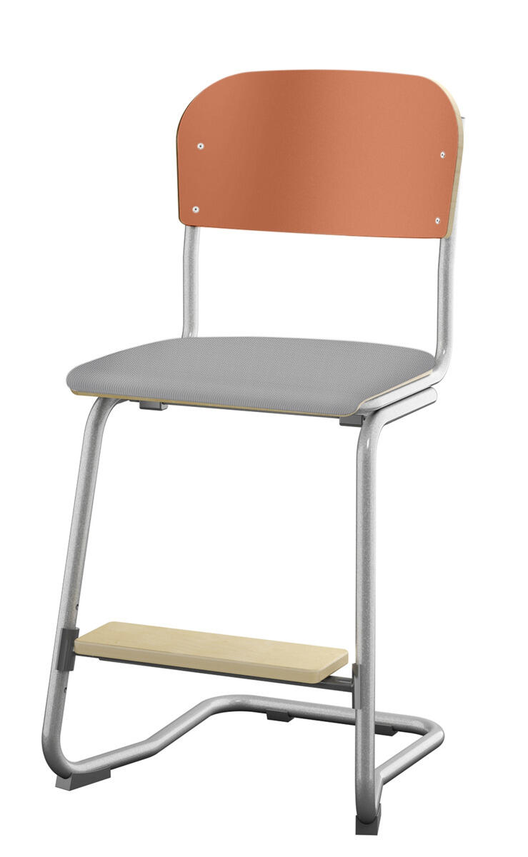 Stapelbar (max 4 st/stapel). Ljuddämpande tassar. Upphängningsbar på bord. Reglerbar fotbräda i 3 fasta lägen. Sitthöjd 50 cm. Sitsmått: B36xD35 cm. Totaldjupet på stativet är 54 cm. Vikt 4,6 kg. Sits och rygg i högtryckslaminat. Silverlackerat stativ, RAL 9006.