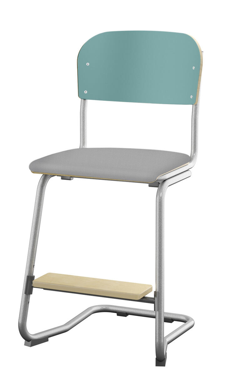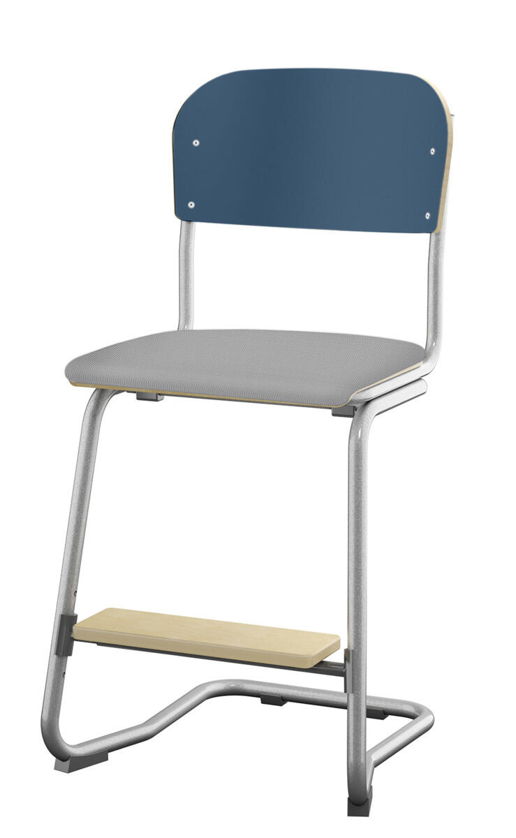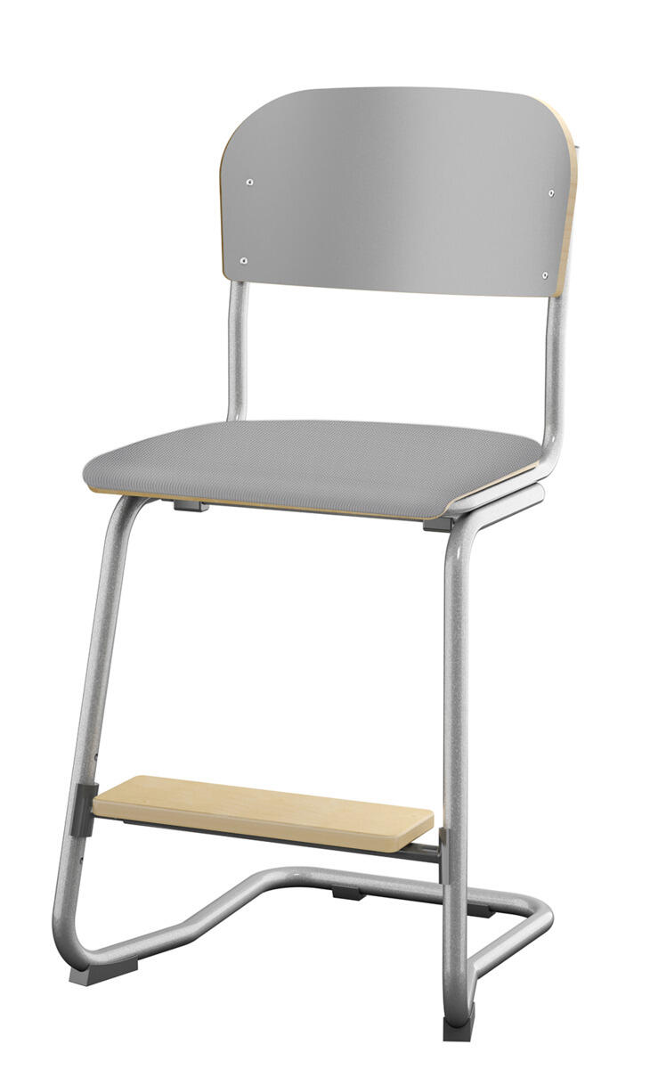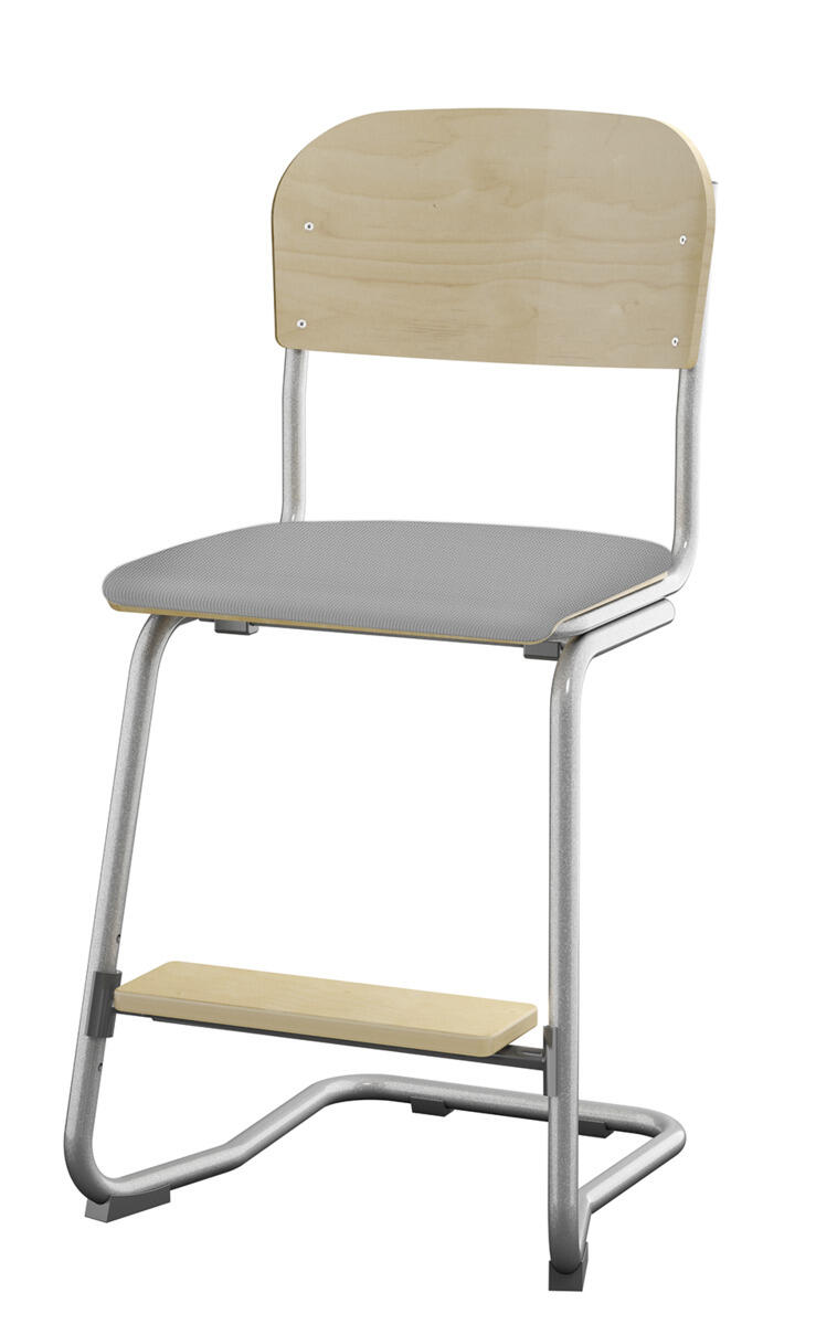 Stapelbar (max 4 st/stapel). Ljuddämpande tassar. Upphängningsbar på bord. Reglerbar fotbräda i 3 fasta lägen. Sitthöjd: 63 cm. Sitsmått: B36xD35 cm. Totaldjupet på stativet är 54 cm. Vikt 6,8 kg. Sits och rygg i högtryckslaminat. Silverlackerat stativ RAL 9006.