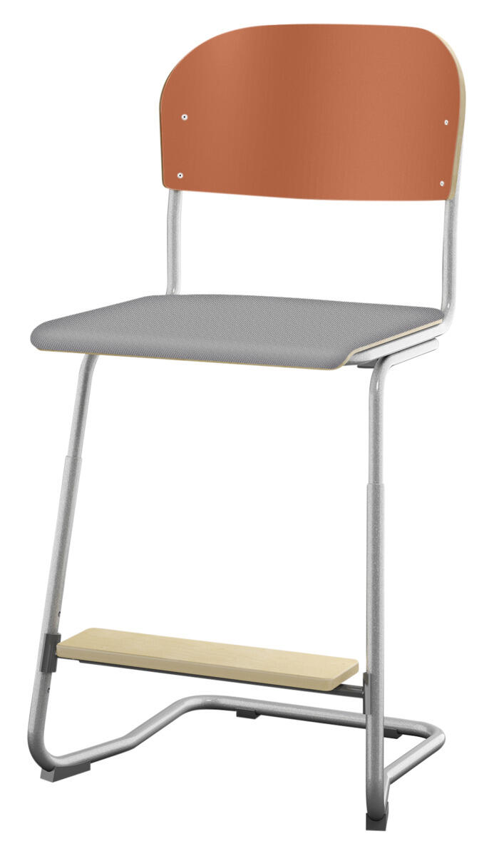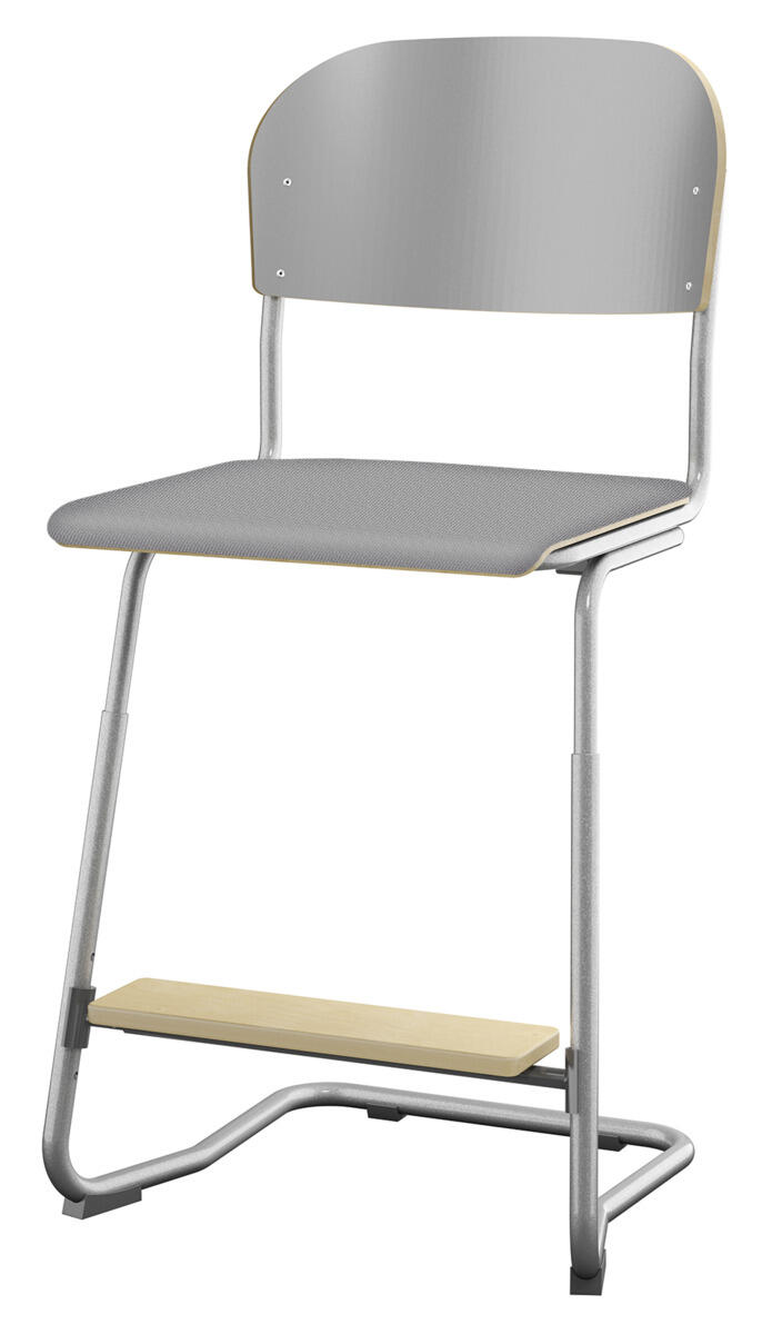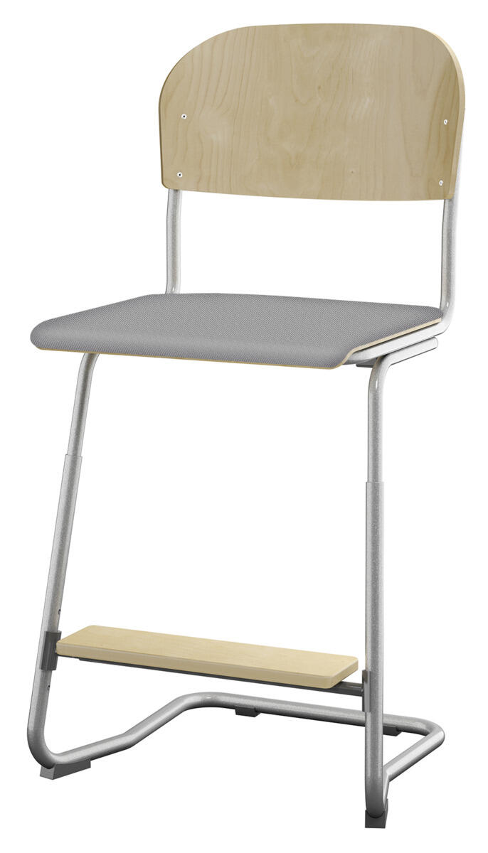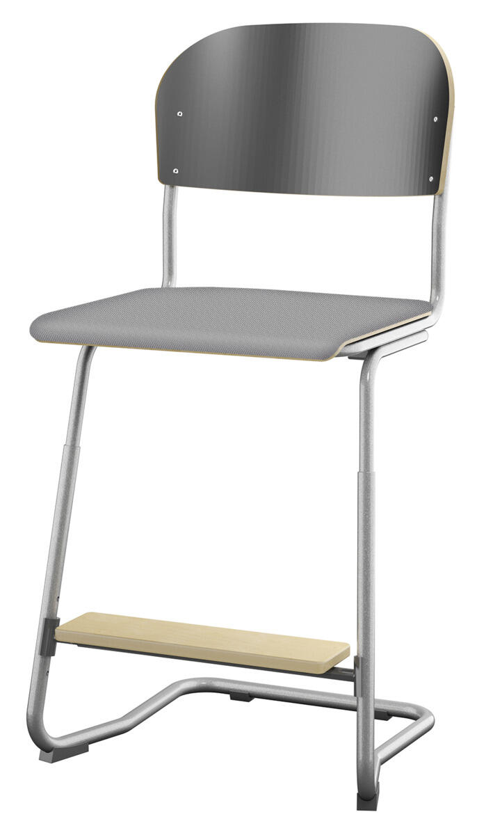 Stapelbar (max 4 st/stapel). Ljuddämpande tassar. Upphängningsbar på bord. Reglerbar fotbräda i 3 fasta lägen. Sitthöjd 50 cm. Sitsmått: B36xD35 cm. Totaldjupet på stativet är 54 cm. Vikt 4,6 kg. Sits och rygg i högtryckslaminat. Silverlackerat stativ, RAL 9006.