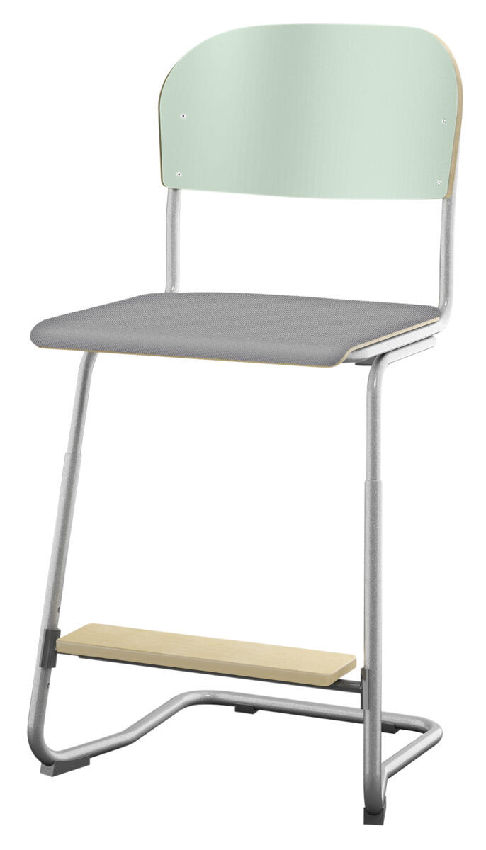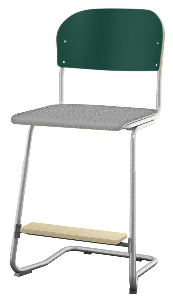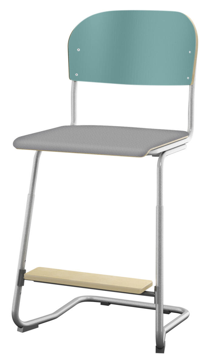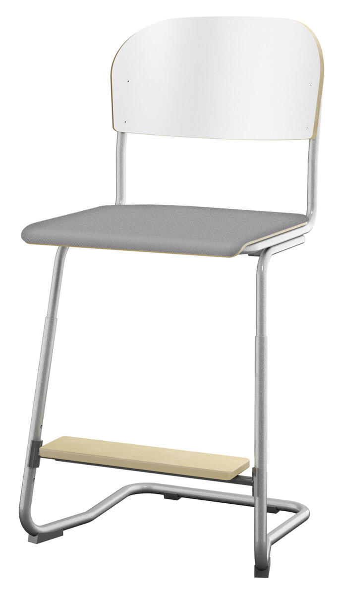 Stapelbar (max 4 st/stapel). Ljuddämpande tassar. Upphängningsbar på bord. Reglerbar fotbräda i 3 fasta lägen. Sitthöjd 50 cm. Sitsmått: B36xD35 cm. Totaldjupet på stativet är 54 cm. Vikt 4,6 kg. Sits och rygg i högtryckslaminat. Silverlackerat stativ, RAL 9006.