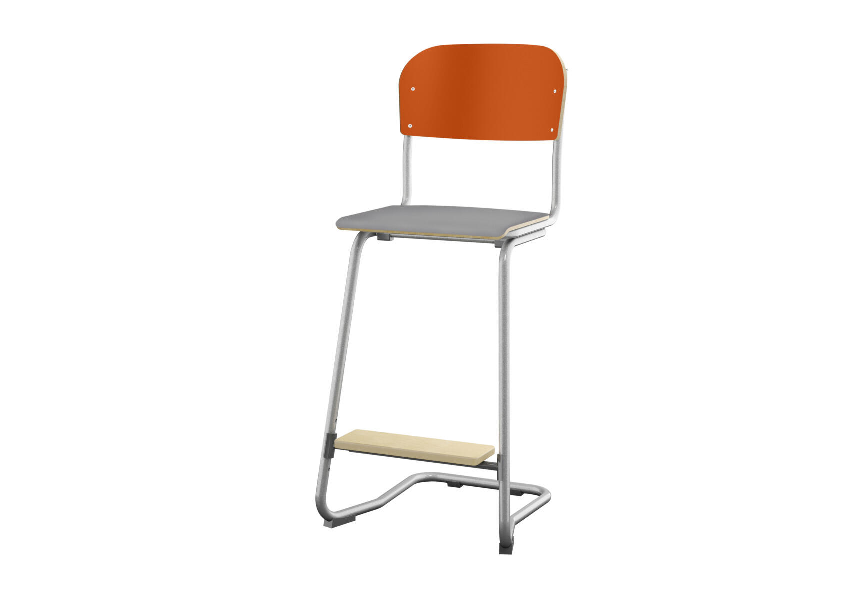 Stapelbar (max 4 st/stapel). Ljuddämpande tassar. Upphängningsbar på bord. Reglerbar fotbräda i 3 fasta lägen. Sitthöjd 50 cm. Sitsmått: B36xD35 cm. Totaldjupet på stativet är 54 cm. Vikt 4,6 kg. Sits och rygg i högtryckslaminat. Silverlackerat stativ, RAL 9006.