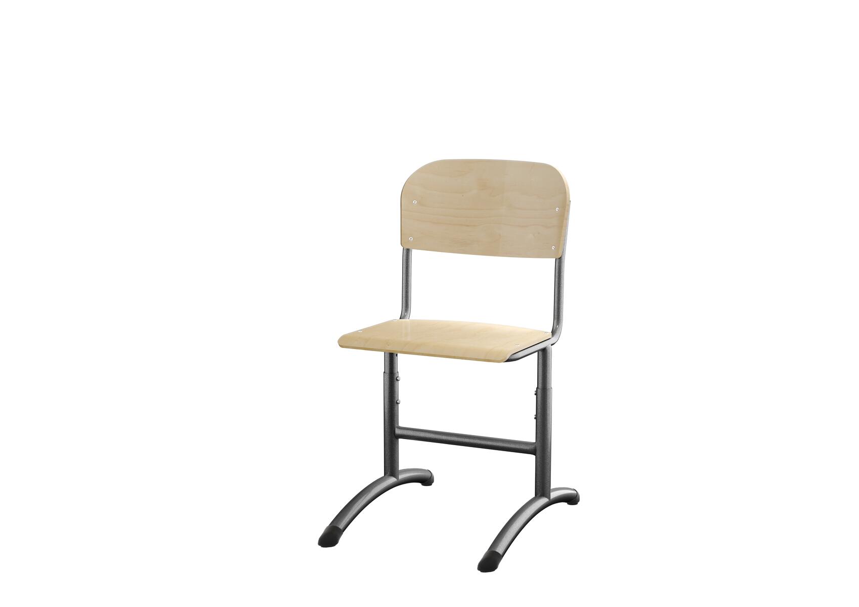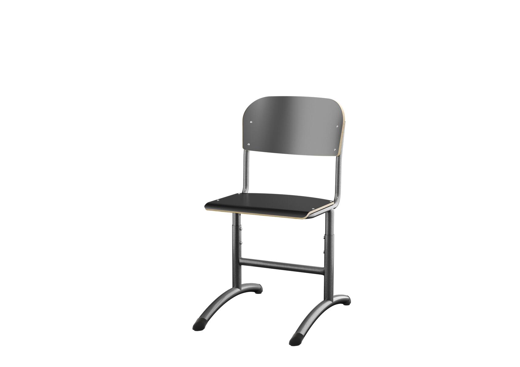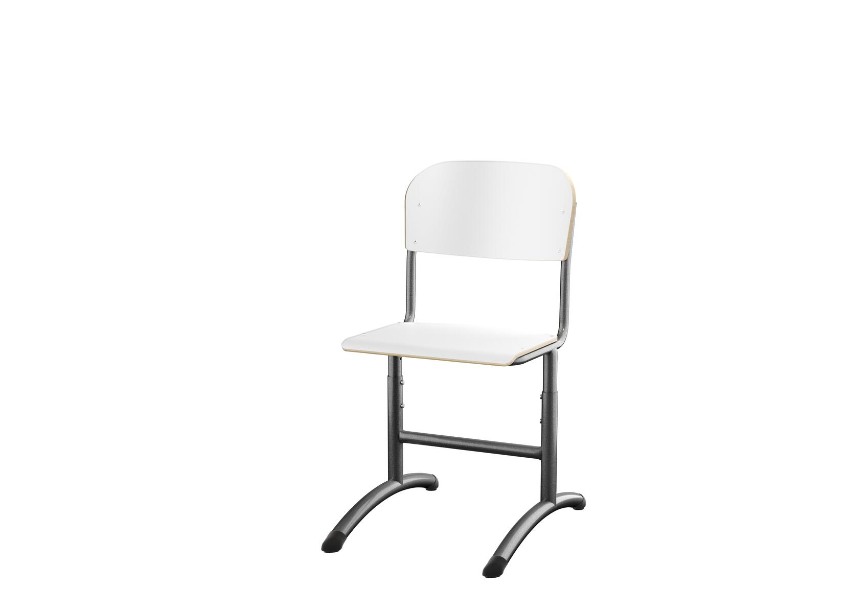 Stapelbar. Ljuddämpande tassar. Reglerbart fotstöd. Sitthöjd: 65 cm. Sitsmått: B42xD39 cm. Vikt 5,3 kg. Sits och rygg i högtryckslaminat. Silverlackerat stativ, RAL 9006.
