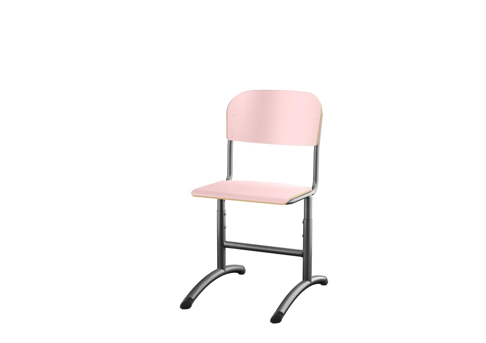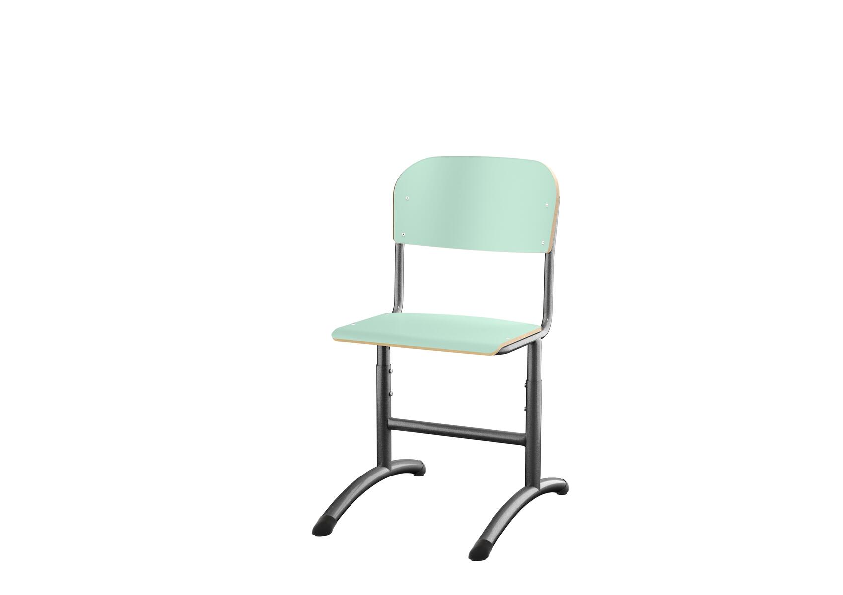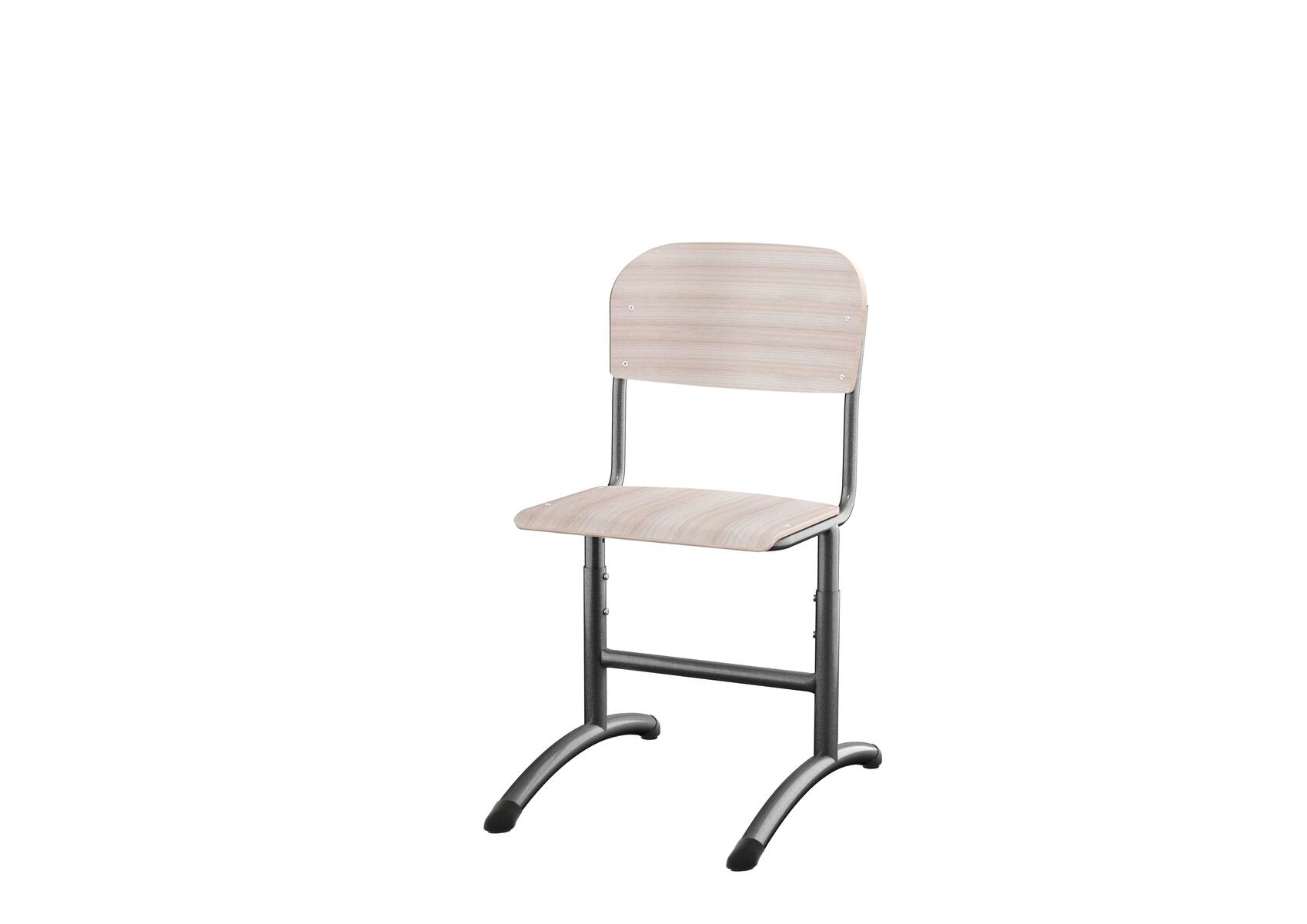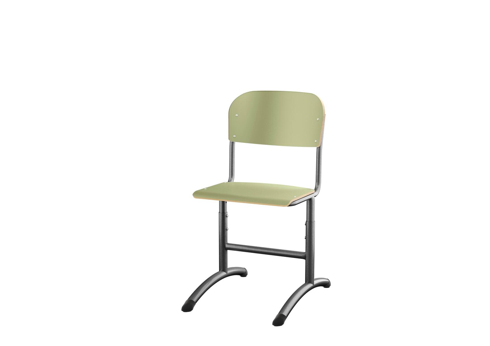 Stapelbar. Ljuddämpande tassar. Reglerbart fotstöd. Sitthöjd: 65 cm. Sitsmått: B42xD39 cm. Vikt 5,3 kg. Sits och rygg i högtryckslaminat. Silverlackerat stativ, RAL 9006.