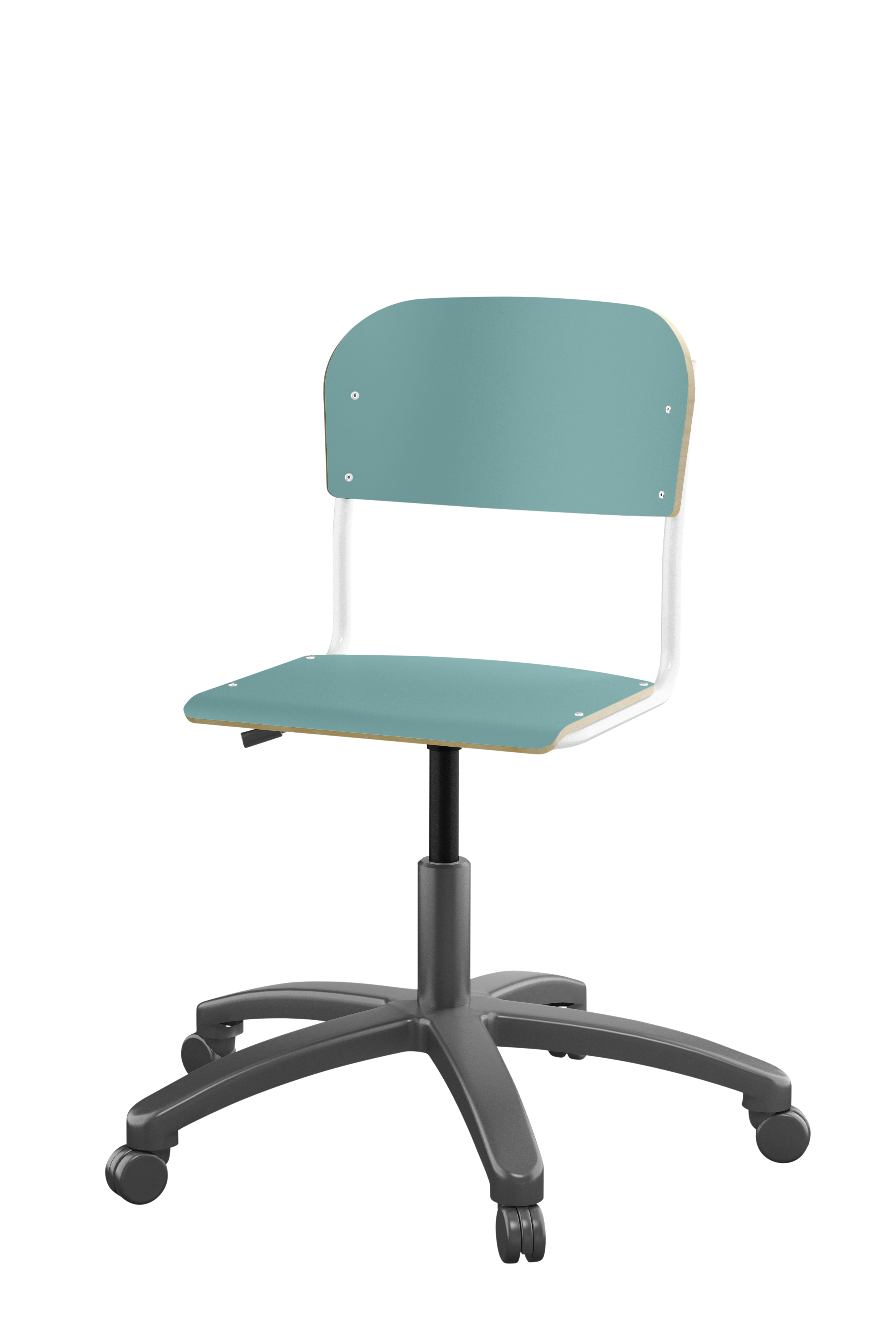 Stol Matte med gasfjäder för reglering av sitthöjd med hjälp av en spak. Sits och rygg i högtryckslaminat. Ram till sits och rygg i pulverlackerat stål, vit. Kryss i aluminium med hjul.