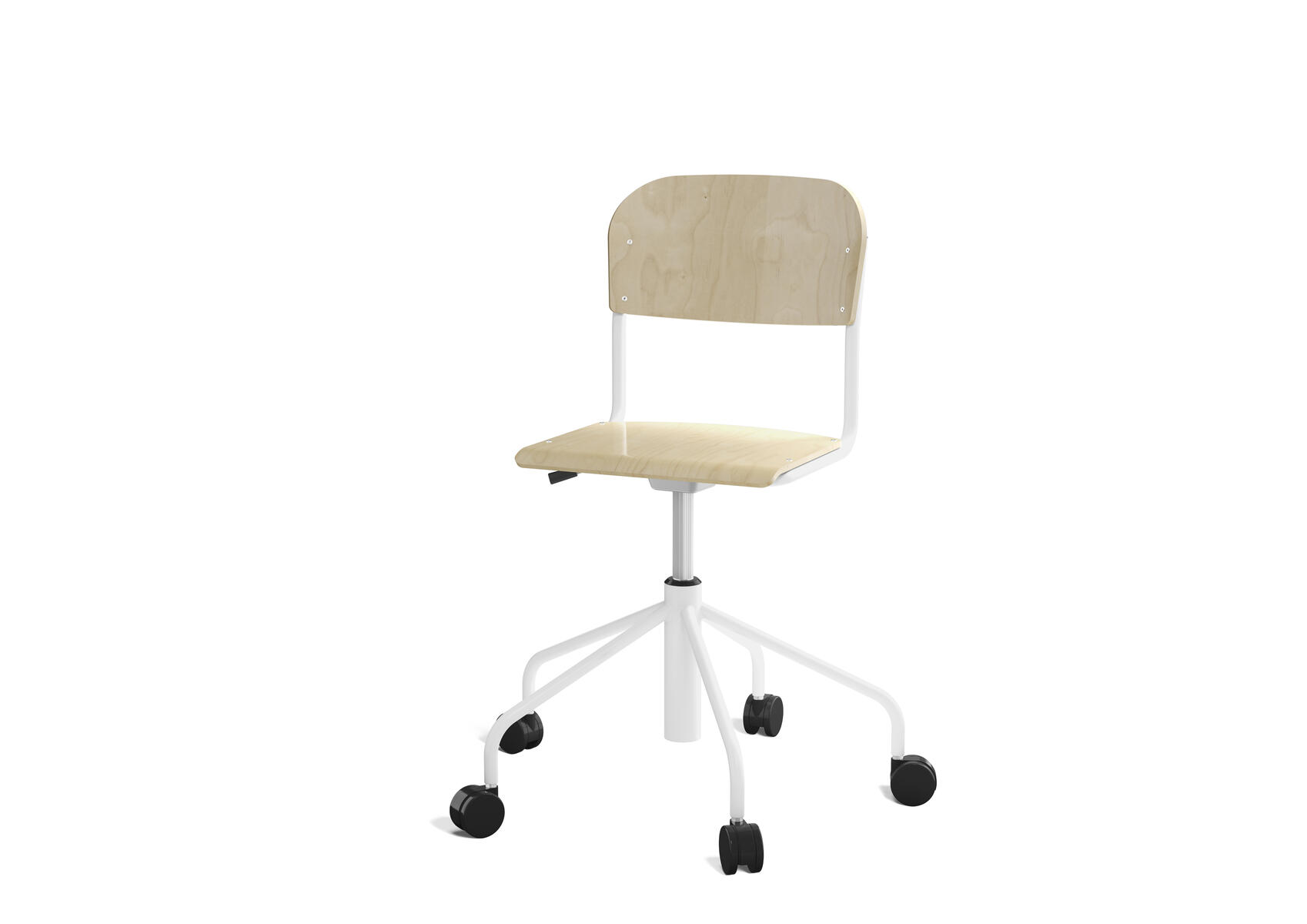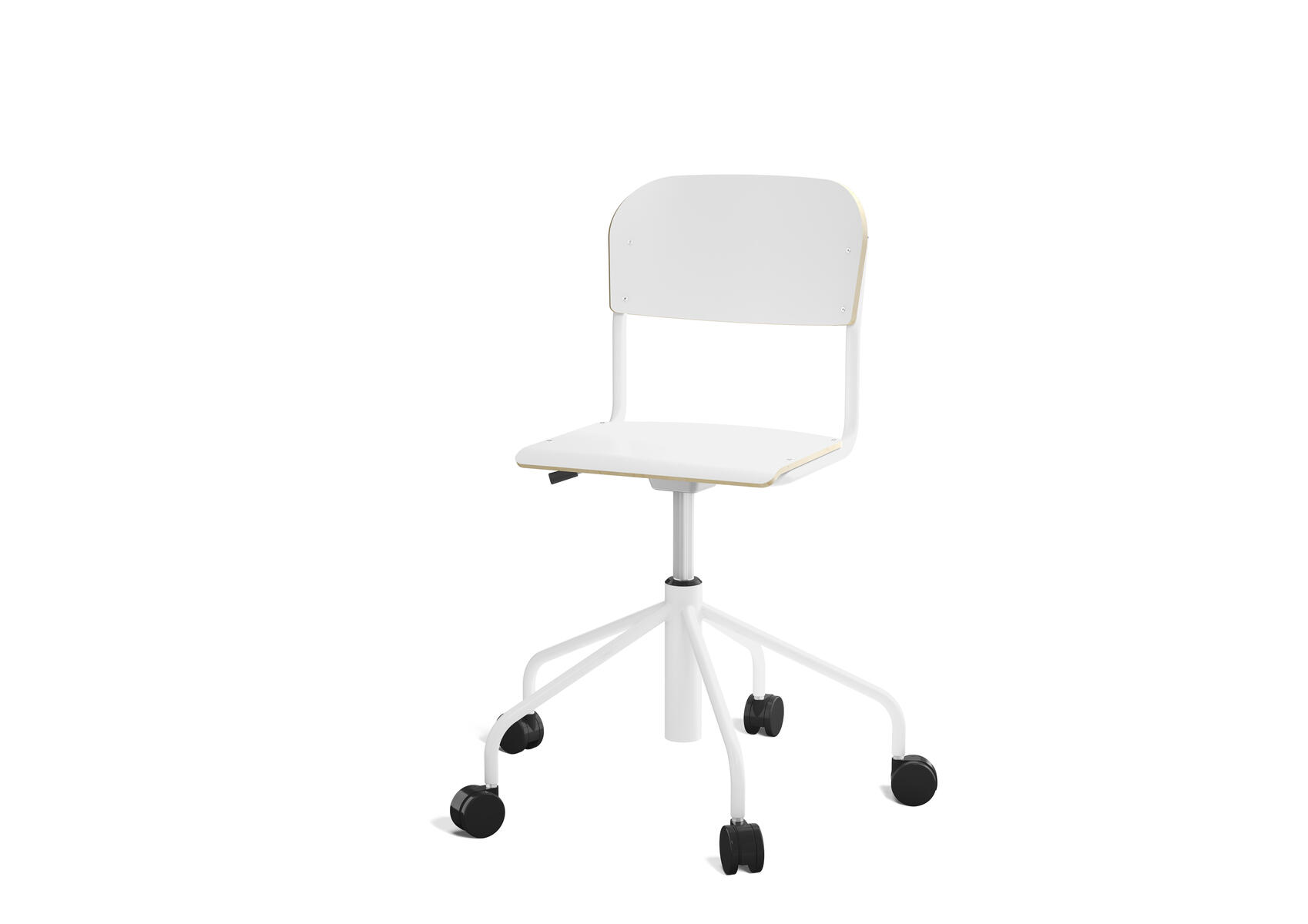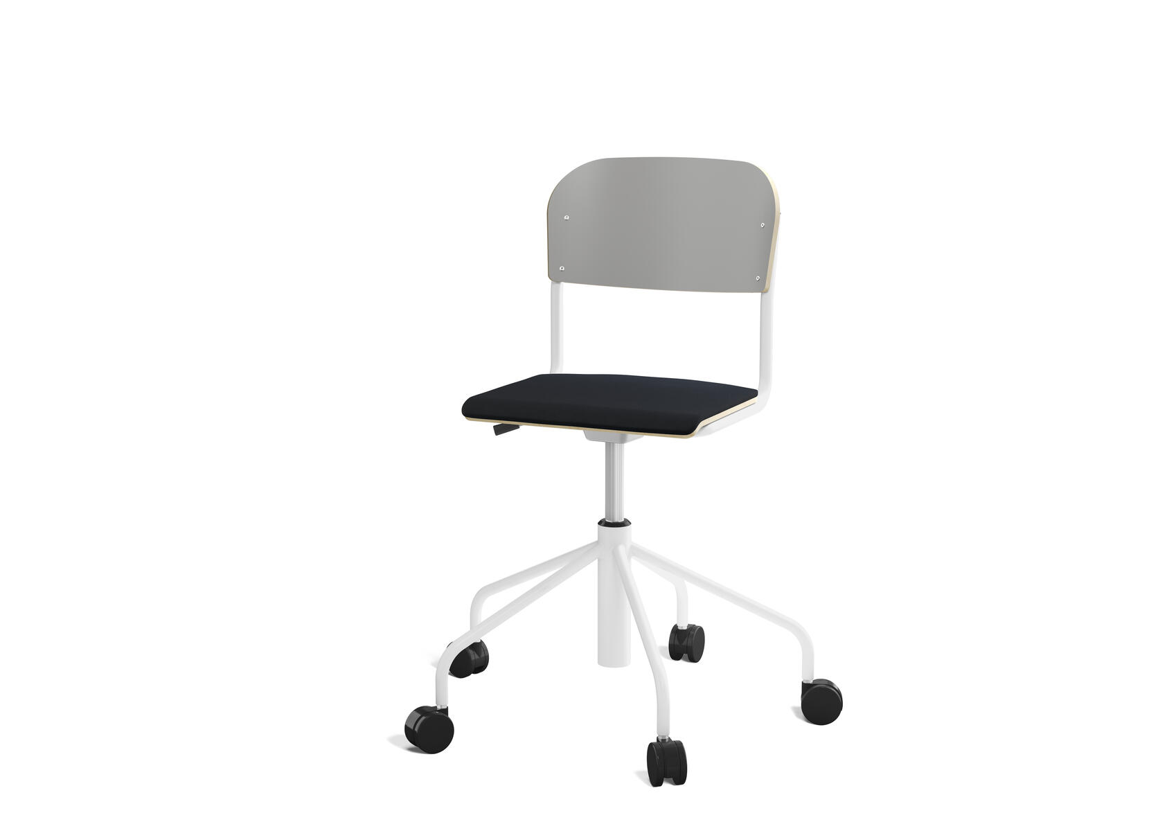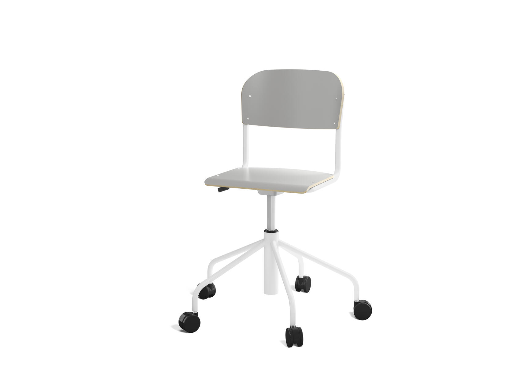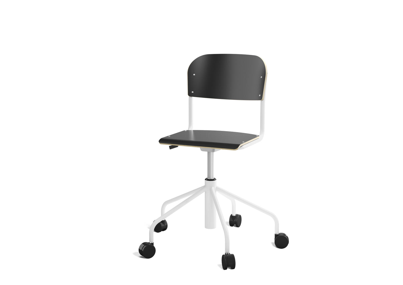 Stapelbar (max 4 st/stapel). Ljuddämpande tassar. Upphängningsbar på bord. Reglerbar fotbräda i 3 fasta lägen. Sitthöjd: ställbar till 57, 60 eller 63 cm. Sitsmått: B36xD35 cm. Totaldjupet på stativet är 54 cm. Vikt 6,4 kg. Sits och rygg i högtryckslaminat. Silverlackerat stativ, RAL 9006.