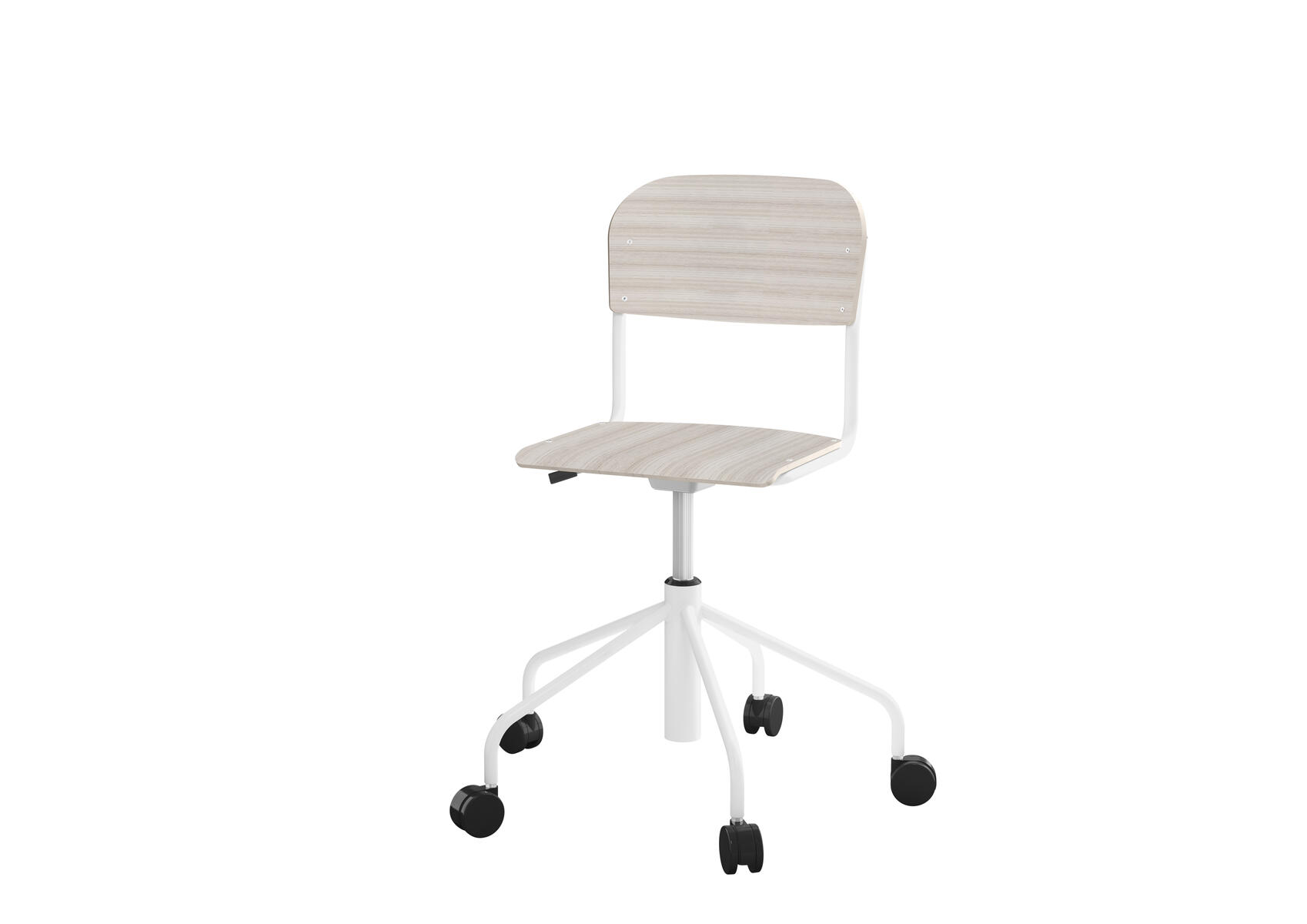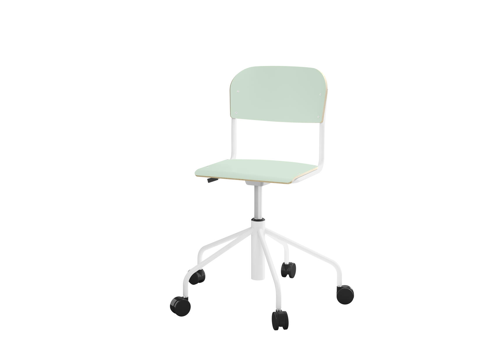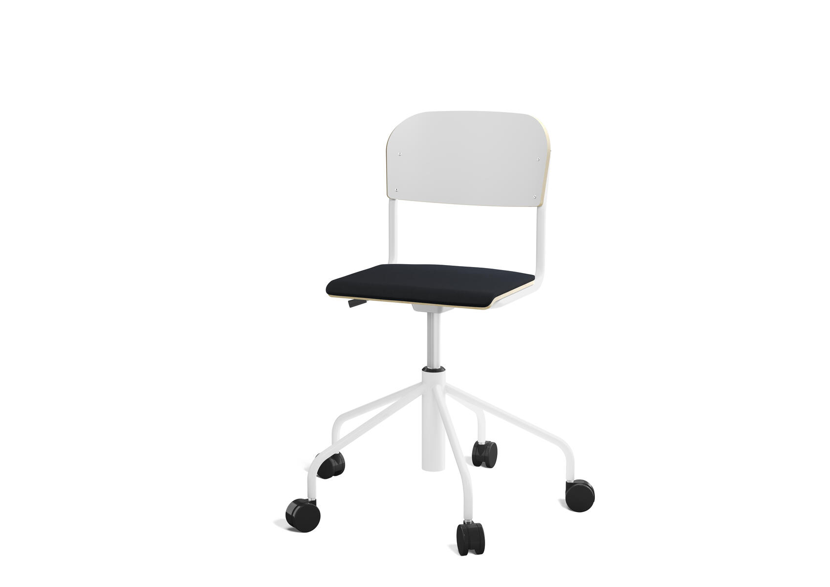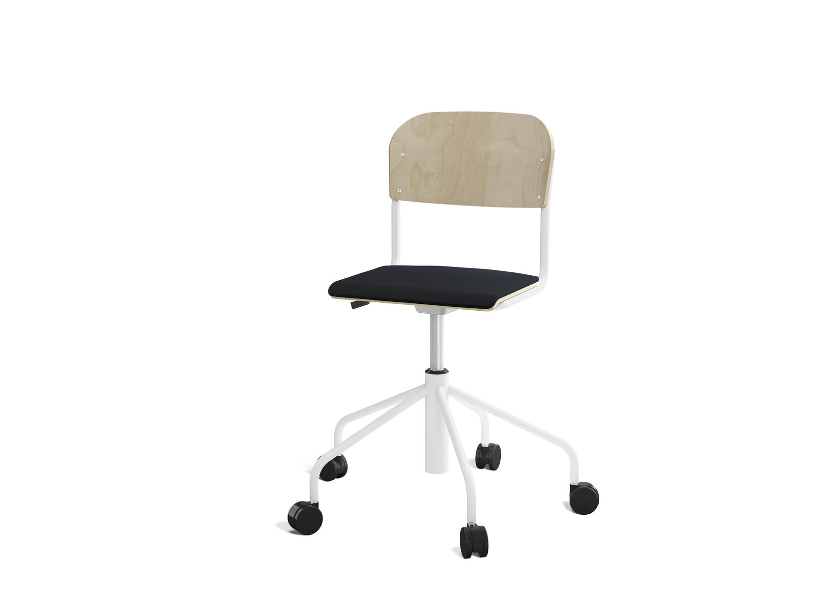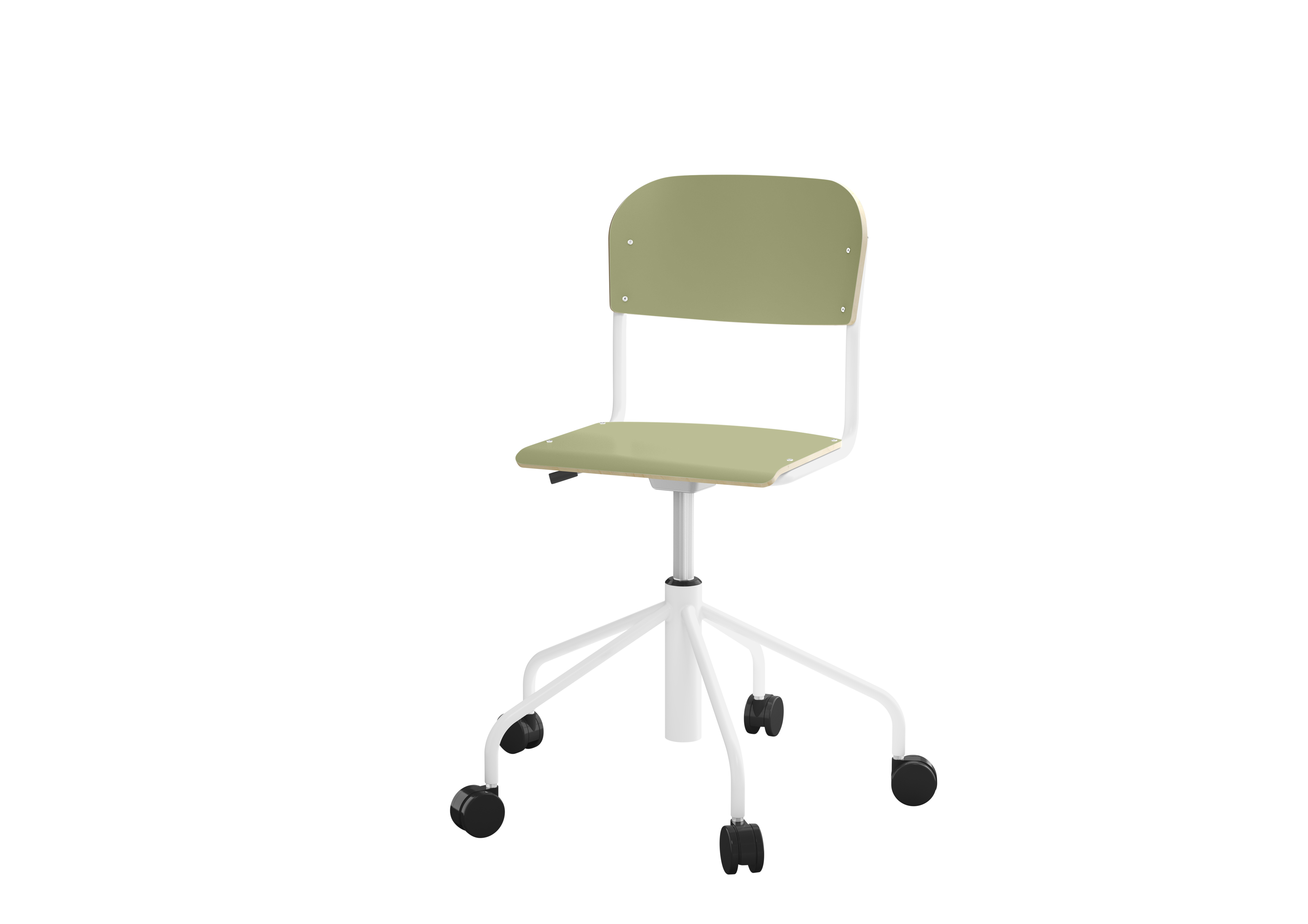 Stapelbar (max 4 st/stapel). Ljuddämpande tassar. Upphängningsbar på bord. Reglerbar fotbräda i 3 fasta lägen. Sitthöjd: ställbar till 57, 60 eller 63 cm. Sitsmått: B36xD35 cm. Totaldjupet på stativet är 54 cm. Vikt 6,4 kg. Sits och rygg i högtryckslaminat. Silverlackerat stativ, RAL 9006.