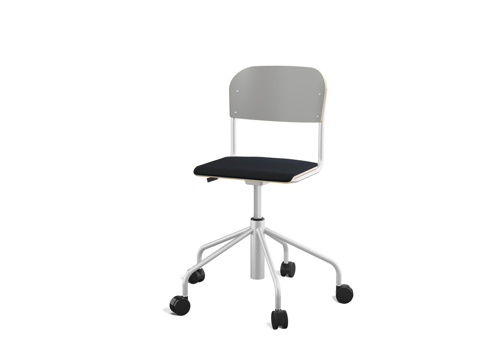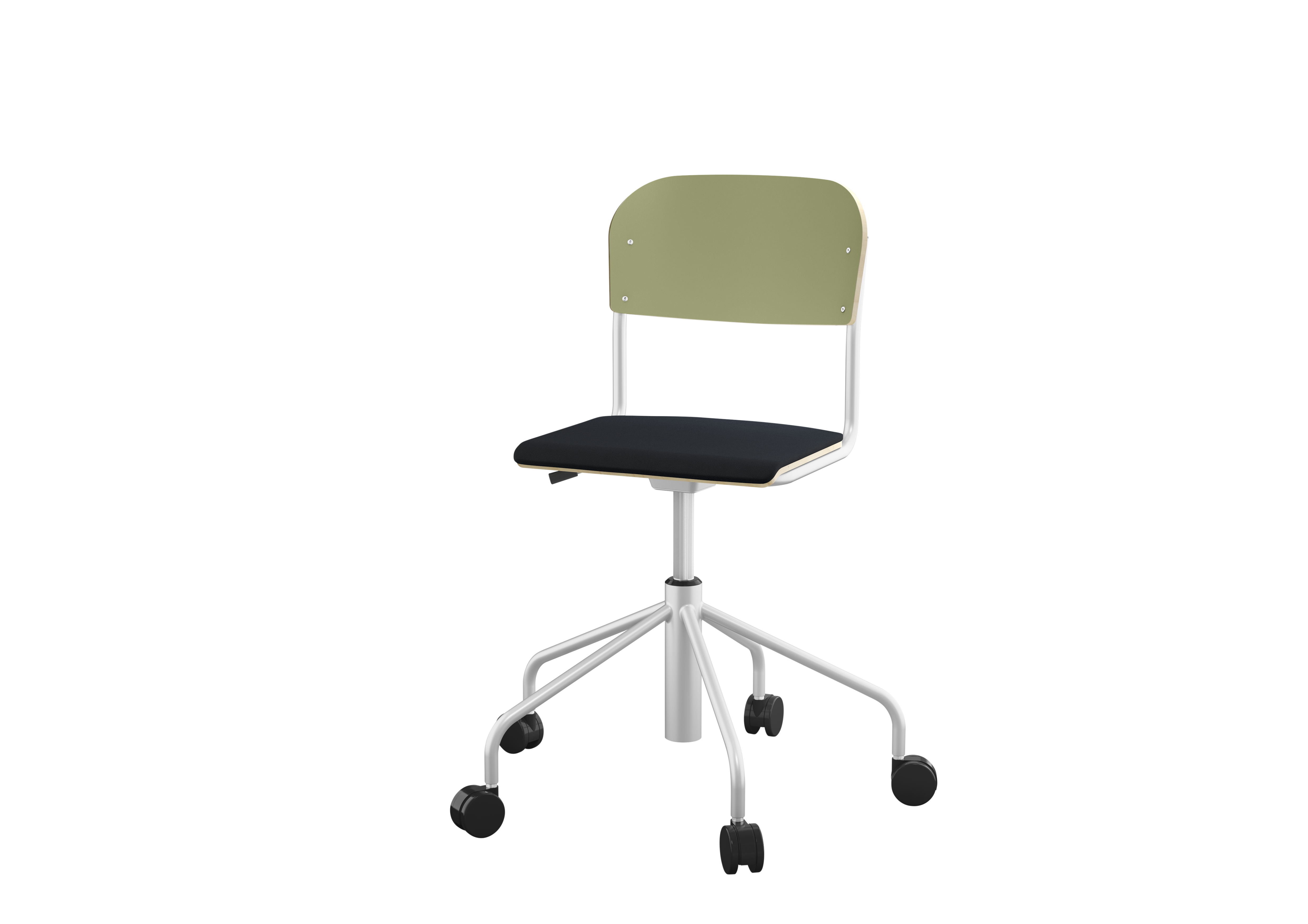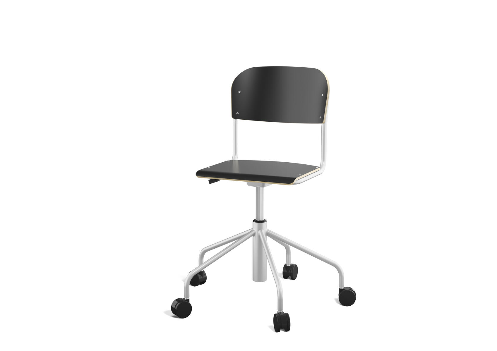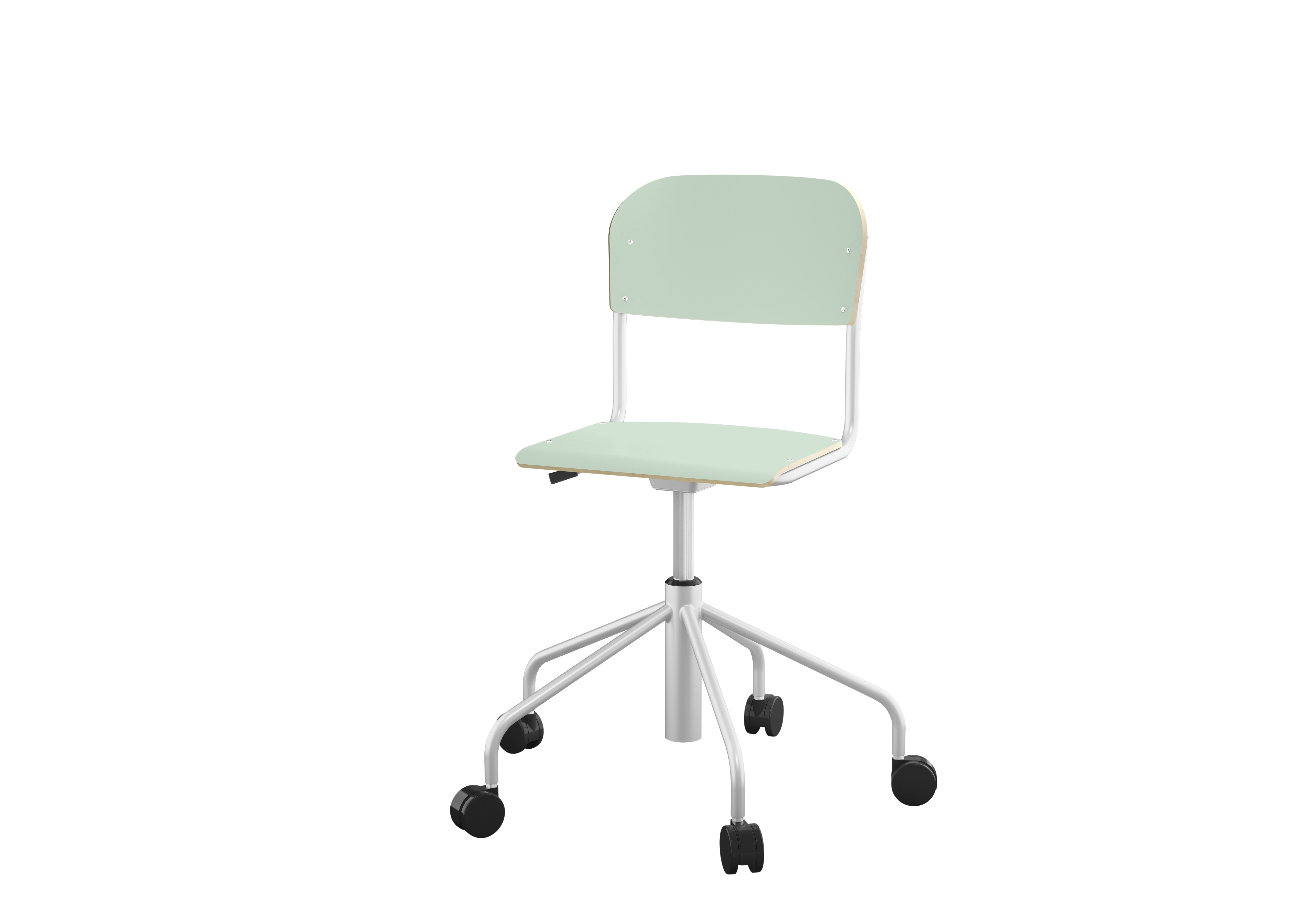 Stapelbar (max 4 st/stapel). Ljuddämpande tassar. Upphängningsbar på bord. Reglerbar fotbräda i 3 fasta lägen. Sitthöjd 50 cm. Sitsmått: B36xD35 cm. Totaldjupet på stativet är 54 cm. Vikt 4,6 kg. Sits och rygg i högtryckslaminat. Silverlackerat stativ, RAL 9006.