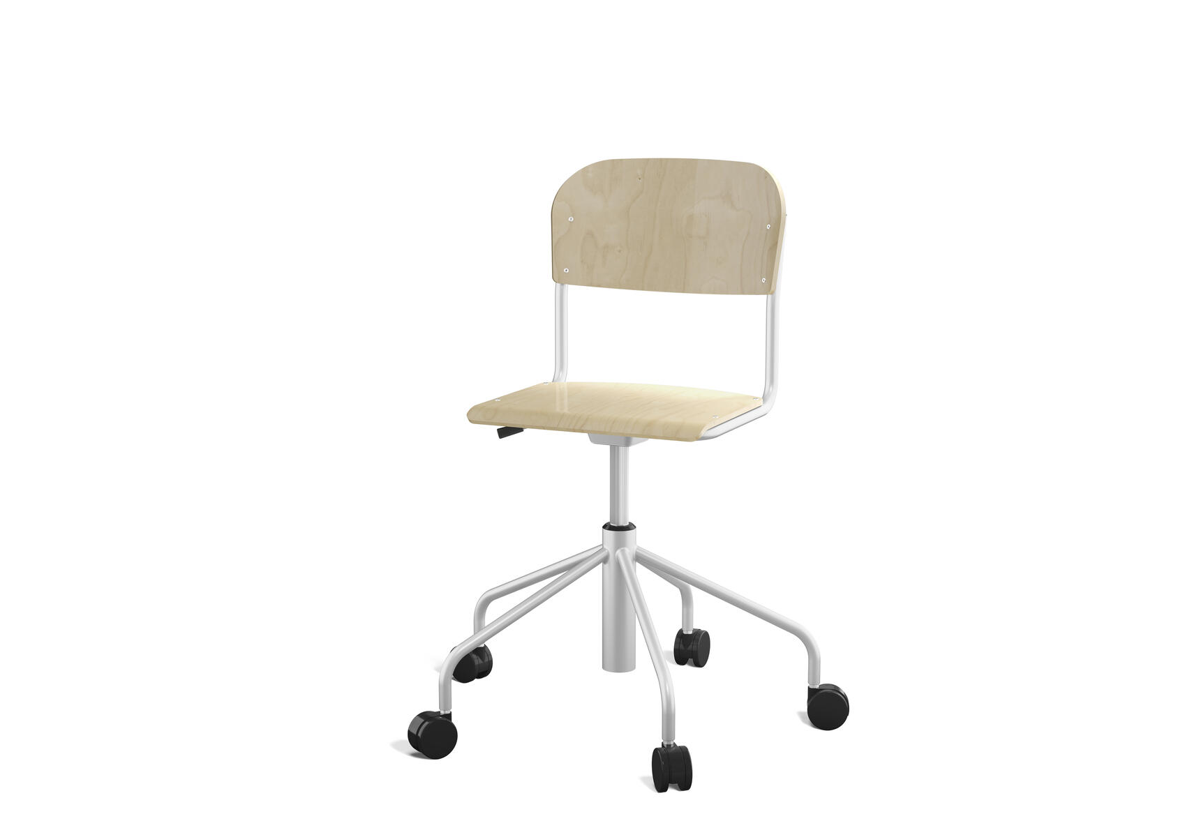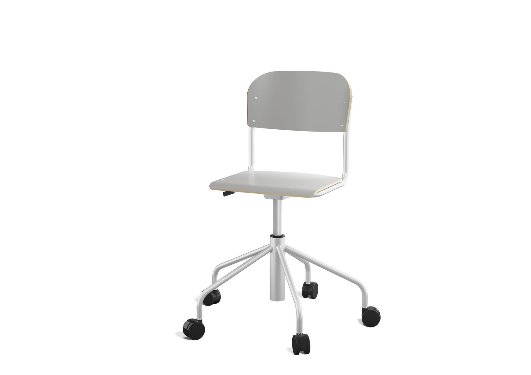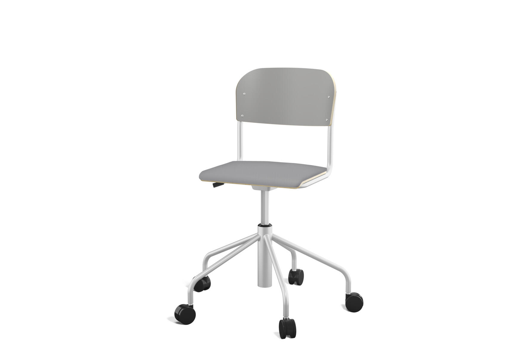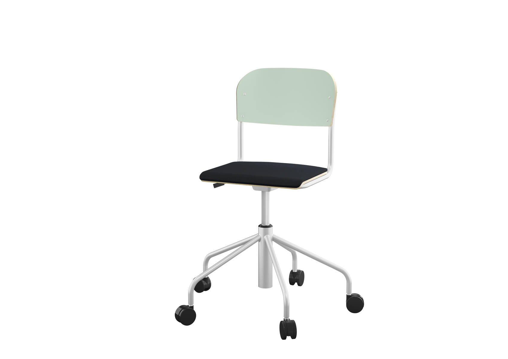 Stapelbar (max 4 st/stapel). Ljuddämpande tassar. Upphängningsbar på bord. Reglerbar fotbräda i 3 fasta lägen. Sitthöjd 50 cm. Sitsmått: B36xD35 cm. Totaldjupet på stativet är 54 cm. Vikt 4,6 kg. Sits och rygg i högtryckslaminat. Silverlackerat stativ, RAL 9006.