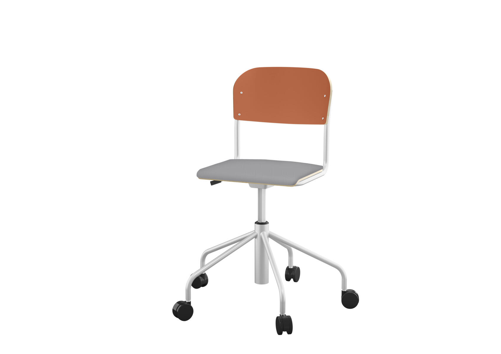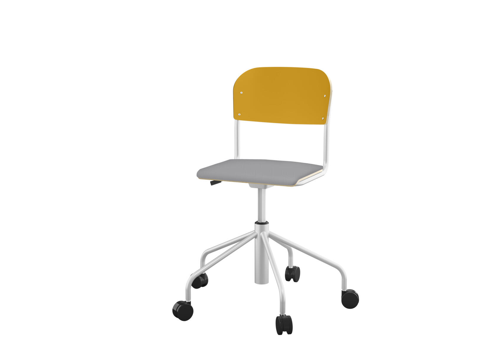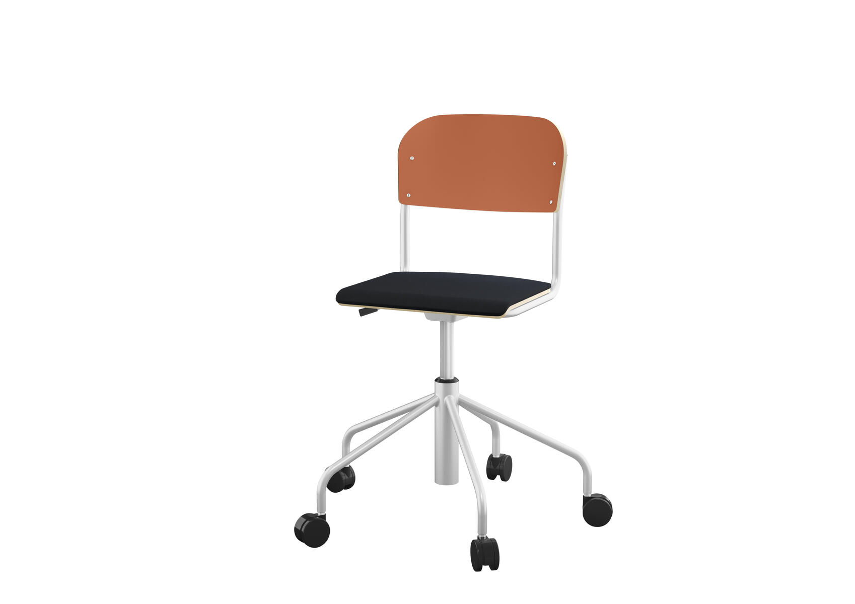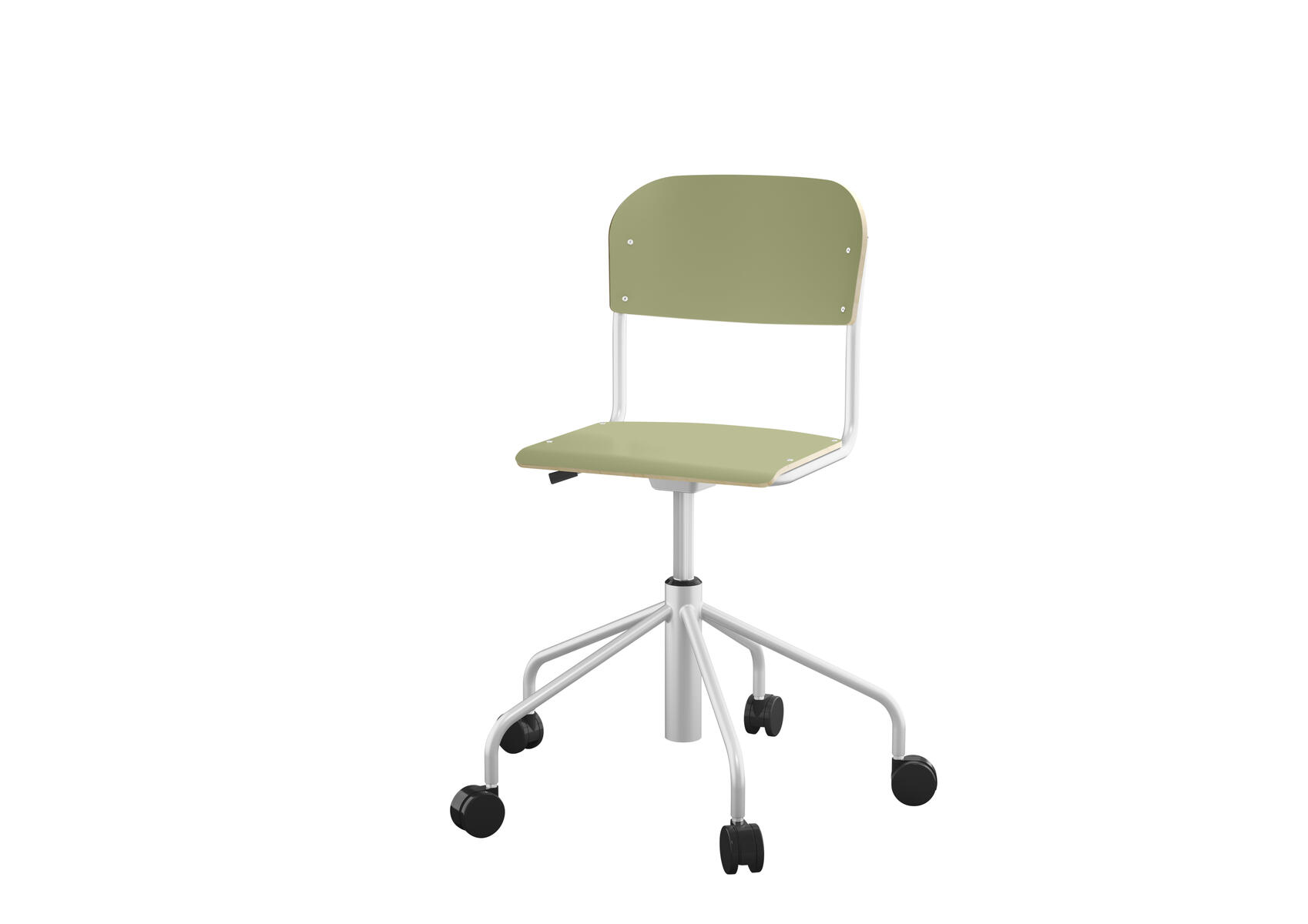 Stapelbar (max 4 st/stapel). Ljuddämpande tassar. Upphängningsbar på bord. Reglerbar fotbräda i 3 fasta lägen. Sitthöjd 50 cm. Sitsmått: B36xD35 cm. Totaldjupet på stativet är 54 cm. Vikt 4,6 kg. Sits och rygg i högtryckslaminat. Silverlackerat stativ, RAL 9006.