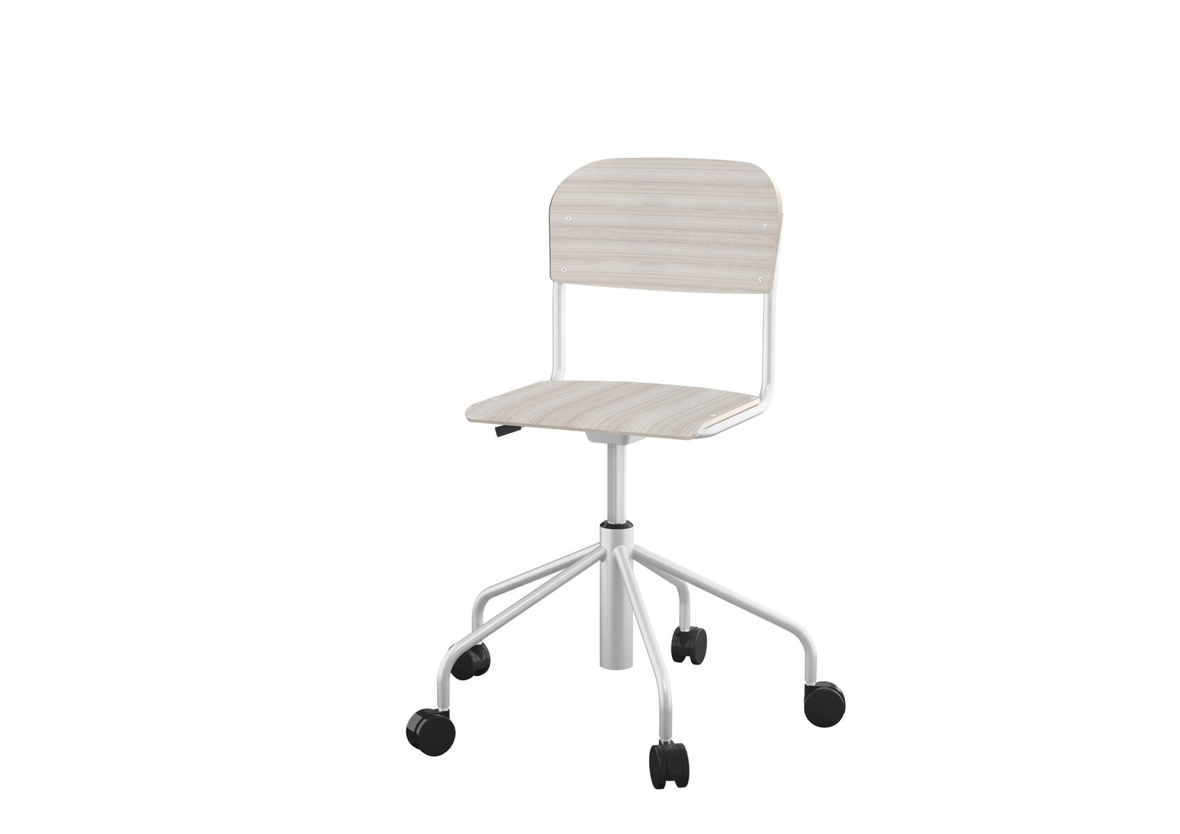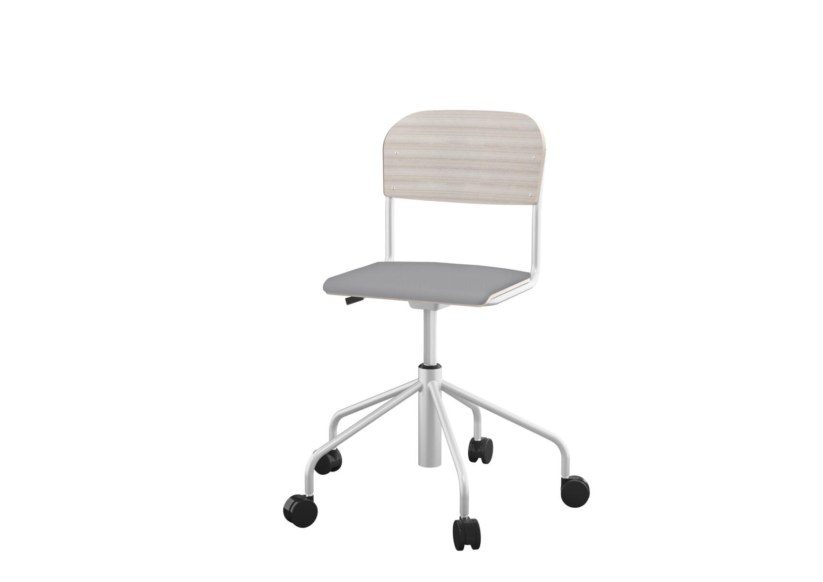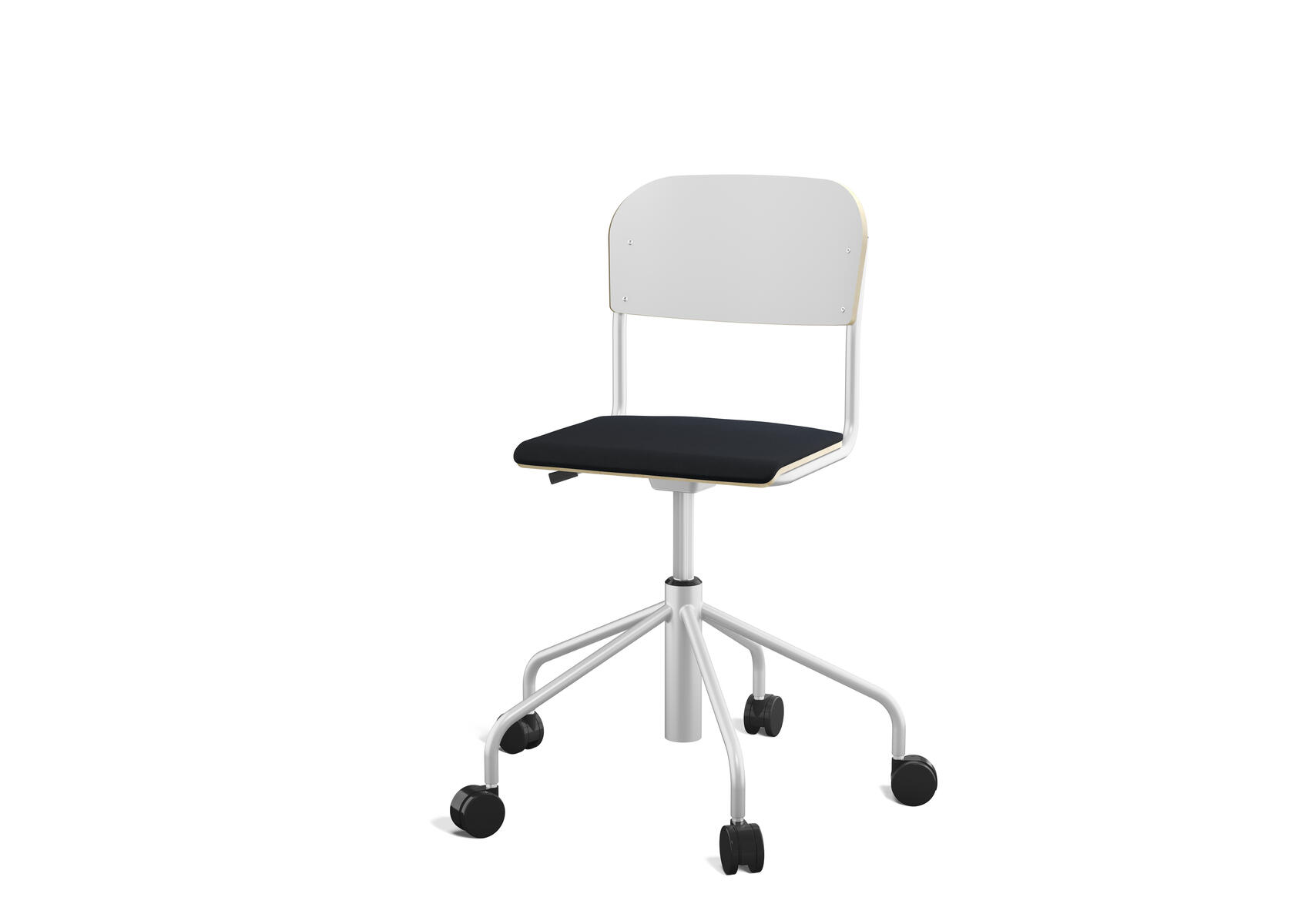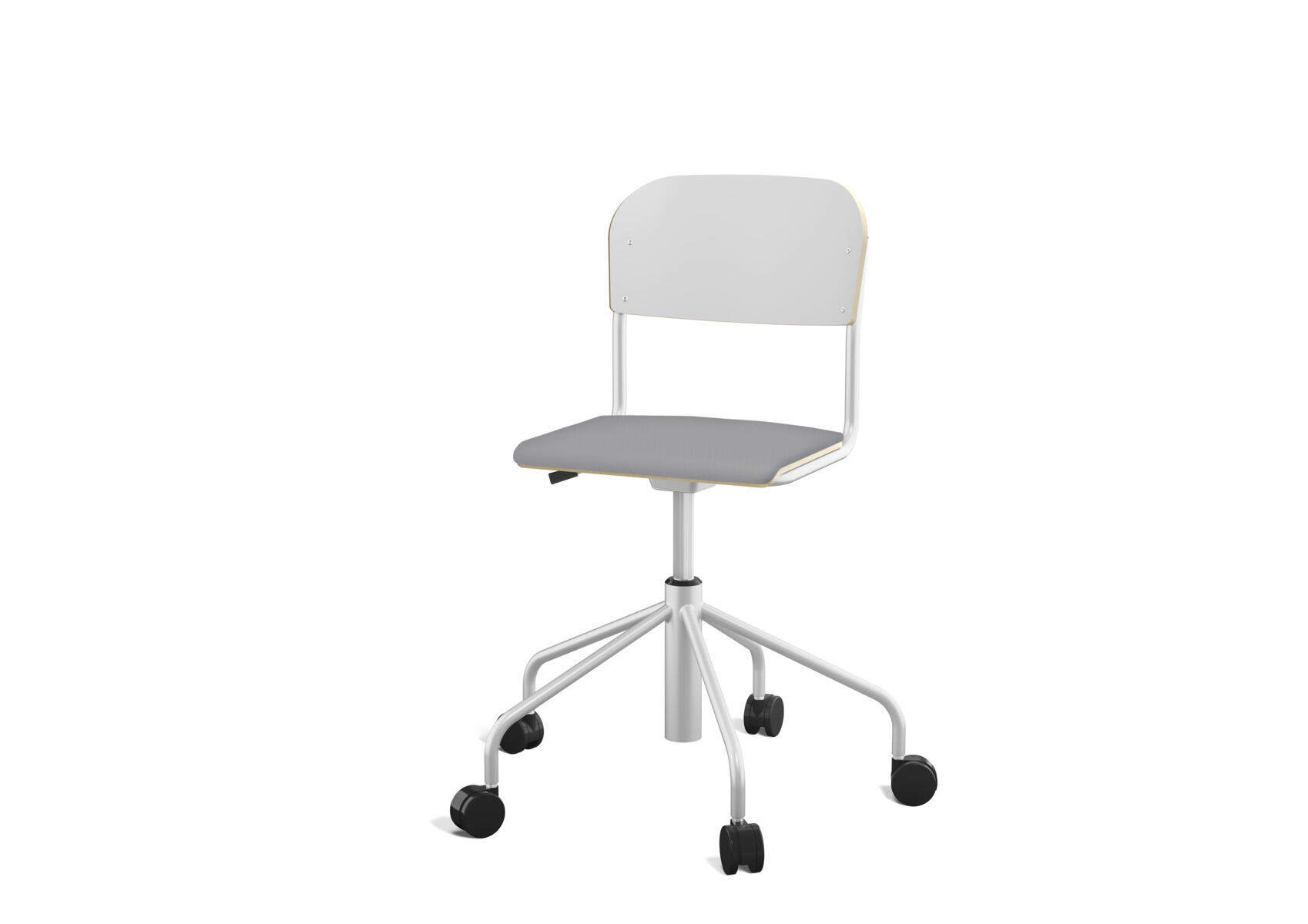 Stapelbar (max 4 st/stapel). Ljuddämpande tassar. Upphängningsbar på bord. Reglerbar fotbräda i 3 fasta lägen. Sitthöjd 50 cm. Sitsmått: B36xD35 cm. Totaldjupet på stativet är 54 cm. Vikt 4,6 kg. Sits och rygg i högtryckslaminat. Silverlackerat stativ, RAL 9006.