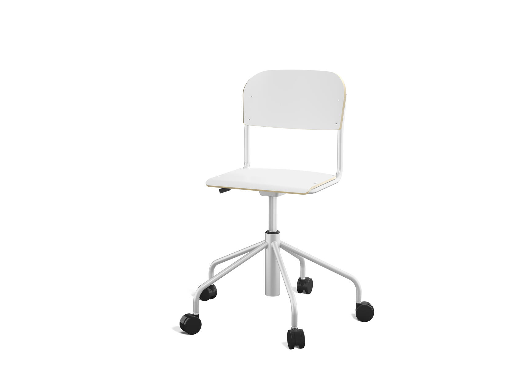Stapelbar. Ljuddämpande tassar. Reglerbart fotstöd. Sitthöjd: 65 cm. Sitsmått: B42xD39 cm. Vikt 5,3 kg. Sits och rygg i högtryckslaminat. Silverlackerat stativ, RAL 9006.