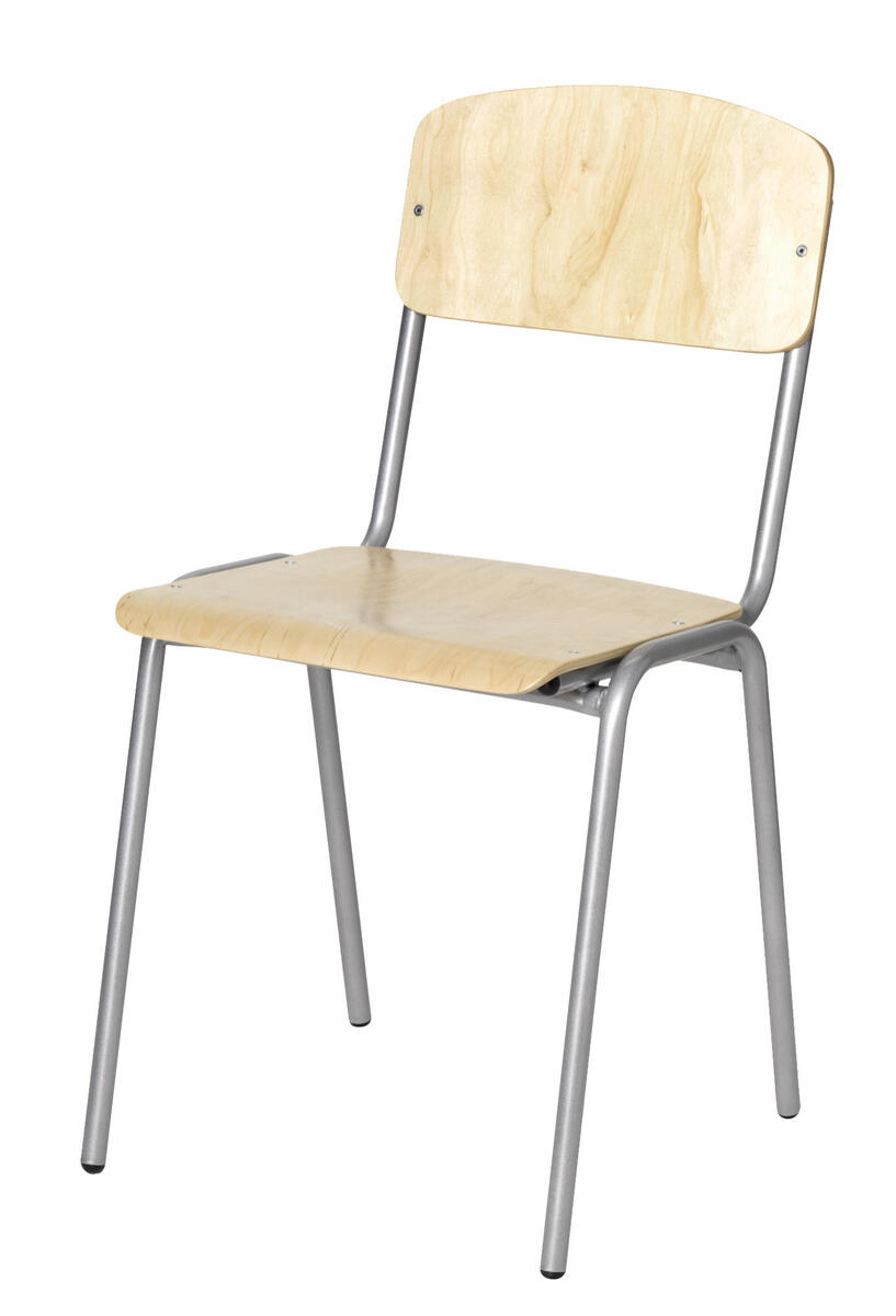 Lackerad stapelbar stol (max 6/stapel) och stabil för upphängning. Sitthöjd 45 cm, sittdjup 41 cm och totalbredd 50 cm. Vikt 4,5 kg. Sits i formpressad björk.