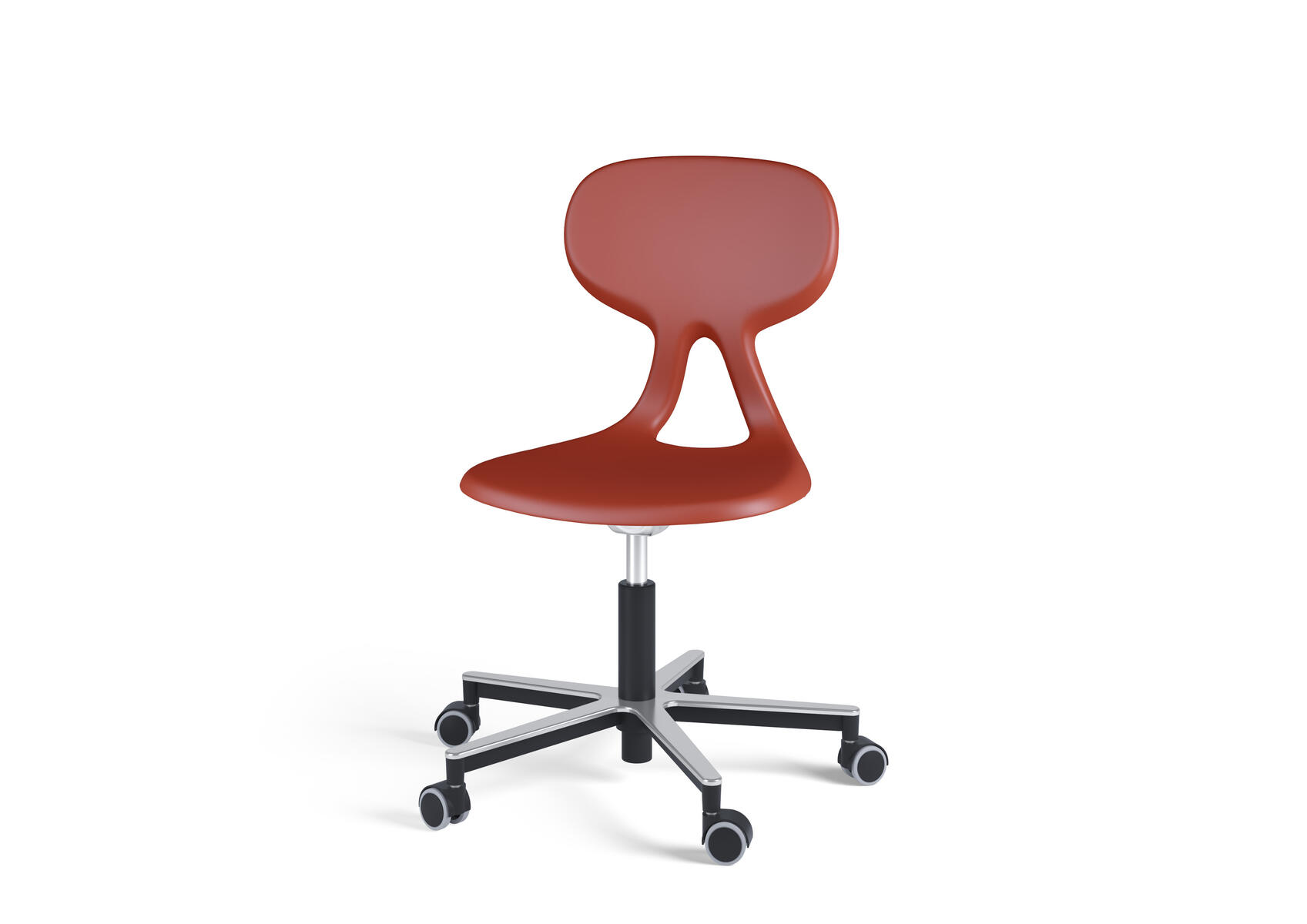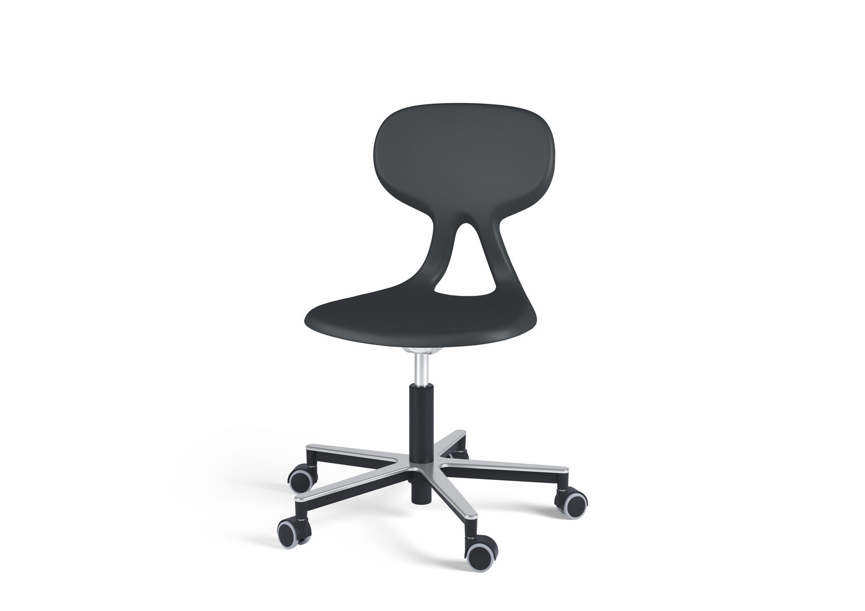 Det ergonomiska utförandet hjälper användaren till en bättre hållning och ger ett flexibelt stöd för ryggen. Moviflexmekanismen gör att man kan vippa på sitsen åt alla håll, vilket uppmuntrar ett aktivt sittande. Lätt att rengöra. Skal i polyuretan. Borstat aluminiumkryss med hjul. Mått: Sitthöjd 38-50 cm. Sitsbredd 38 cm. Sitsdjup 34 cm.
