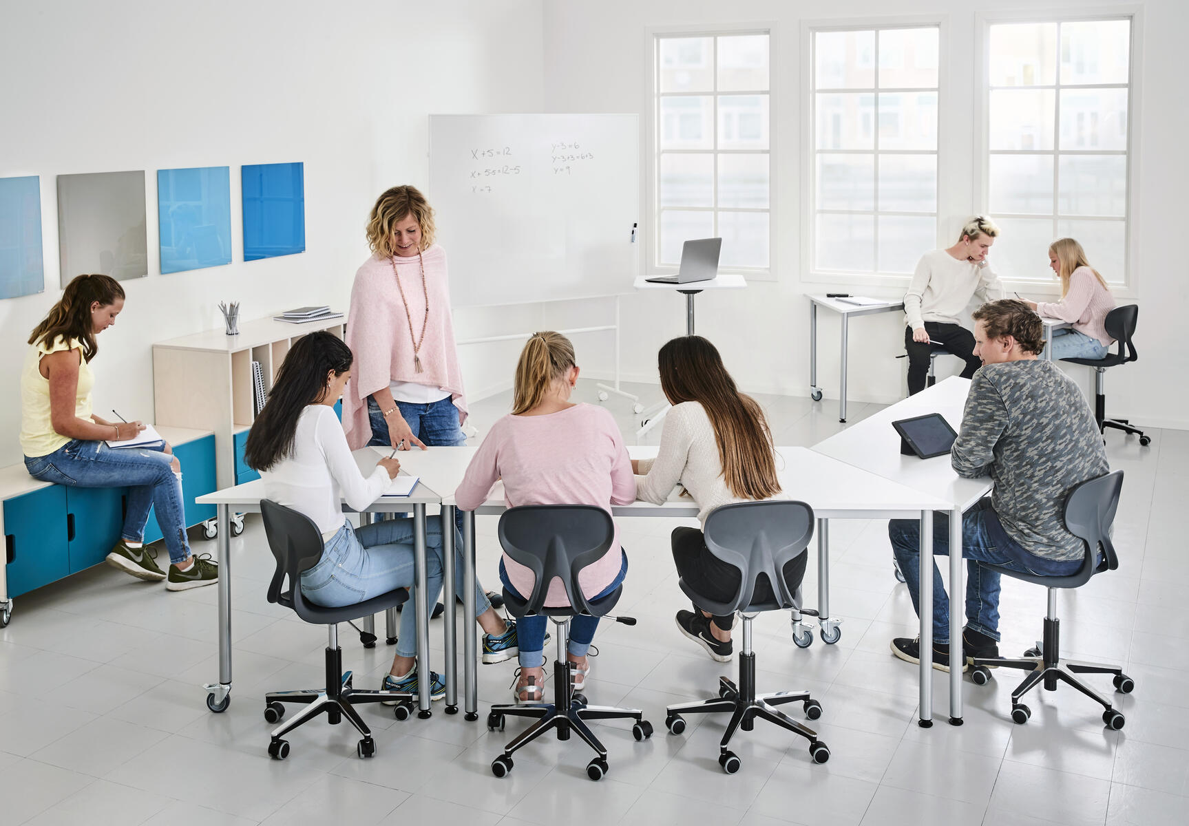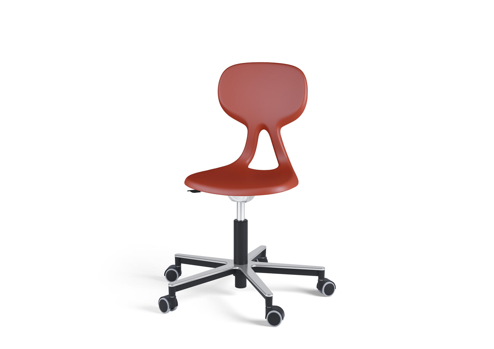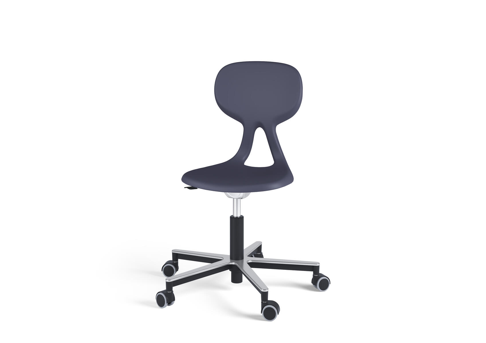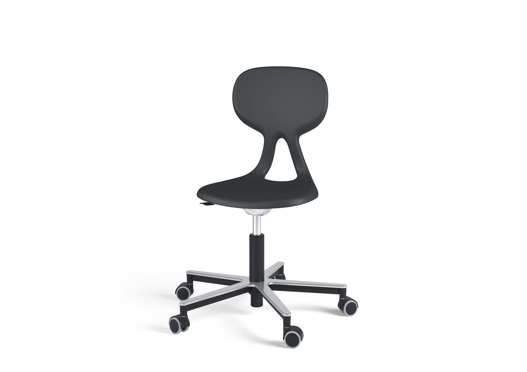 Det ergonomiska utförandet hjälper användaren till en bättre hållning och ger ett flexibelt stöd för ryggen. Moviflexmekanismen gör att man kan vippa på sitsen åt alla håll, vilket uppmuntrar ett aktivt sittande. Lätt att rengöra. Skal i polyuretan. Borstat aluminiumkryss med hjul. Mått: Sitthöjd 38-50 cm. Sitsbredd 38 cm. Sitsdjup 34 cm.