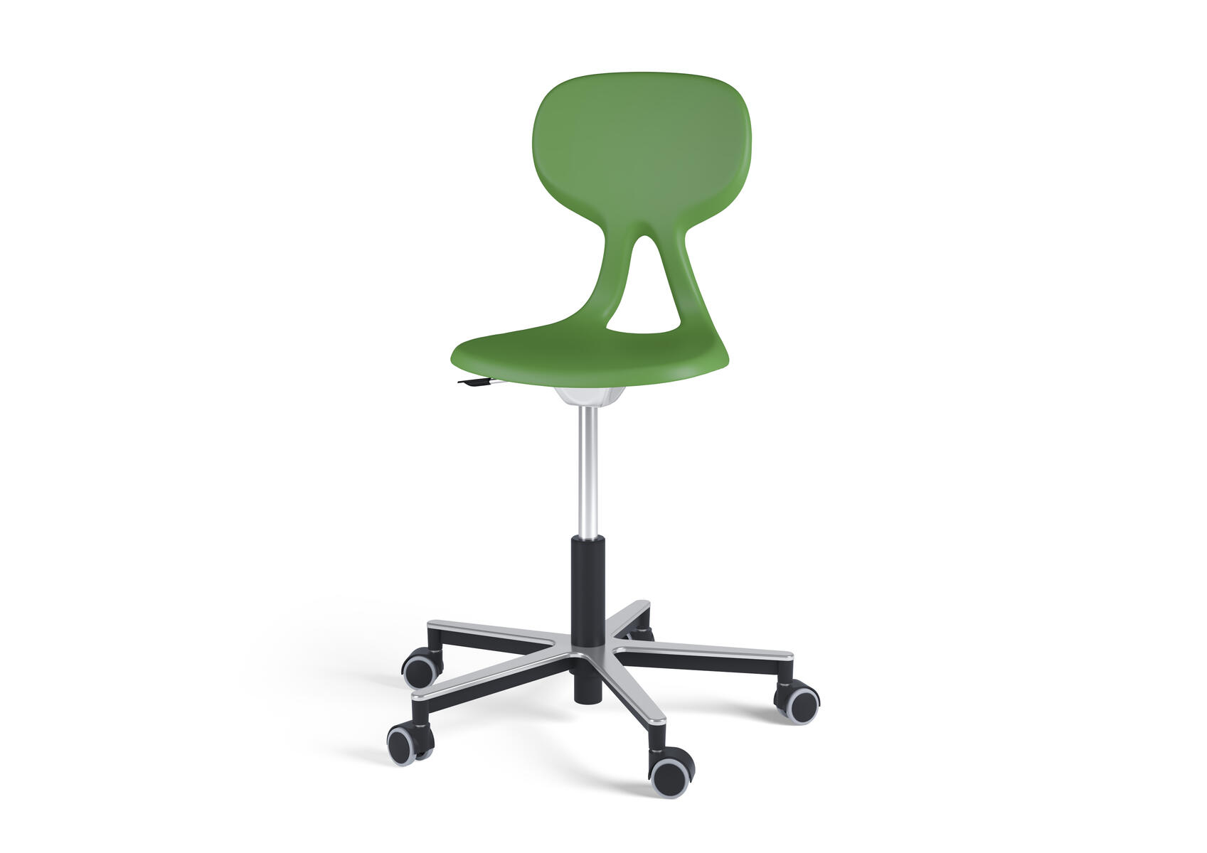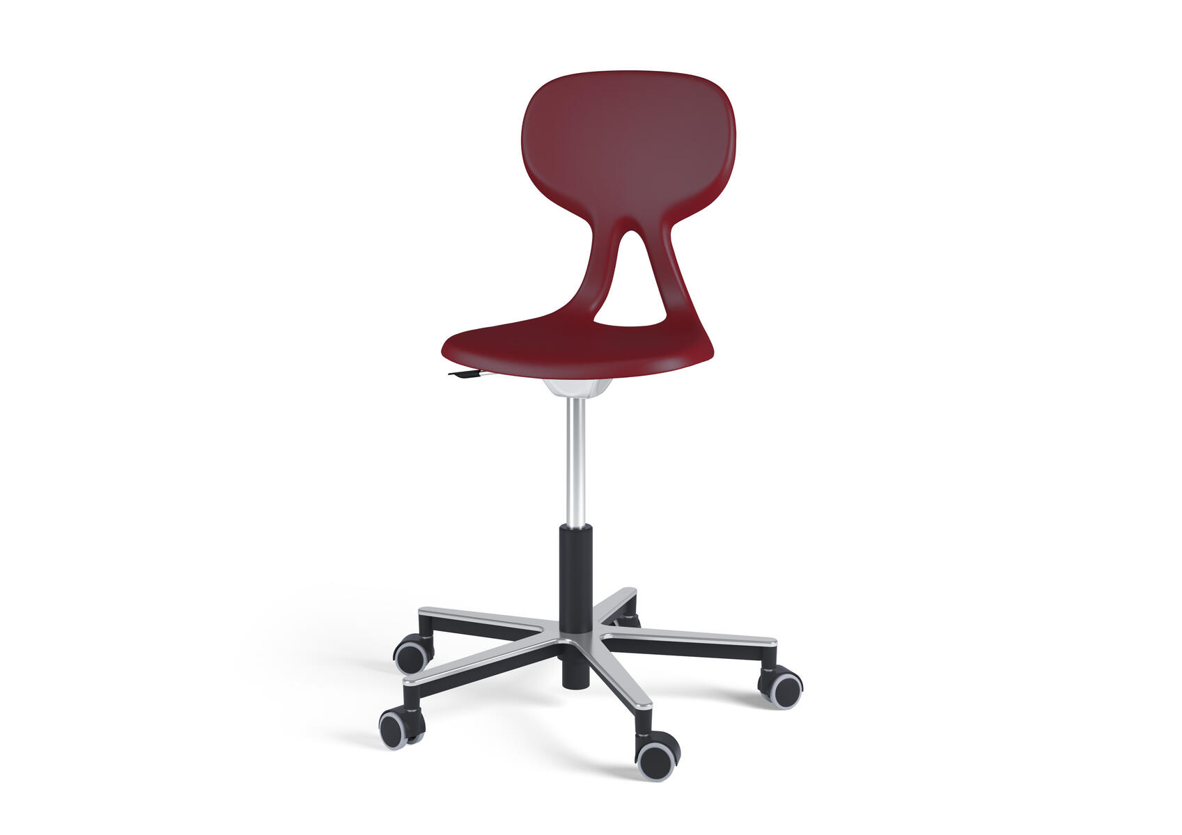 Det ergonomiska utförandet hjälper användaren till en bättre hållning och ger ett flexibelt stöd för ryggen. Moviflexmekanismen gör att man kan vippa på sitsen åt alla håll, vilket uppmuntrar ett aktivt sittande. Lätt att rengöra. Skal i polyuretan. Borstat aluminiumkryss med hjul. Mått: Sitthöjd 38-50 cm. Sitsbredd 38 cm. Sitsdjup 34 cm.