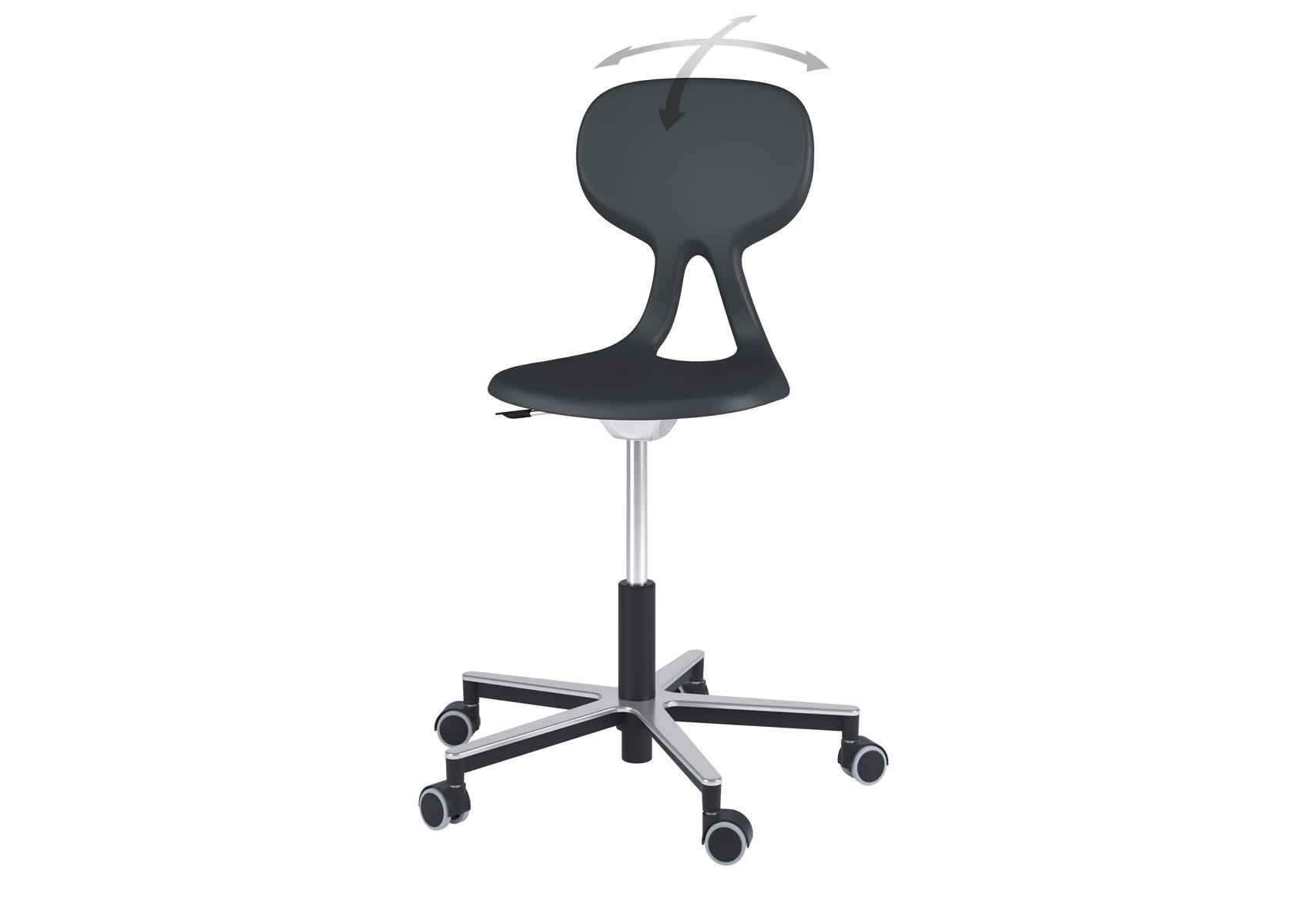 Det ergonomiska utförandet hjälper användaren till en bättre hållning och ger ett flexibelt stöd för ryggen. Moviflexmekanismen gör att man kan vippa på sitsen åt alla håll, vilket uppmuntrar ett aktivt sittande. Lätt att rengöra. Skal i polyuretan. Borstat aluminiumkryss med hjul. Mått: Sitthöjd 50-70 cm. Sitsbredd 38 cm. Sitsdjup 34 cm.