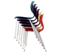 Det ergonomiska utförandet hjälper användaren till en bättre hållning och ger ett flexibelt stöd för ryggen. Stapelbar och upphängningsbar när man vänder den. Lätt att rengöra. Skal i polyuretan. Silverlackerat stativ RAL 9006. Mått: Sitthöjd 33 cm. Sitsbredd 38 cm. Sitsdjup 34 cm.