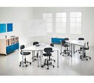 Det ergonomiska utförandet hjälper användaren till en bättre hållning och ger ett flexibelt stöd för ryggen. Stapelbar och upphängningsbar när man vänder den. Lätt att rengöra. Skal i polyuretan. Vitlackerat stativ RAL 9003. Mått: Sitthöjd 45 cm. Sitsbredd 44 cm. Sitsdjup 40 cm.
