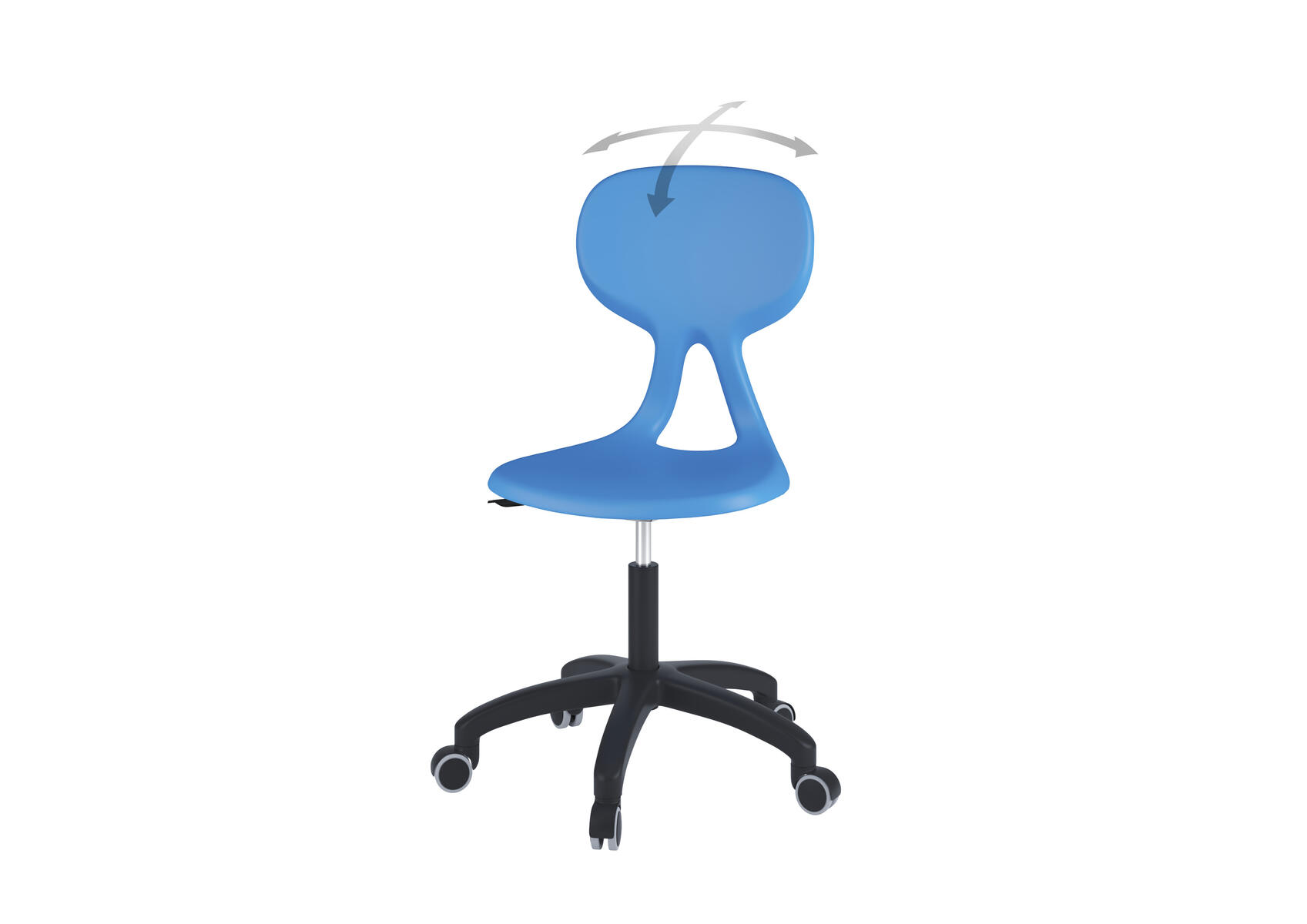 Det ergonomiska utförandet hjälper användaren till en bättre hållning och ger ett flexibelt stöd för ryggen. Moviflexmekanismen gör att man kan vippa på sitsen åt alla håll, vilket uppmuntrar ett aktivt sittande. Lätt att rengöra. Skal i polyuretan. Svart plastkryss med hjul. Mått: Sitthöjd 38-50 cm. Sitsbredd 38 cm. Sitsdjup 34 cm.