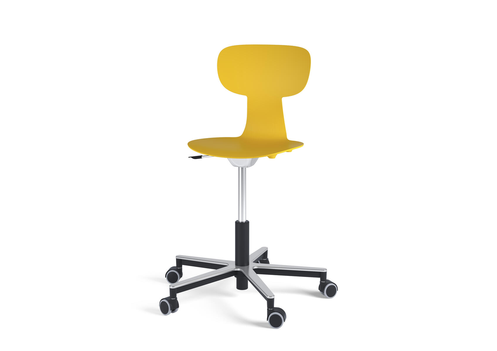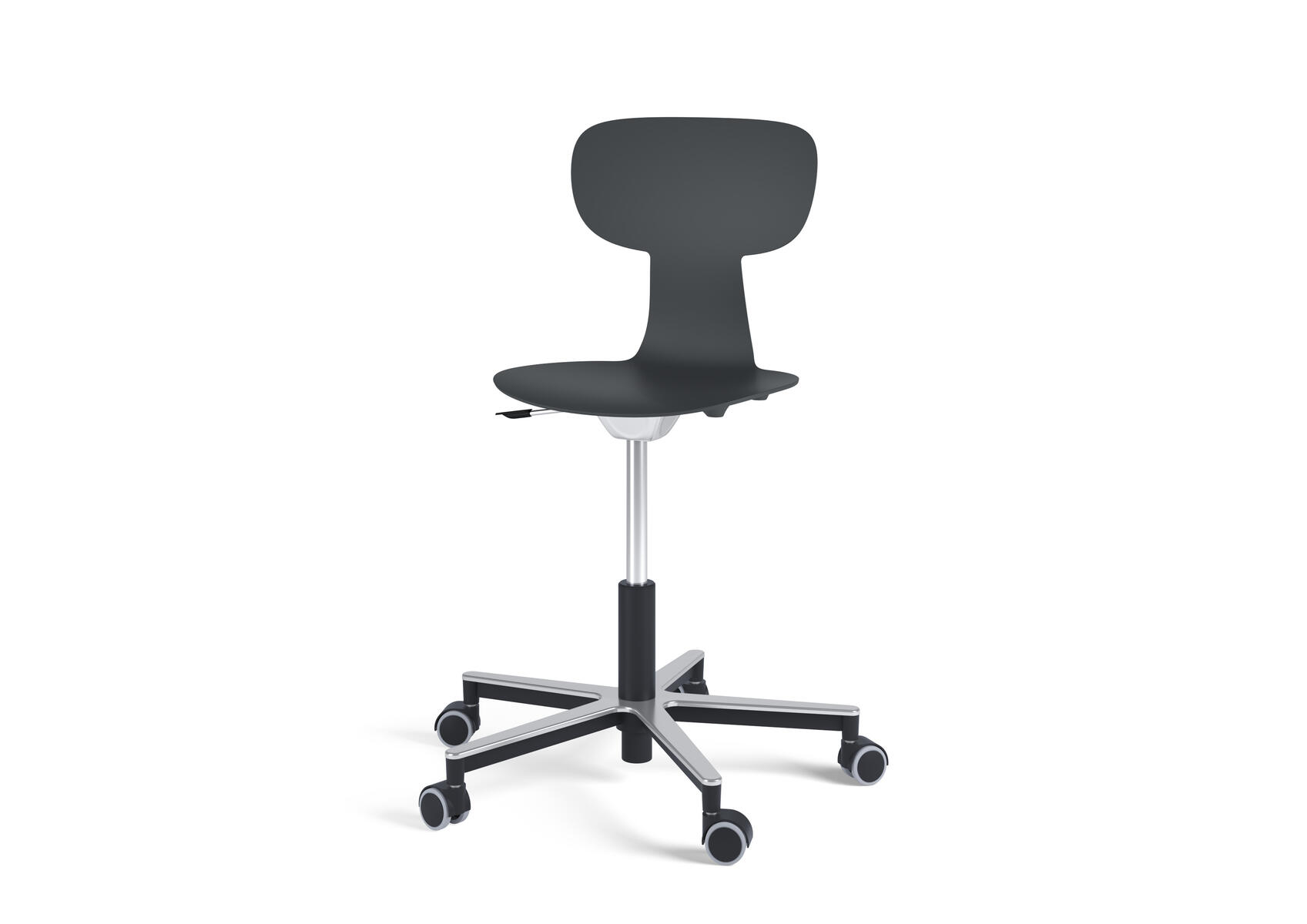 Stol som ger ett flexibelt stöd för ryggen. Lätt att rengöra. Skal i polyuretan. Svart aluminiumkryss i borstad yta samt tysta hjul.
