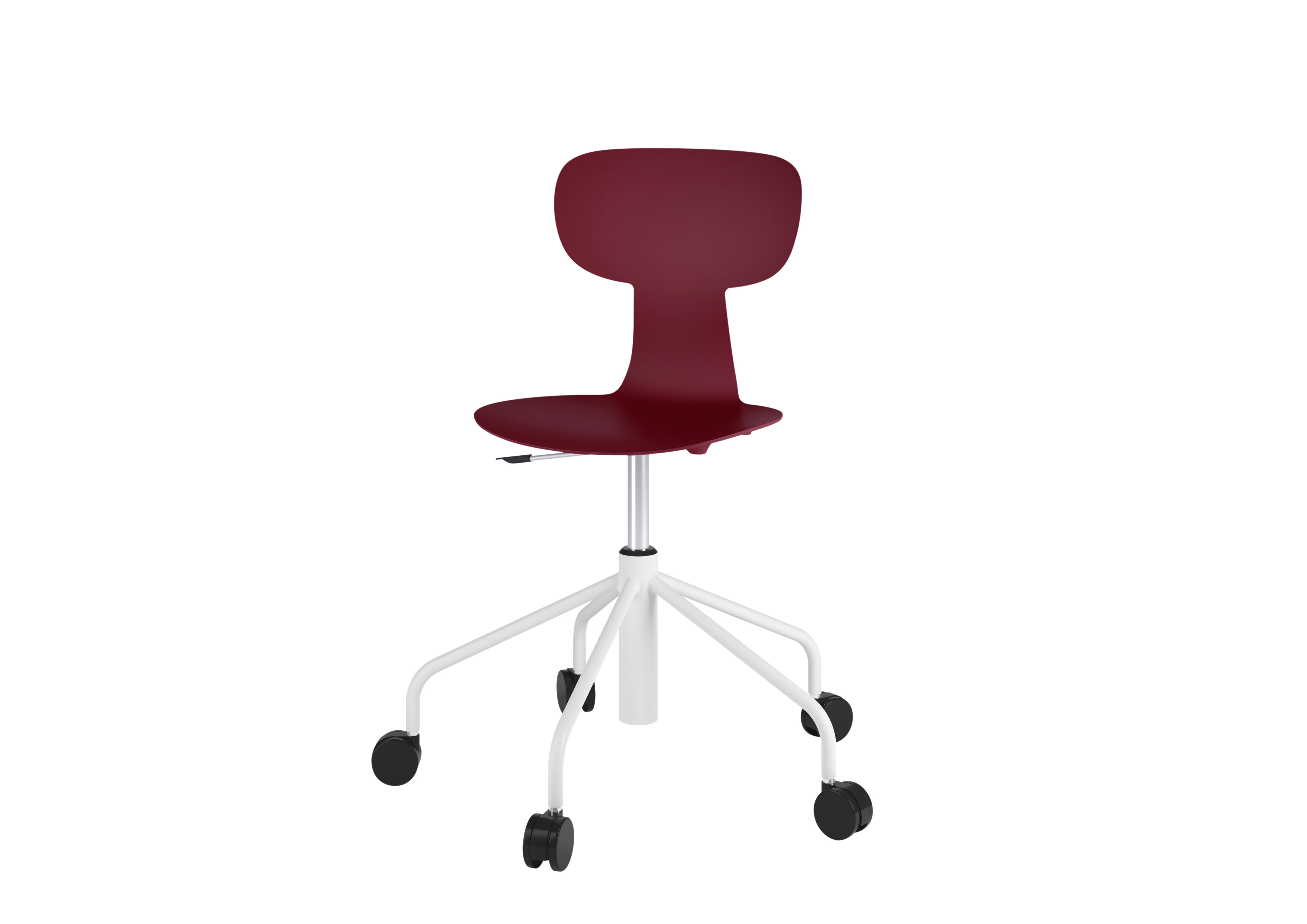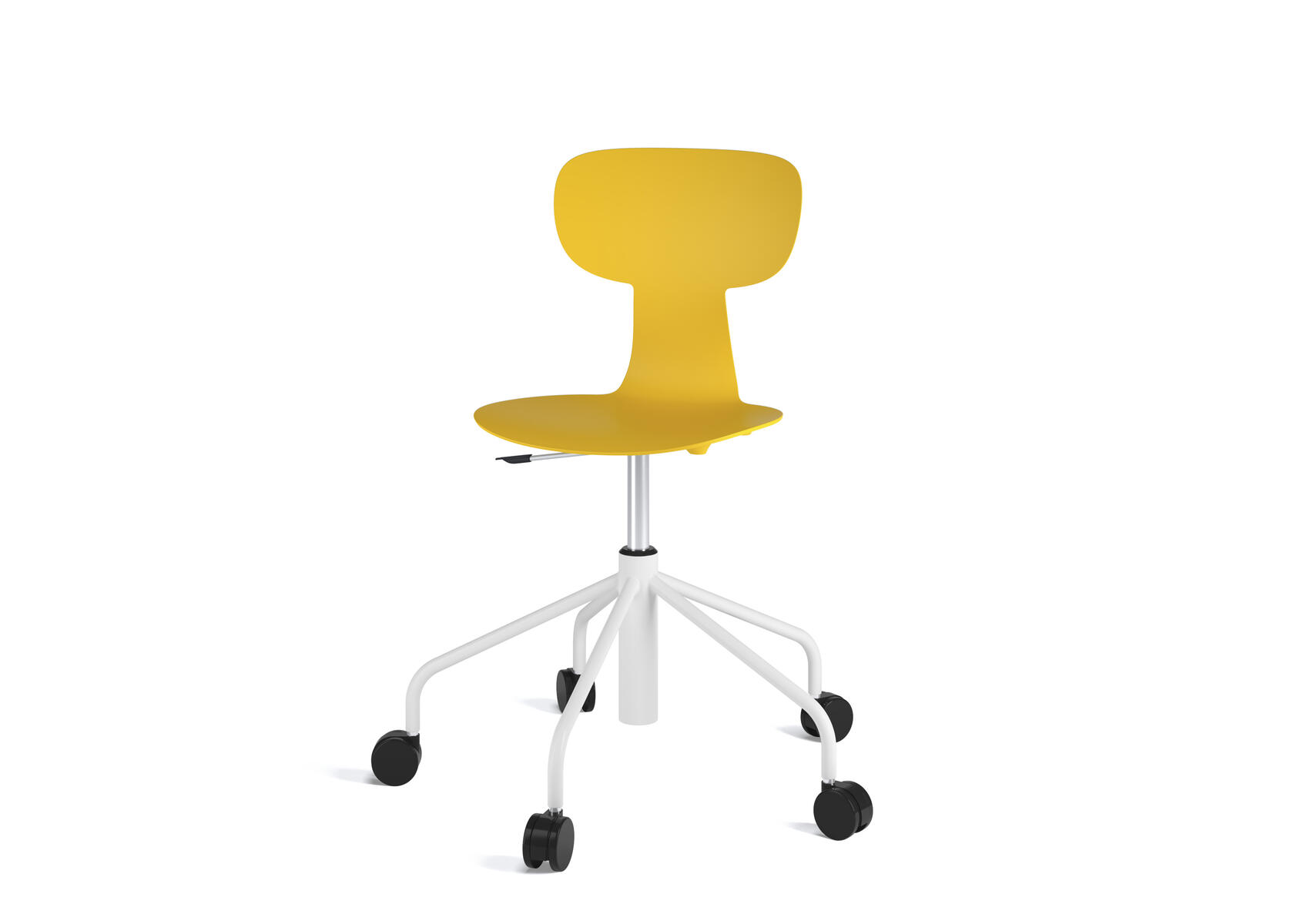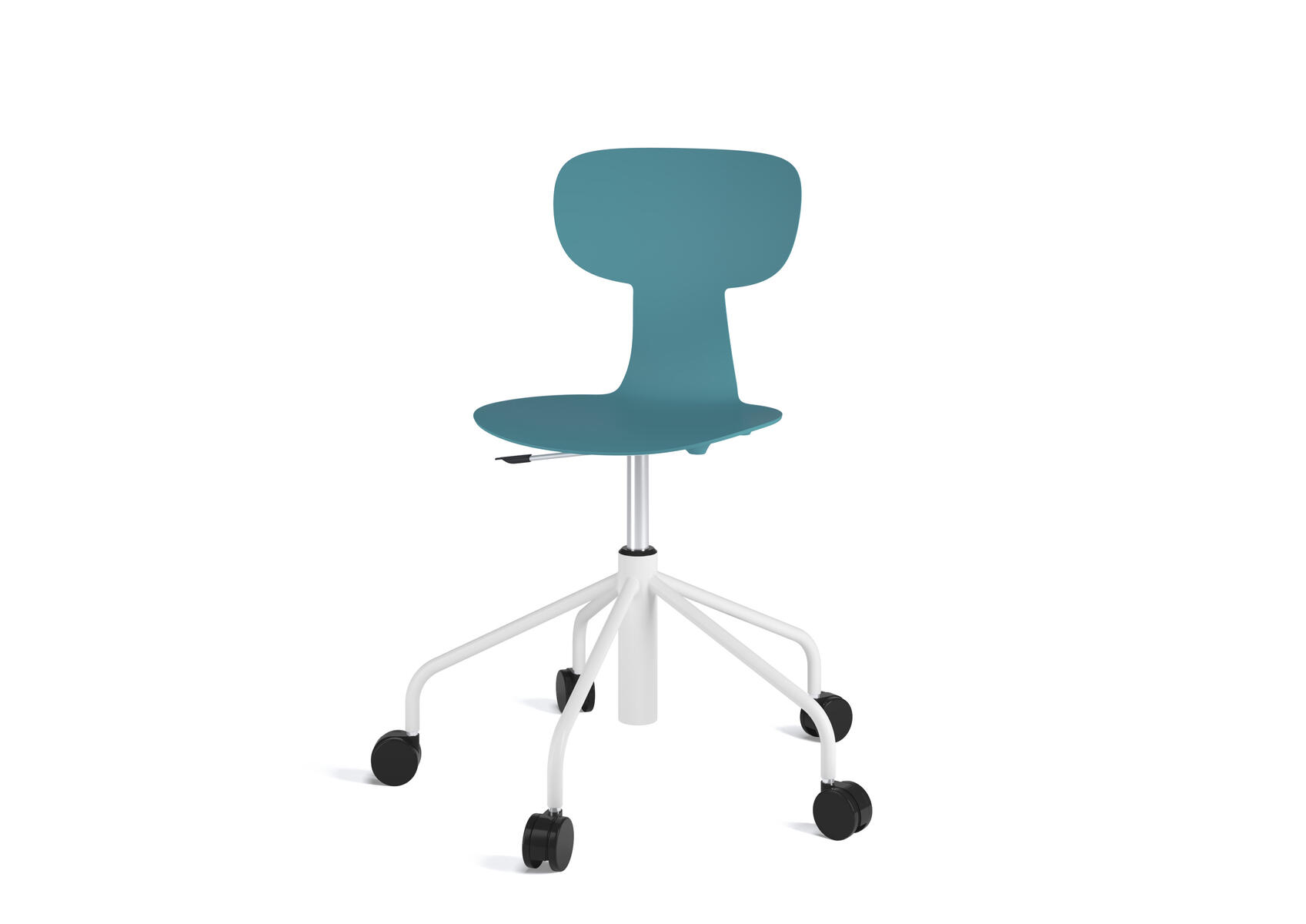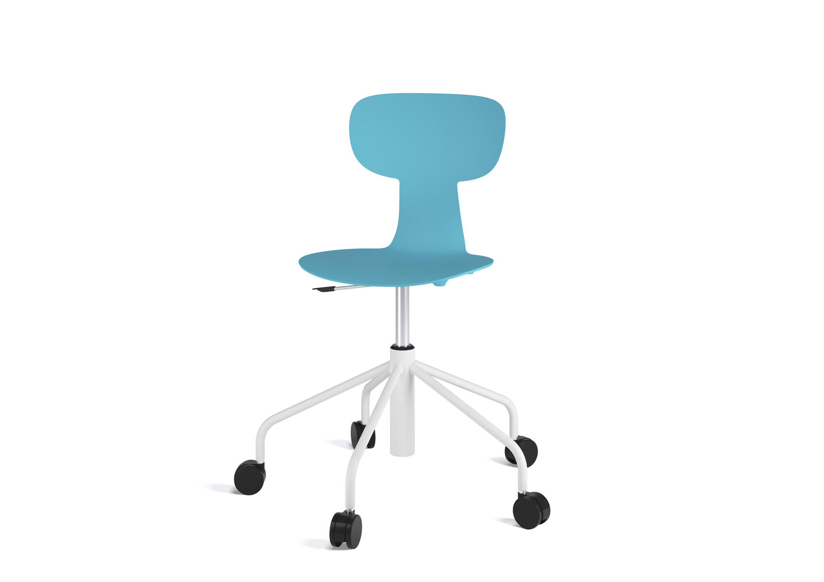 Stol Take med ett högt 5-krysstativ på hjul lackerat i RAL 9003. Sitthöjd justeras med gasfjäder i intervallerna 46-57. Plastskalet ger ett flexibelt stöd för ryggen. Lätt att rengöra. Skal i polyuretan.