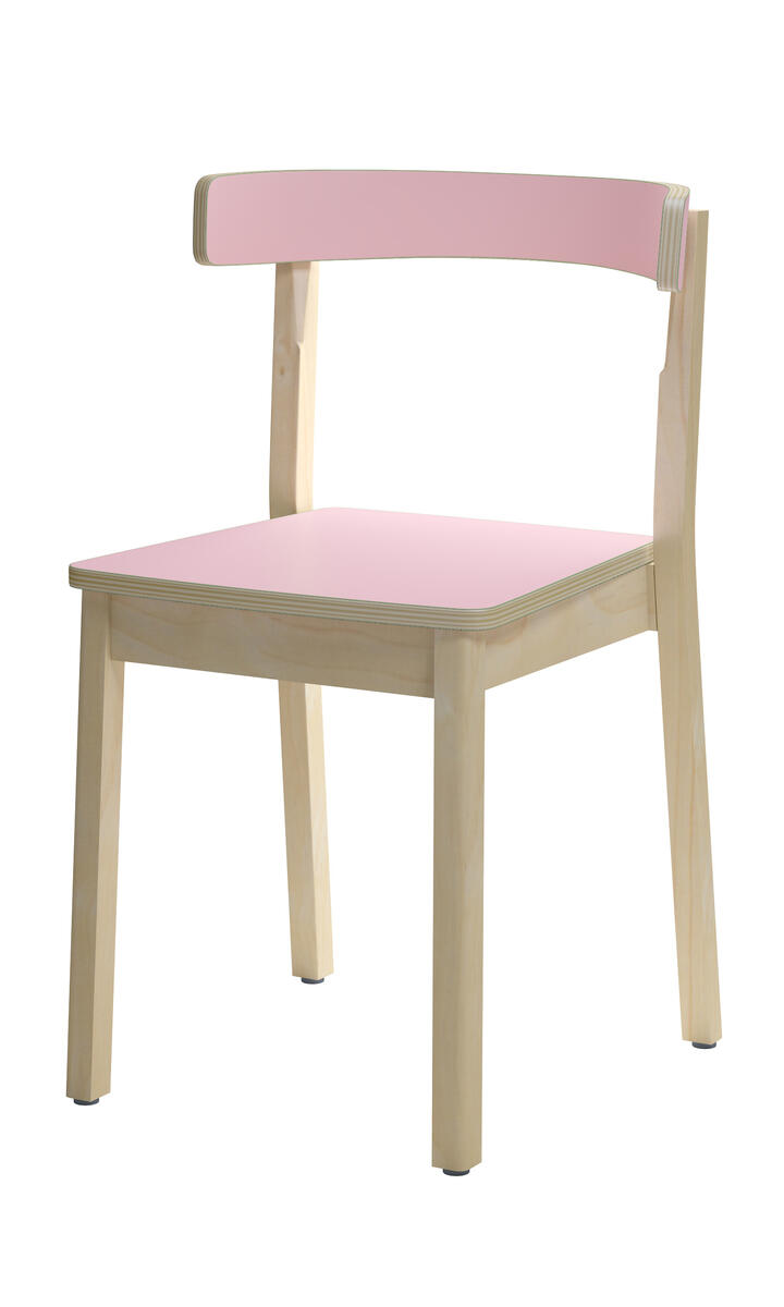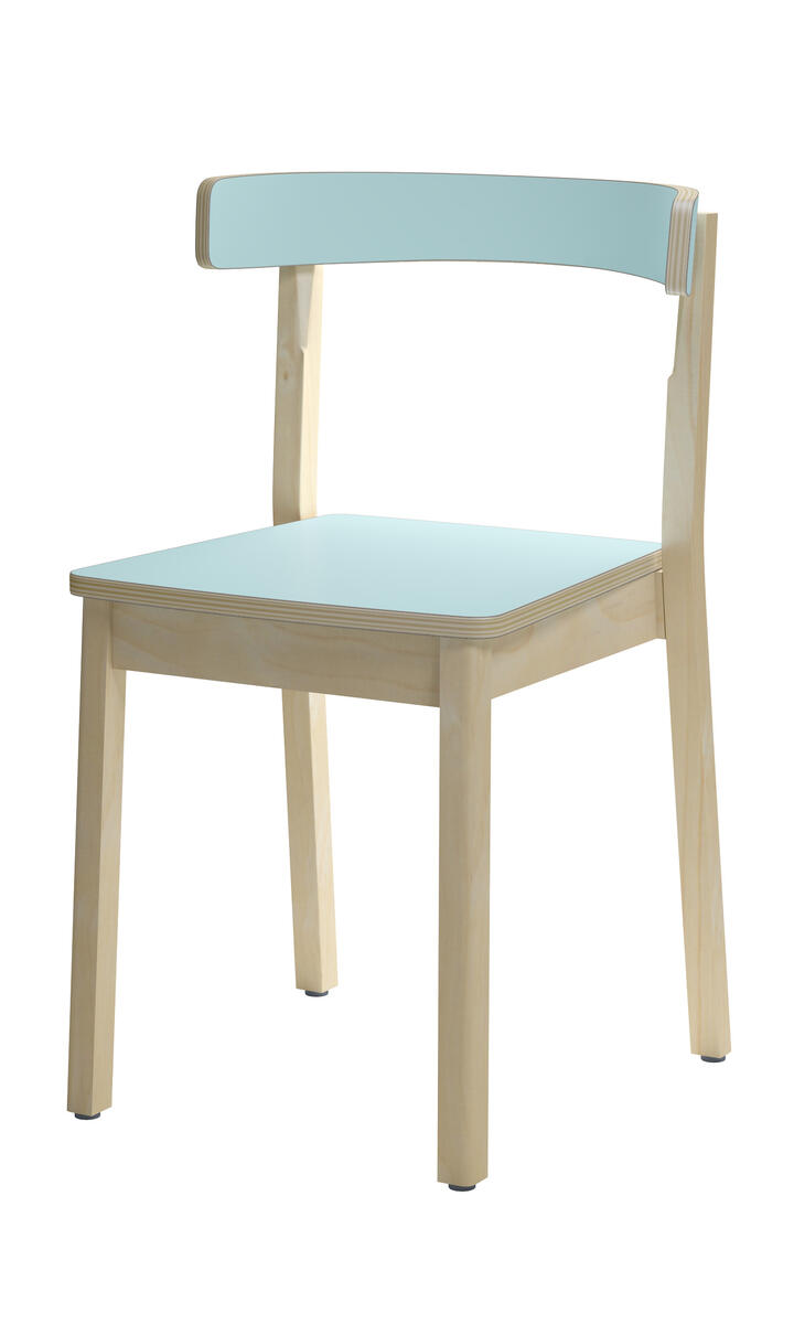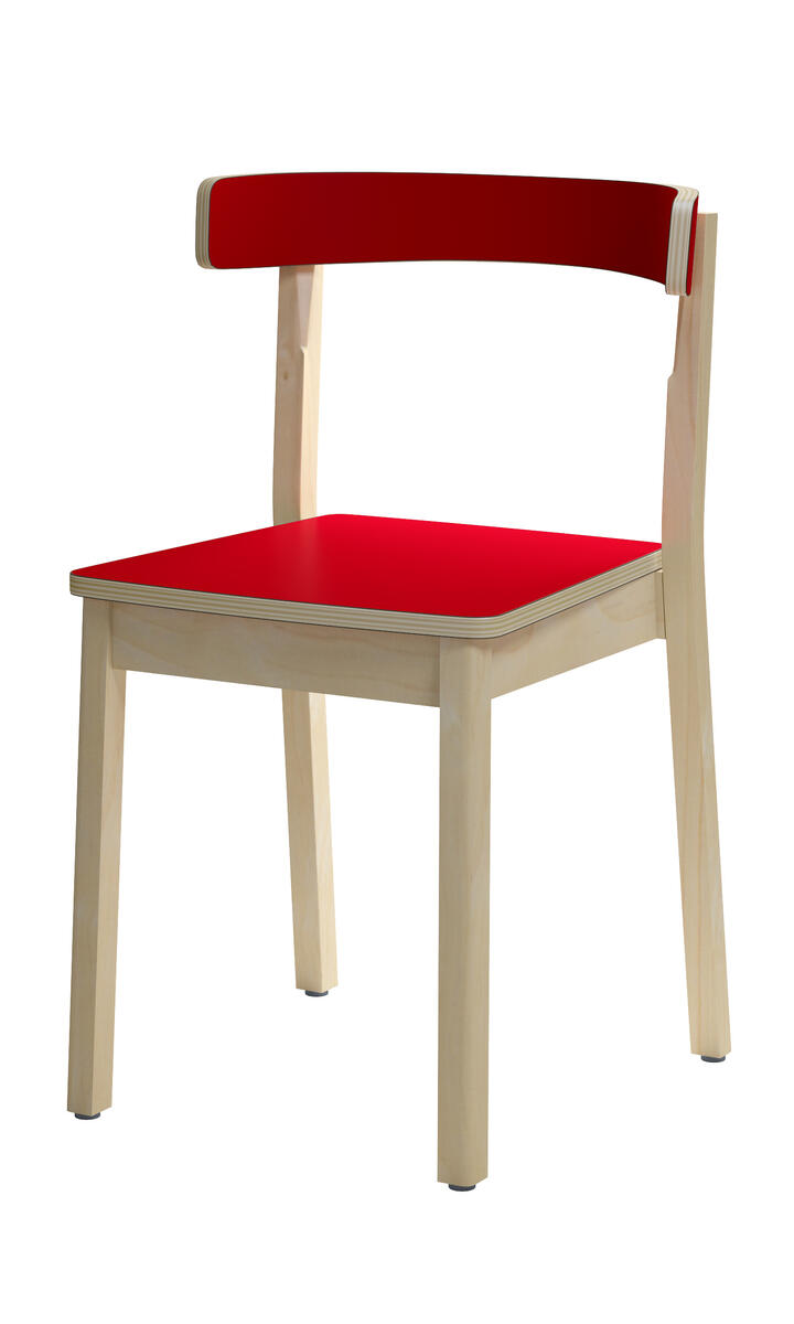 Lackerad stapelbar stol (max 6/stapel) och stabil för upphängning. Sitthöjd 45 cm, sittdjup 41 cm och totalbredd 50 cm. Vikt 4,5 kg. Sits i formpressad björk.