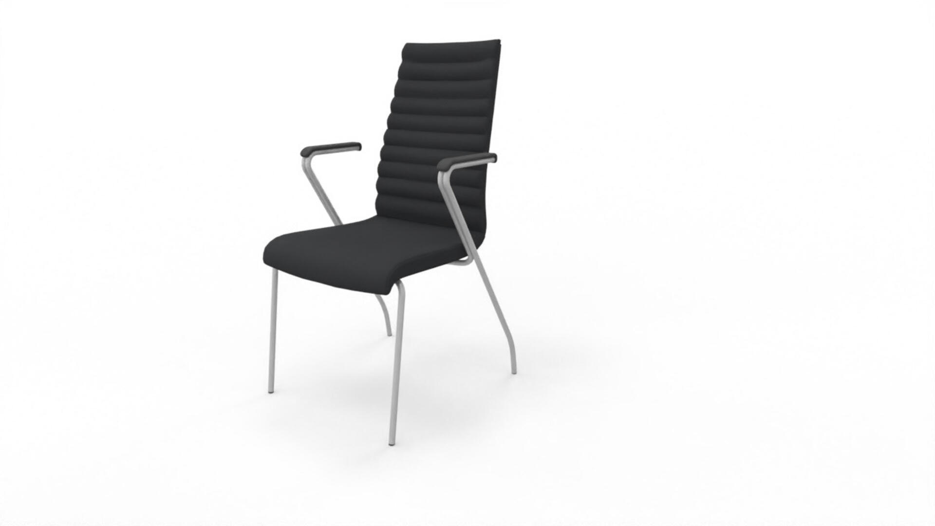 Stilren och funktionell stol med en quiltad, hög rygg och en sittdel av formpressad faner klädd med kallskum, vilket ger både komfort och stöd. Stabilt pulverlackat stativ av ø 19 mm rör med filtbelagda möbeltassar för att skydda golvet. Stolen är stapelbar, max 5 i höjd. Armstöd som tillval.
