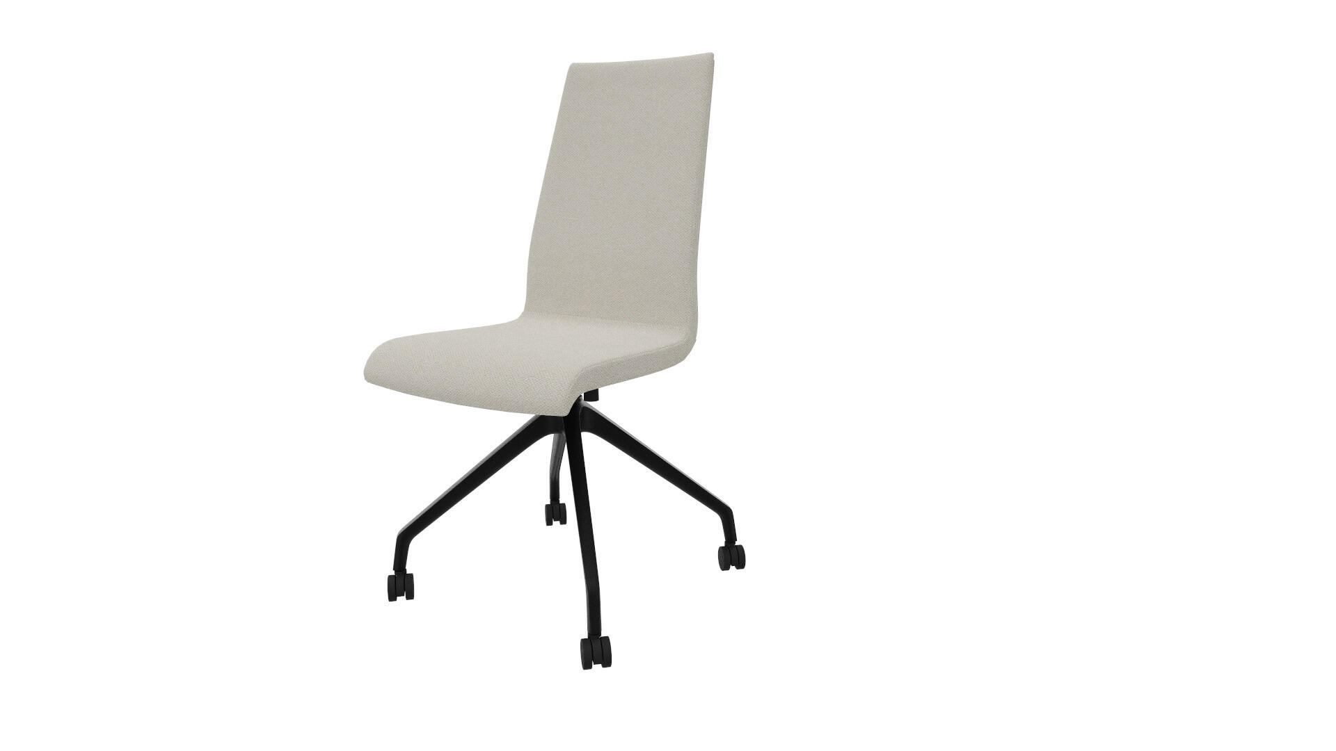 Stilren och funktionell stol med en slät, medelhög rygg och en sittdel av formpressad faner klädd med kallskum, vilket ger både komfort och stöd. Svart nylonkryss med 4 hårda hjul för mjuka golv.
