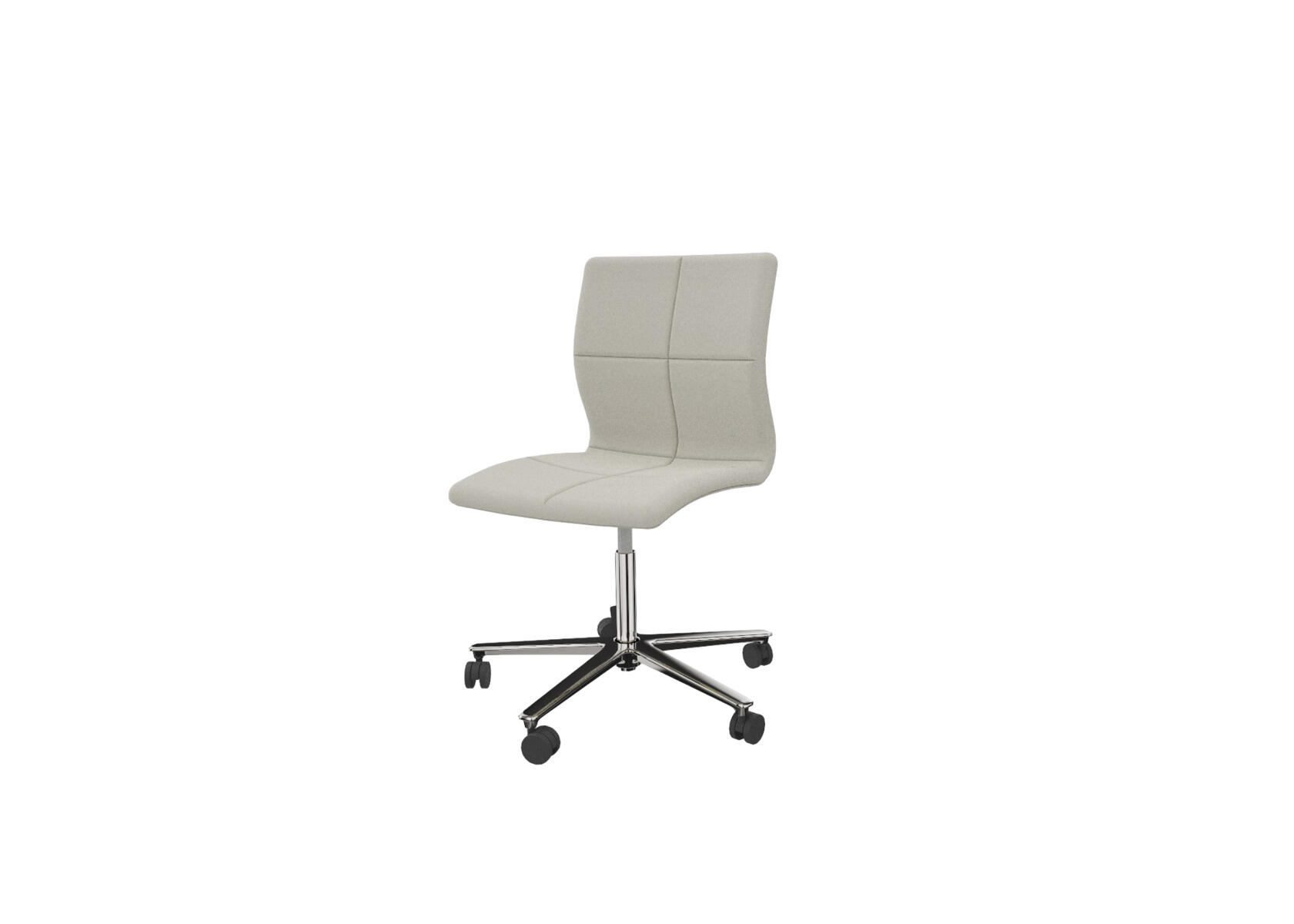 En tidlös, ergonomisk och bekväm stol med en quiltad, låg rygg och en sittdel av formpressad faner klädd med kallskum, vilket ger både komfort och stöd. Tiltmekanism 7° bakåt, 4° framåt. Polerat metallkryss med 4 hårda hjul för mjuka golv. Armstöd som tillval.