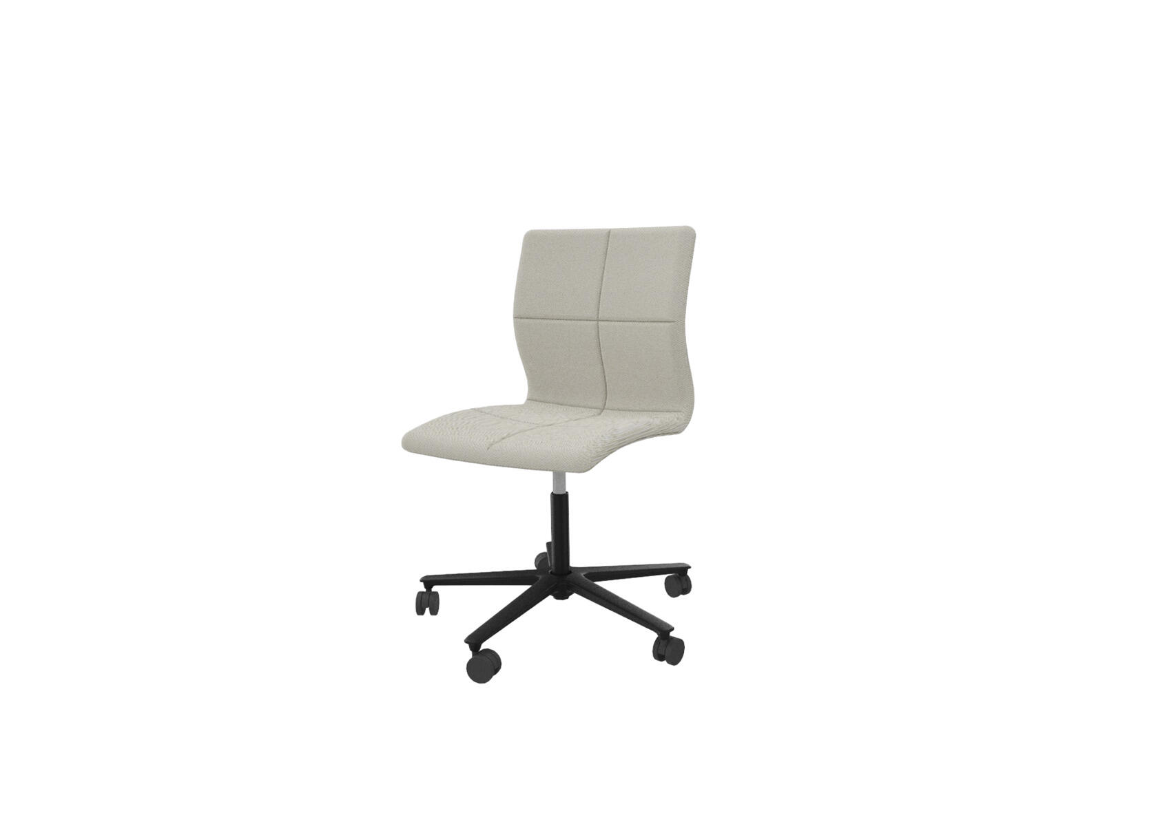En tidlös, ergonomisk och bekväm stol med en quiltad, låg rygg och en sittdel av formpressad faner klädd med kallskum, vilket ger både komfort och stöd. Tiltmekanism 7° bakåt, 4° framåt. Svart metallkryss med 4 hårda hjul för mjuka golv. Armstöd som tillval.
