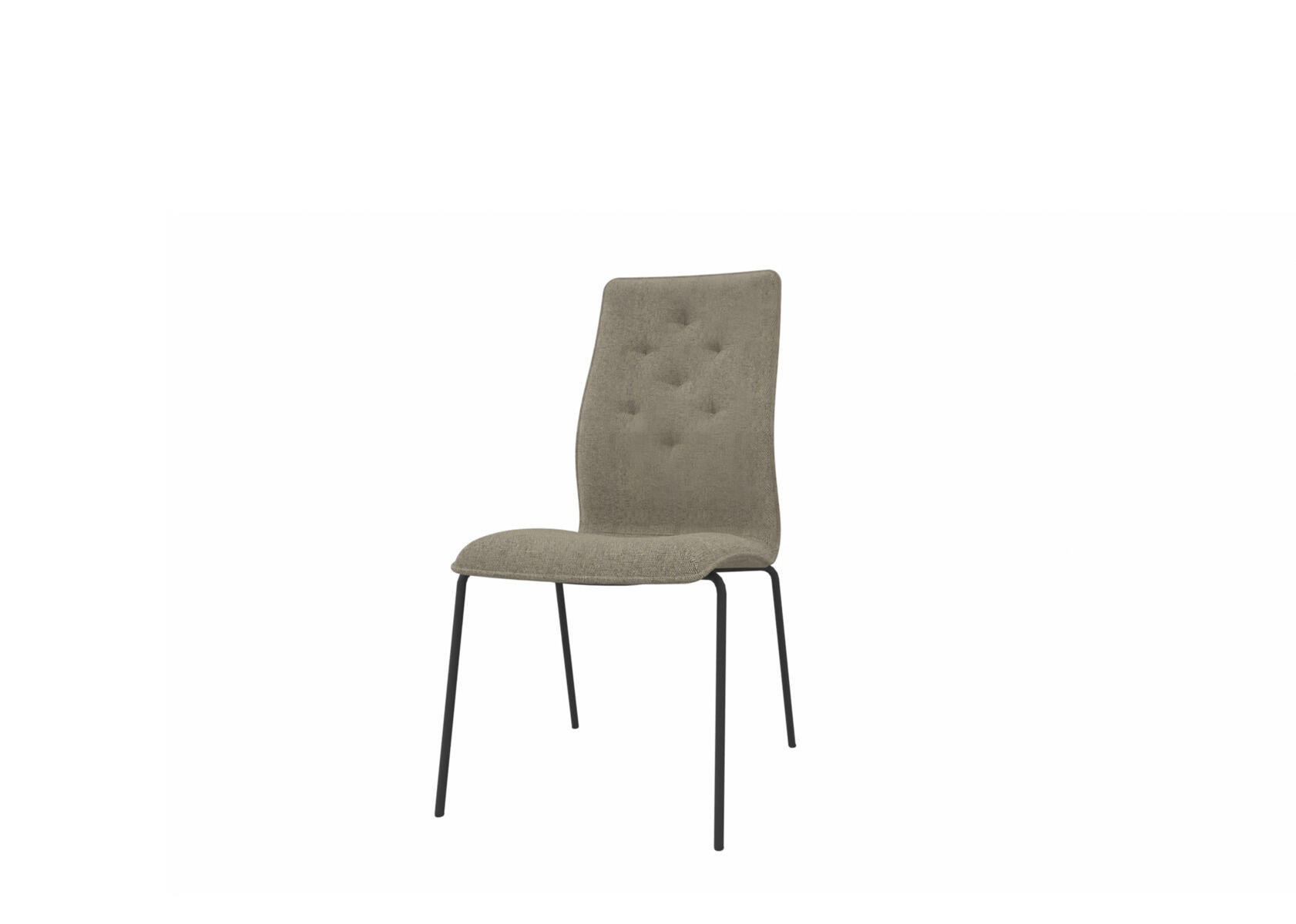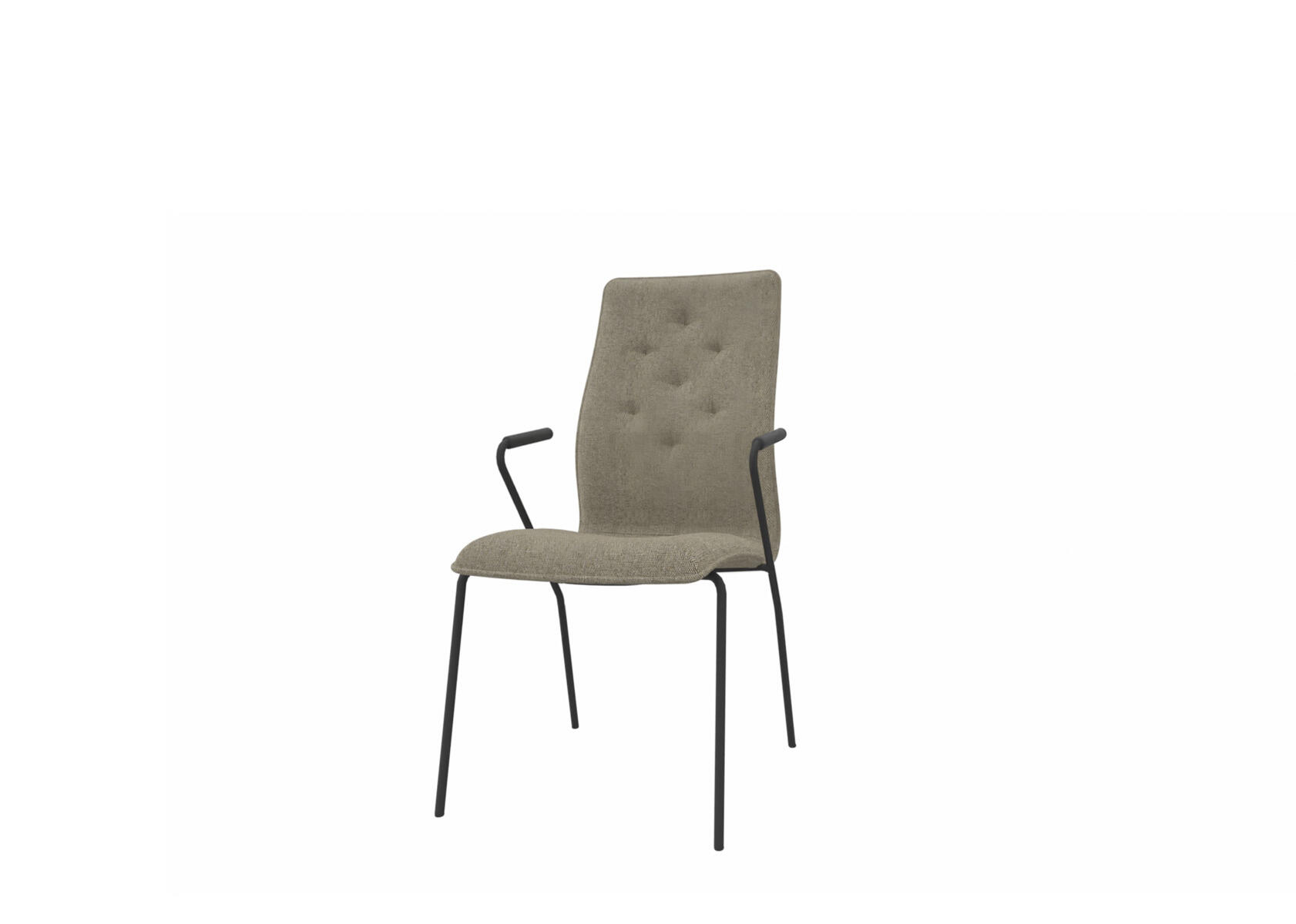 En tidlös, ergonomisk och bekväm stol med en pikerad hög rygg och en sittdel av formpressad faner klädd med kallskum, vilket ger både komfort och stöd. Stabilt pulverlackat stativ av ø 19 mm rör med filtbelagda möbeltassar för att skydda golvet. Stolen är stapelbar, max 5 i höjd. Armstöd som tillval.