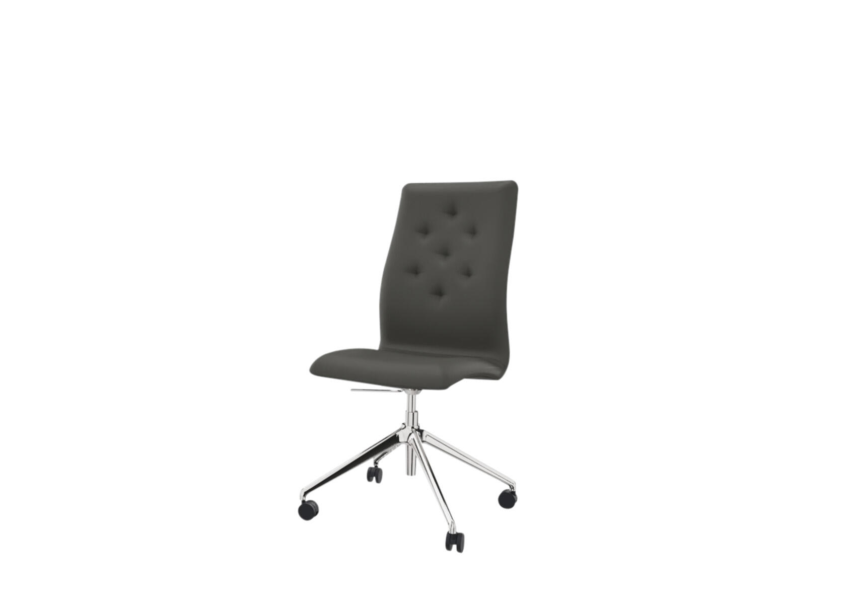 En tidlös, ergonomisk och bekväm stol med en quiltad, låg rygg och en sittdel av formpressad faner klädd med kallskum, vilket ger både komfort och stöd. Tiltmekanism 7° bakåt, 4° framåt. Polerat metallkryss med 4 hårda hjul för mjuka golv. Armstöd som tillval.