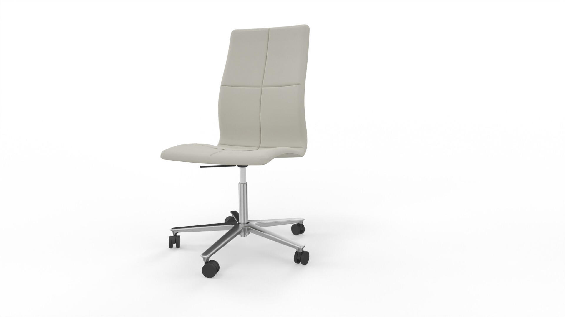 En tidlös, ergonomisk och bekväm stol med en quiltad, låg rygg och en sittdel av formpressad faner klädd med kallskum, vilket ger både komfort och stöd. Tiltmekanism 7° bakåt, 4° framåt. Polerat metallkryss med 4 hårda hjul för mjuka golv. Armstöd som tillval.