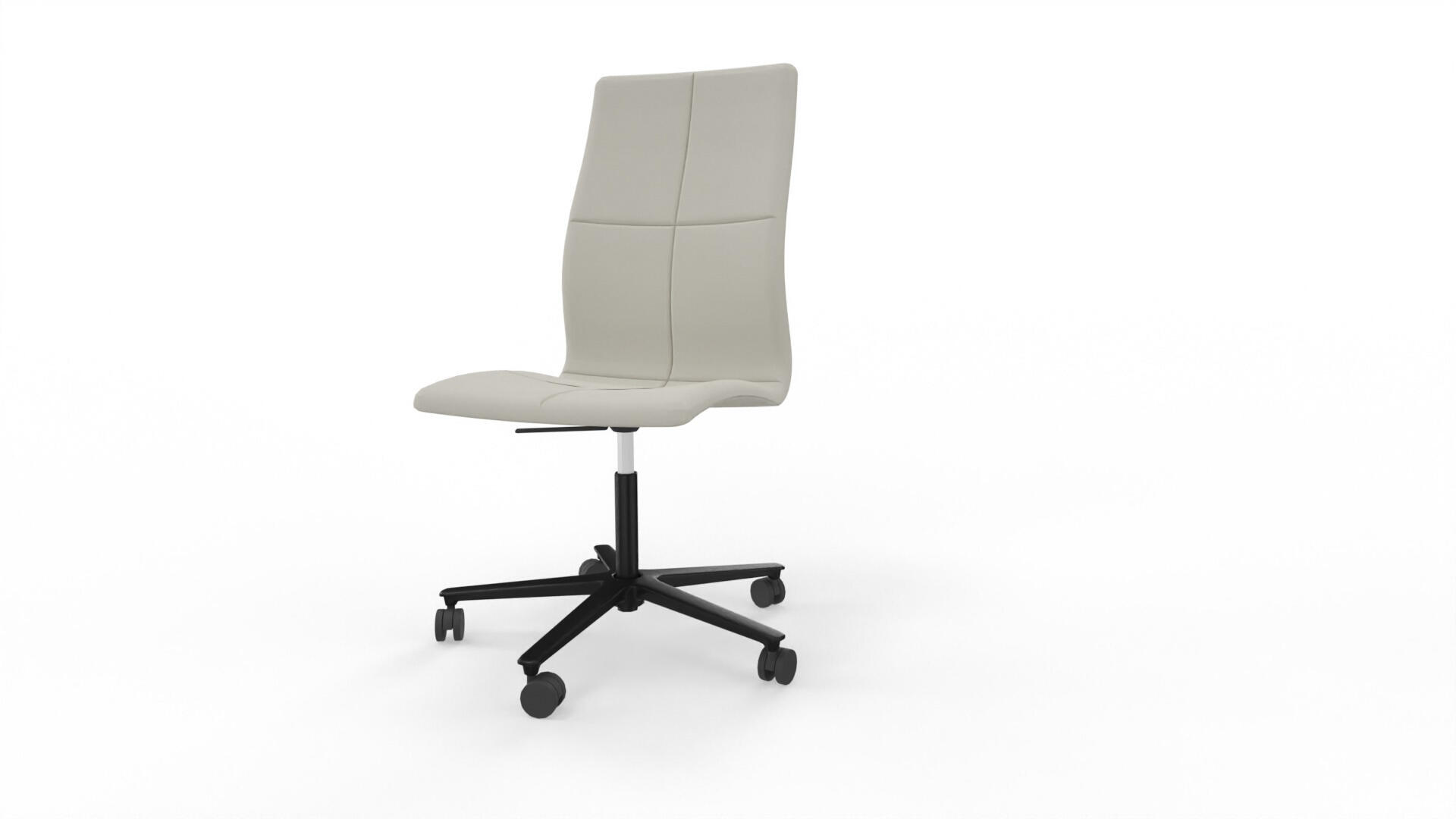 En tidlös, ergonomisk och bekväm stol med en quiltad, låg rygg och en sittdel av formpressad faner klädd med kallskum, vilket ger både komfort och stöd. Tiltmekanism 7° bakåt, 4° framåt. Svart metallkryss med 4 hårda hjul för mjuka golv. Armstöd som tillval.