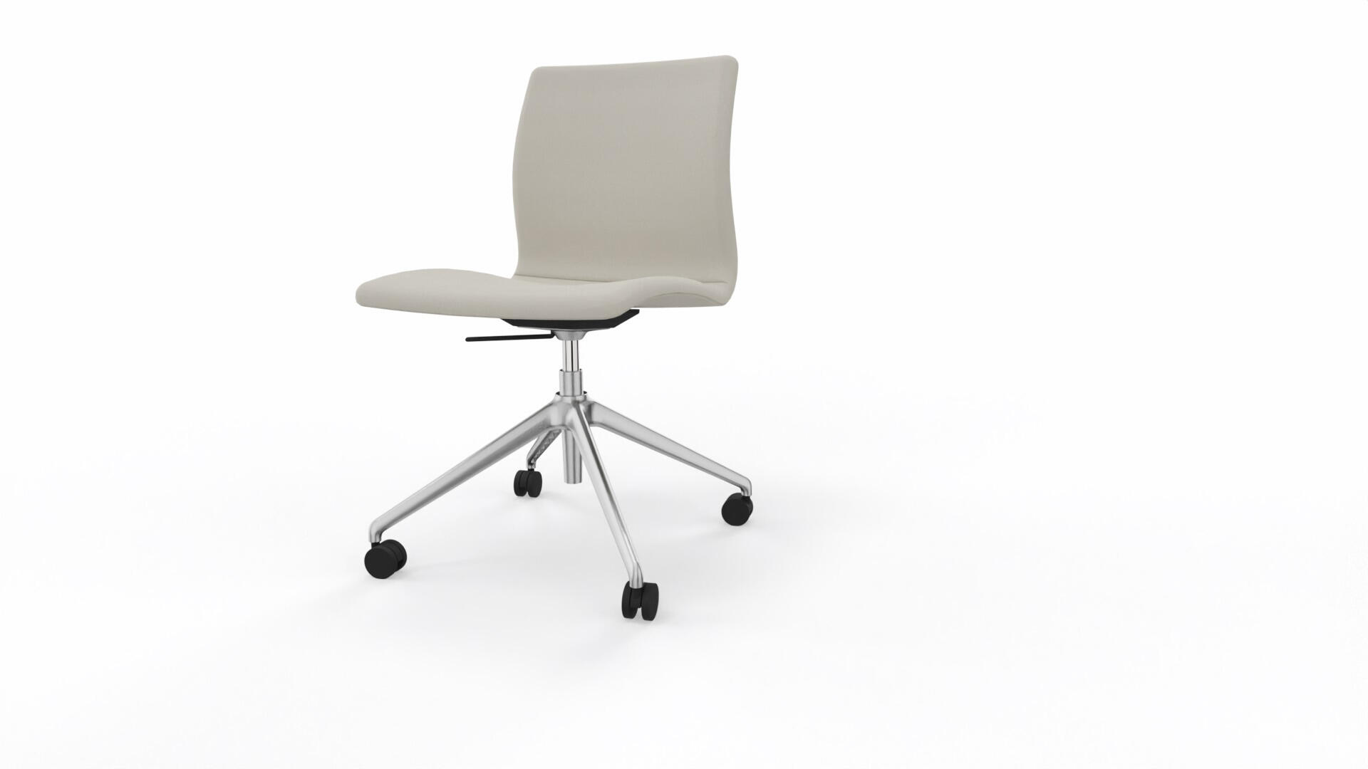 En tidlös, ergonomisk och bekväm stol med en slät, låg rygg och en sittdel av formpressad faner klädd med kallskum, vilket ger både komfort och stöd. Tiltmekanism 7° bakåt, 4° framåt. Polerat metallkryss med 4 hårda hjul för mjuka golv. Armstöd som tillval.