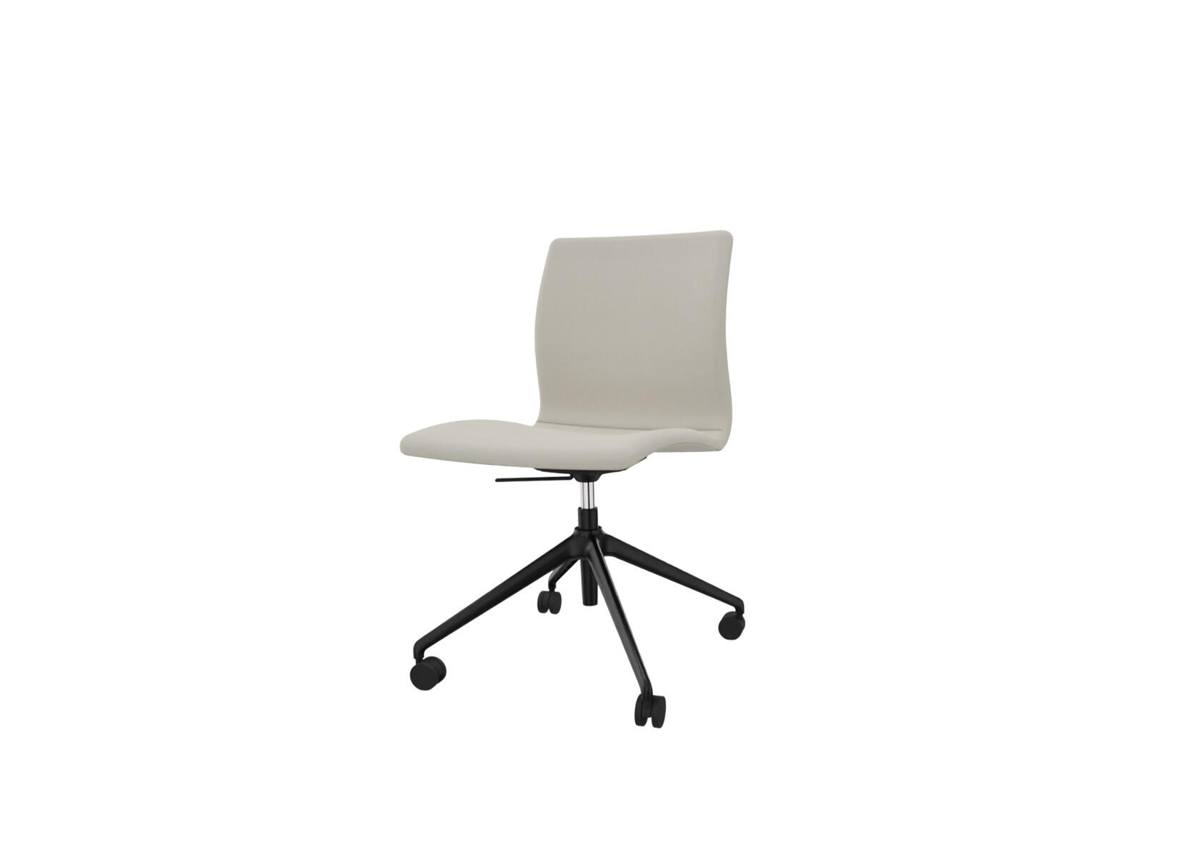 Stilren och funktionell stol med en slät, medelhög rygg och en sittdel av formpressad faner klädd med kallskum, vilket ger både komfort och stöd. Svart nylonkryss med 4 hårda hjul för mjuka golv.