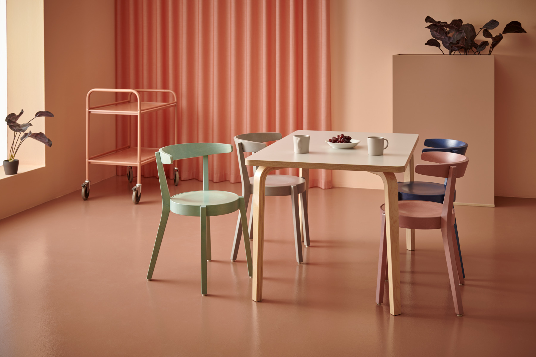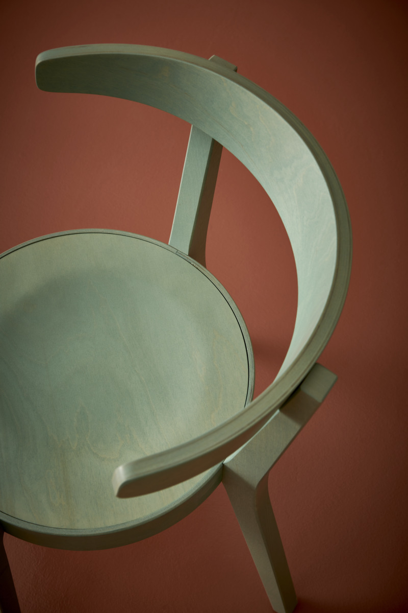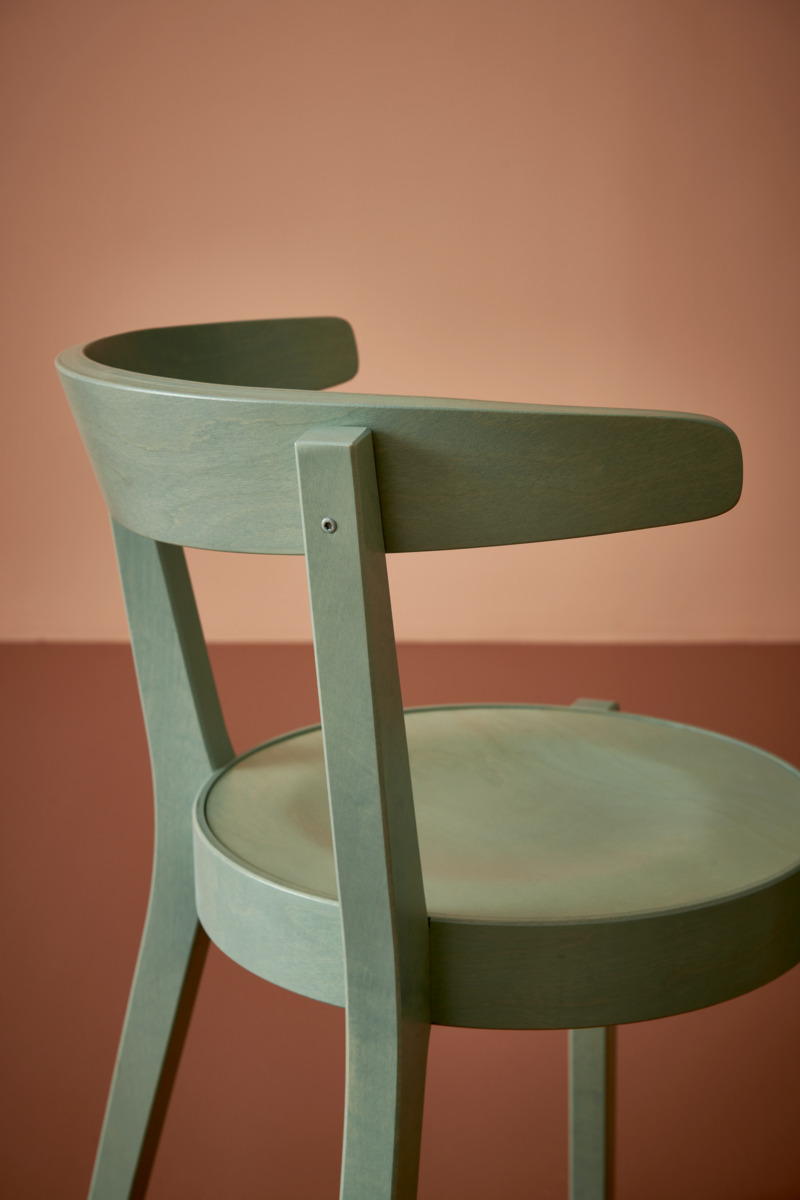 Massiv björk med formpressad sits och rygg. Skålad sits som är belagd med linoleum. Med ljuddämpning under sitsen. Stapel- och upphängningsbar. Sitthöjd 45 cm.