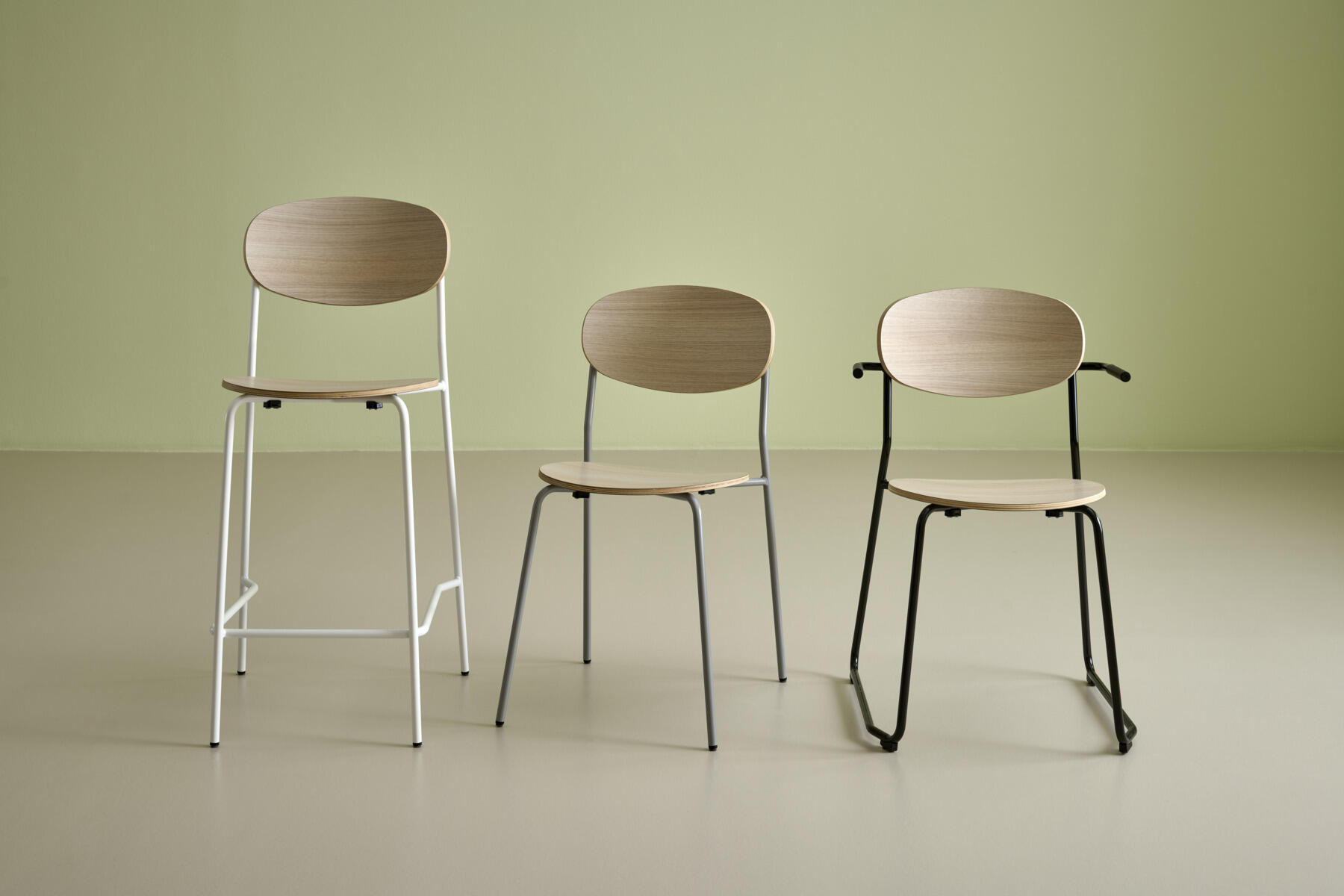 Stol Collab med stativ tillverkat av 16 mm rör, pulverlackerad i RAL 9006. Sits och rygg är i formpressad plywood för stabilitet och komfort. Produkten är testad och godkänd enligt standard EN 1729-2:2023. Stolen är stapelbar.