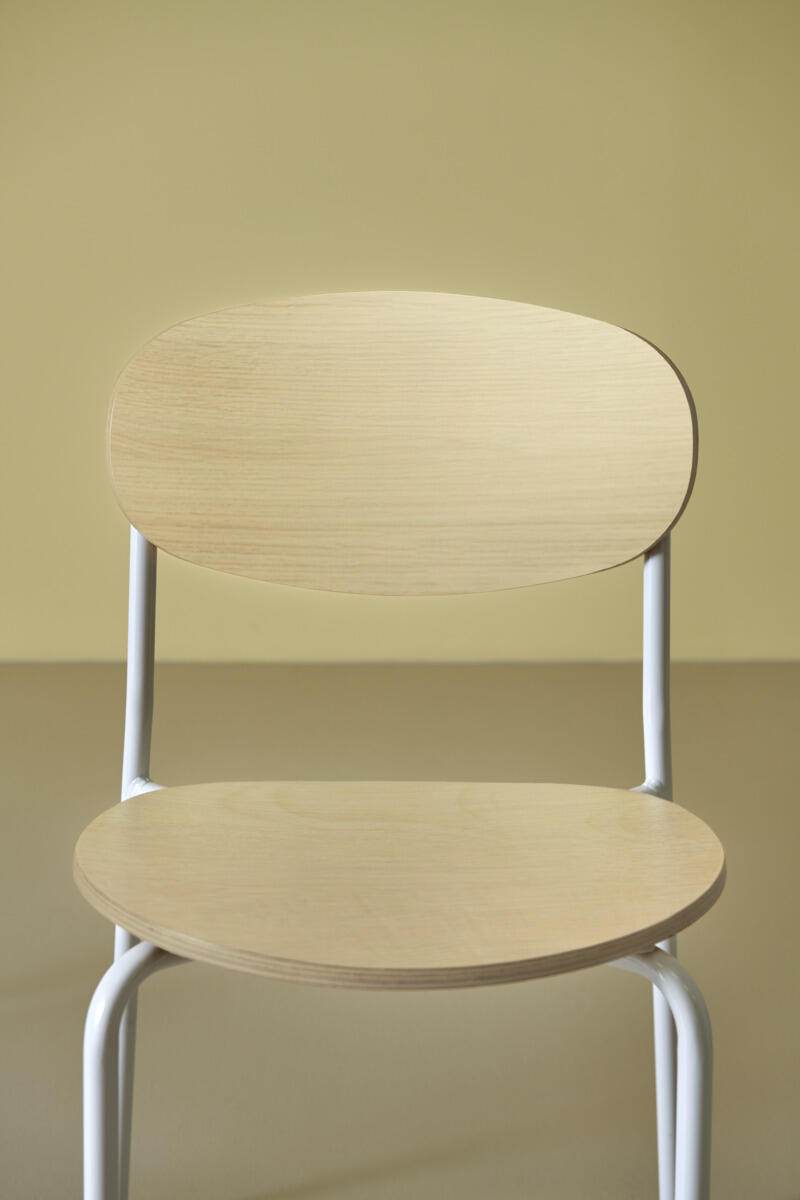 Stol Collab med stativ tillverkat av 16 mm rör, pulverlackerad i RAL 9003. Sits och rygg är i formpressad plywood för stabilitet och komfort. Produkten är testad och godkänd enligt standard EN 1729-2:2023. Stolen är stapelbar.