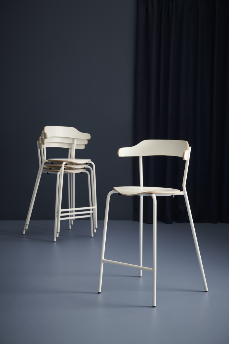 Stapelbar stol (max 8/stapel) och stabil för upphängning. Tysta tassar. Sittbredd 38,5 cm, sittdjup 38 cm och sitthöjd 43 cm. Vikt 3,75 kg. Sits och rygg i högtryckslaminat med vitlackerat stativ, RAL 9003. Testad och godkänd för offentlig miljö enligt gällande Europakrav.