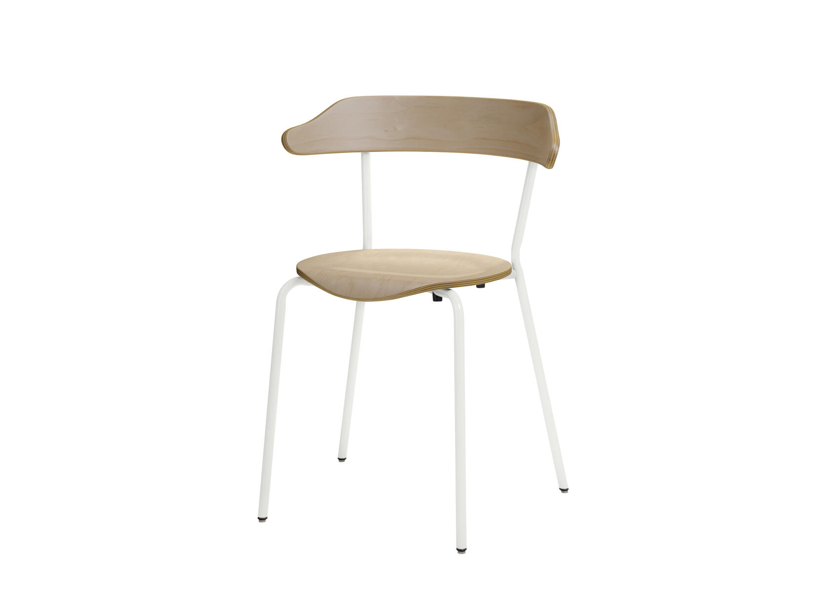 Lackerad stapelbar stol (max 6/stapel) och stabil för upphängning. Sitthöjd 45 cm, sittdjup 41 cm och totalbredd 50 cm. Vikt 4,5 kg. Sits i formpressad björk.