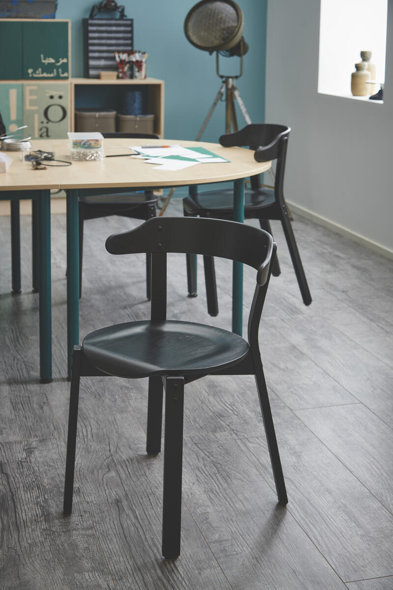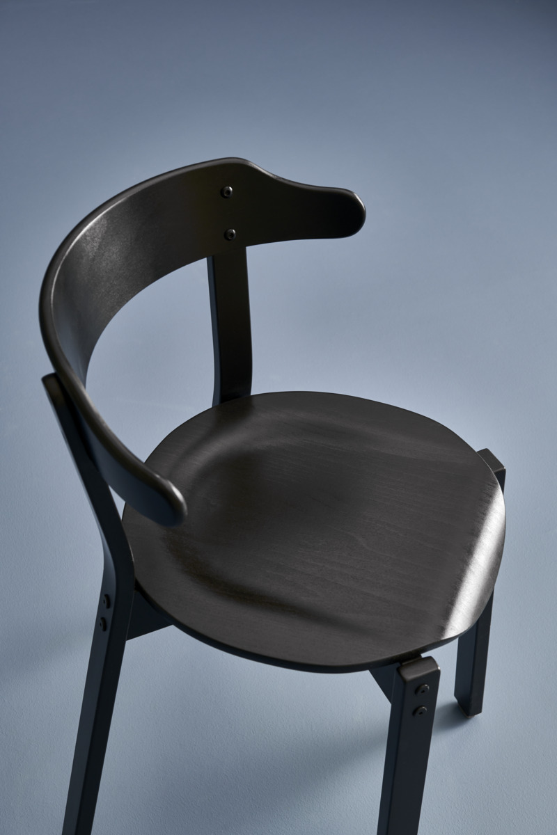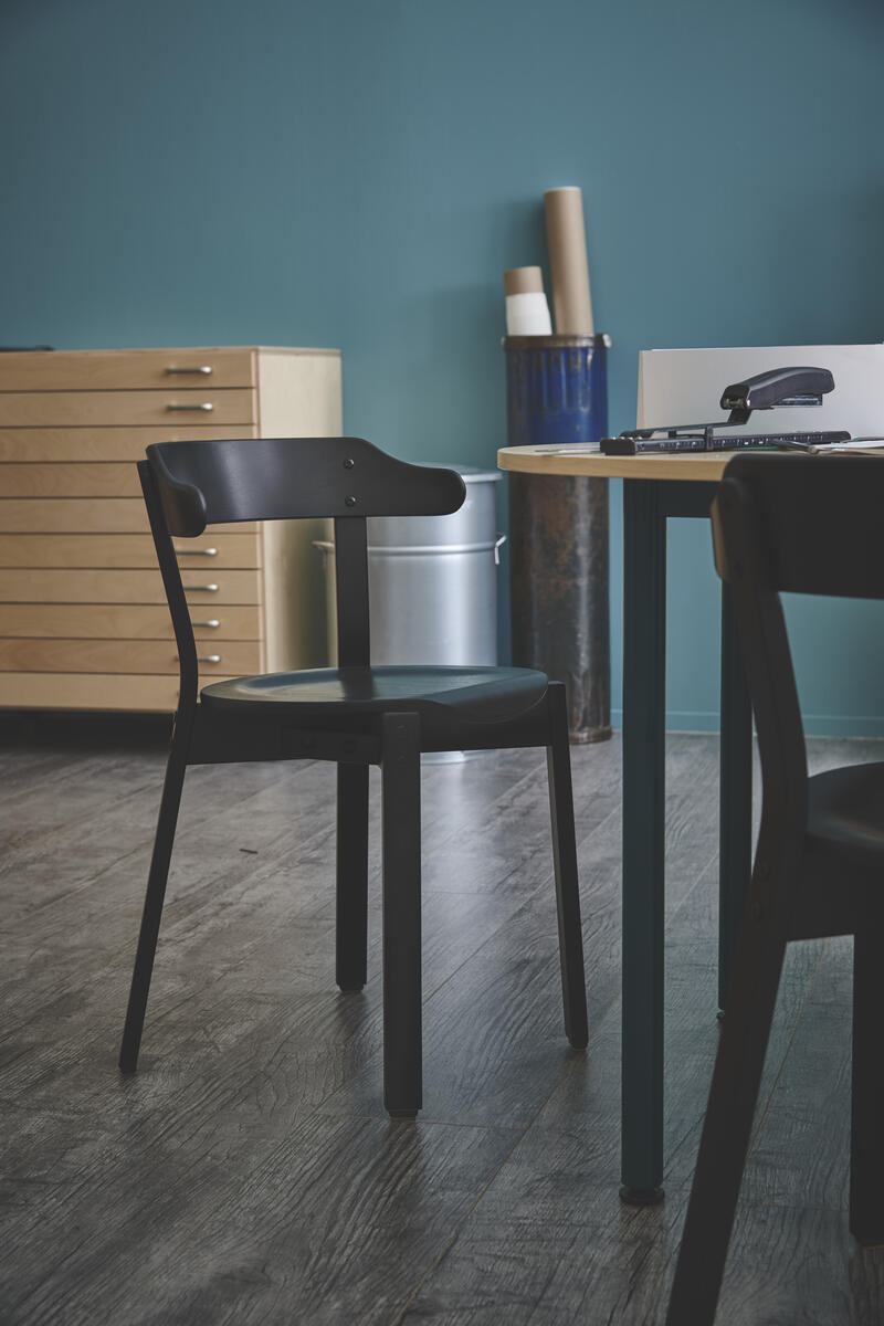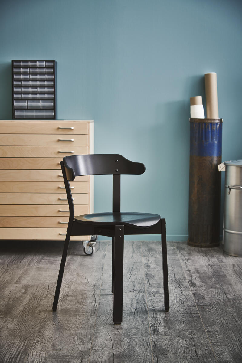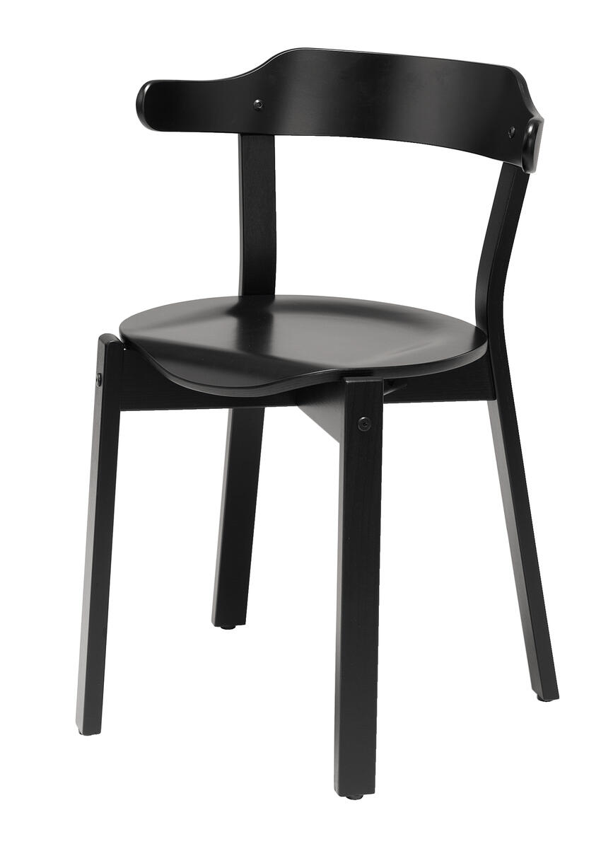 Svartlackerad stapelbar stol (max 6/stapel) och stabil för upphängning. Sitthöjd 45 cm, sittdjup 41 cm och totalbredd 50 cm. Vikt 4,5 kg. Sits i formpressad fanér.