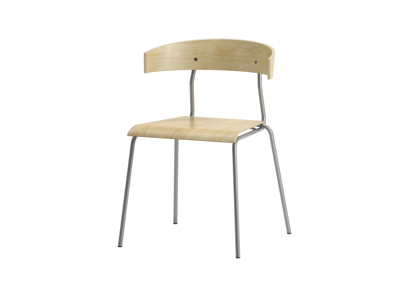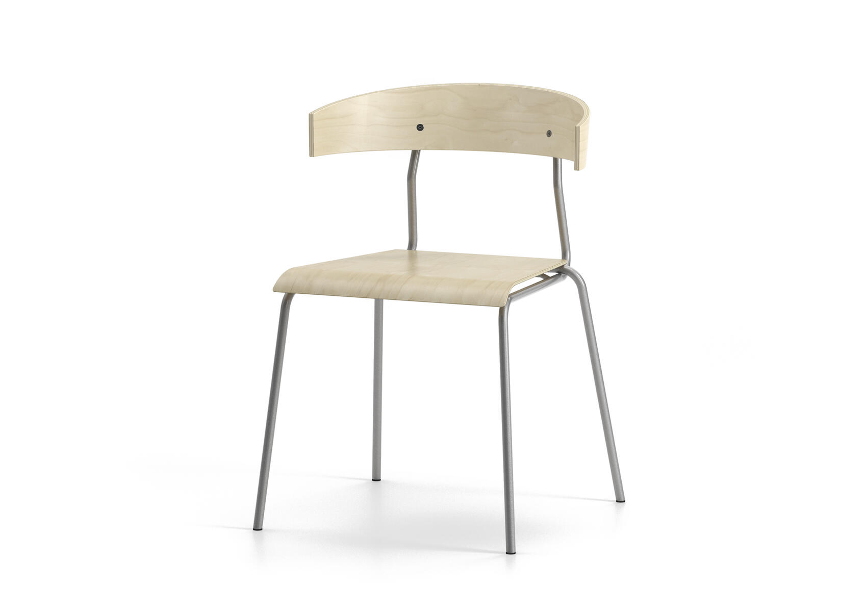 Stapelbar stol (max 8/stapel) och stabil för upphängning. Tysta tassar. Sittbredd 38,5 cm, sittdjup 38 cm och sitthöjd 43 cm. Vikt 3,75 kg. Sits och rygg i högtryckslaminat med silverlackerat stativ, RAL 9006. Testad och godkänd för offentlig miljö enligt gällande Europakrav.