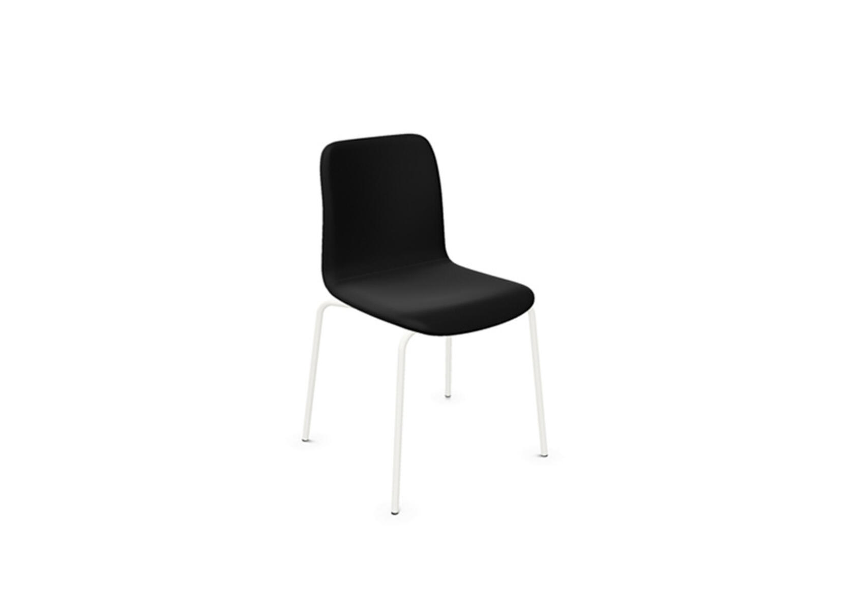 Sittskal i formpressad plywood klädd med kallskum, vilket ger både komfort och stöd. Stabilt pulverlackat stativ av ø 18 mm rör med möbeltassar för att skydda golvet. Fotstöd placerat 34 cm från golv. Maxvikt 110 kg. Stolen är ej stapelbar.
